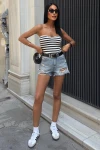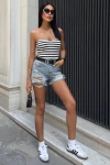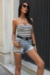 Kadın Beyaz Siyah Düz Kolsuz Triko Straplez Crop