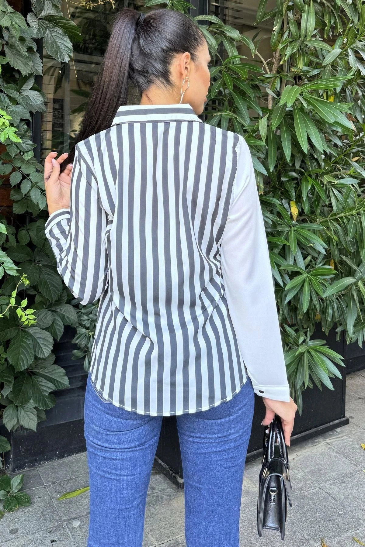 Kadın Beyaz & Siyah İki Renkli Çizgili, Uzun Kol,Regular Kesim Gömlek
