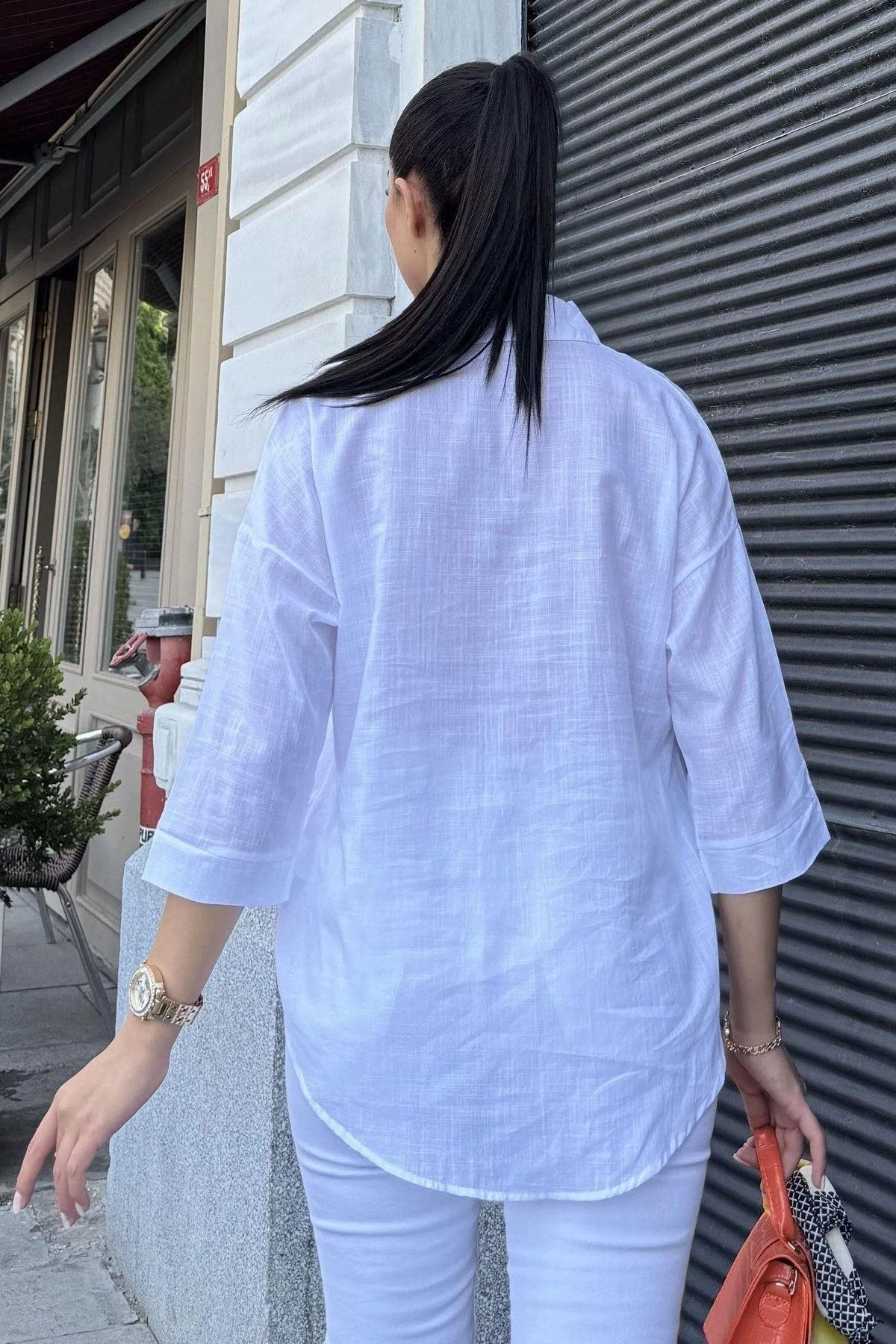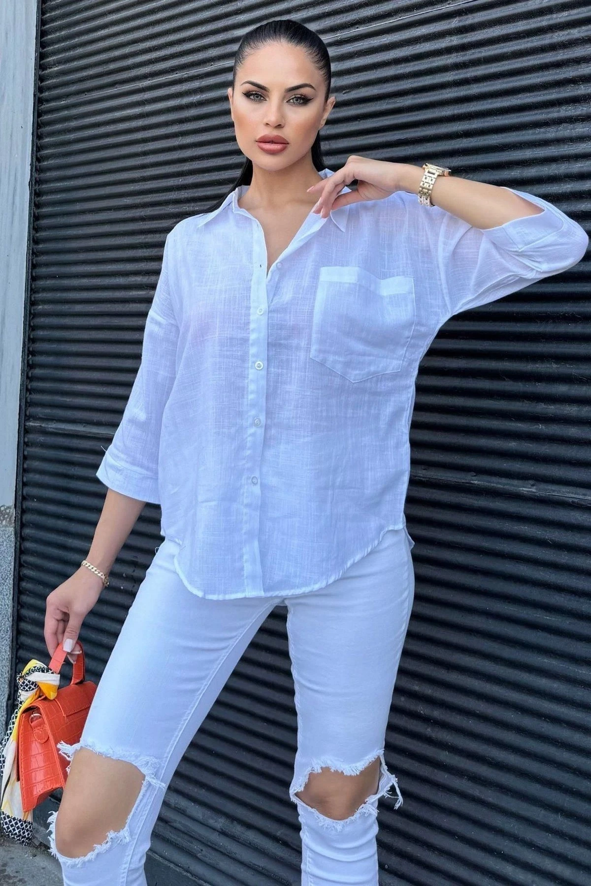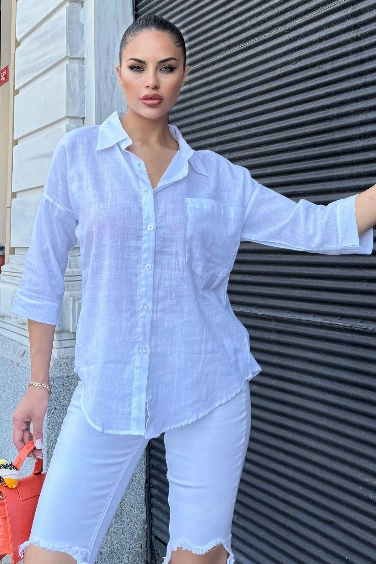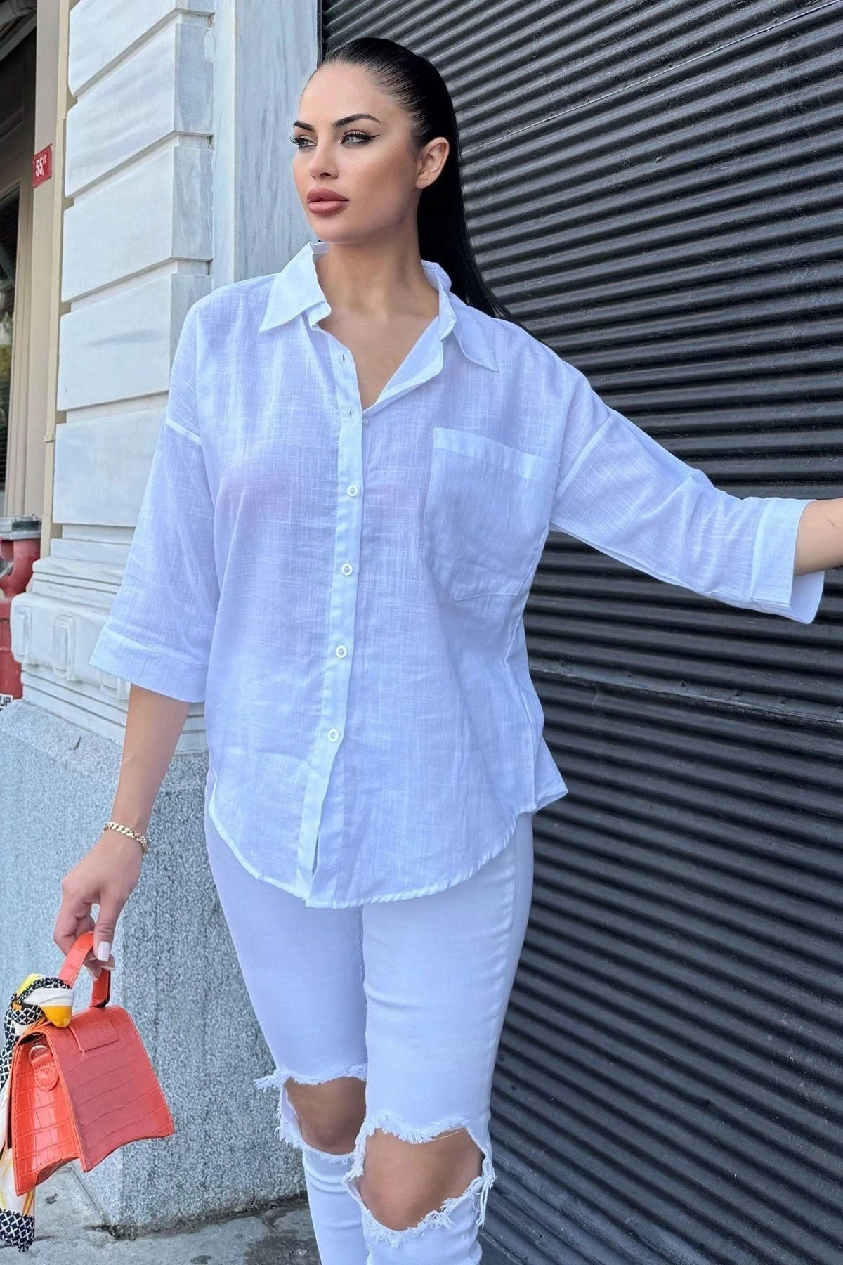 Kadın Beyaz Truvakar Kol, Oval Kesim, Terletmez, Flamlı Keten Salaş Gömlek