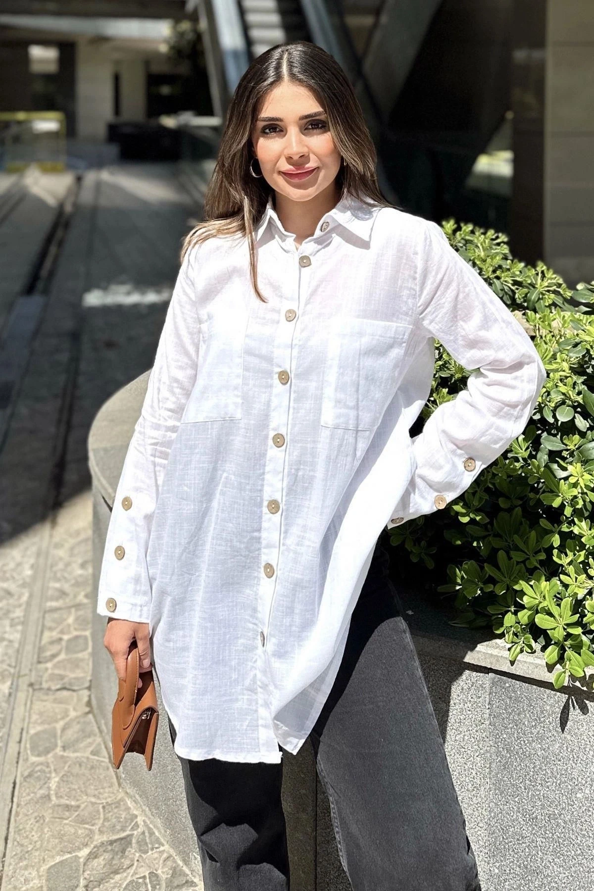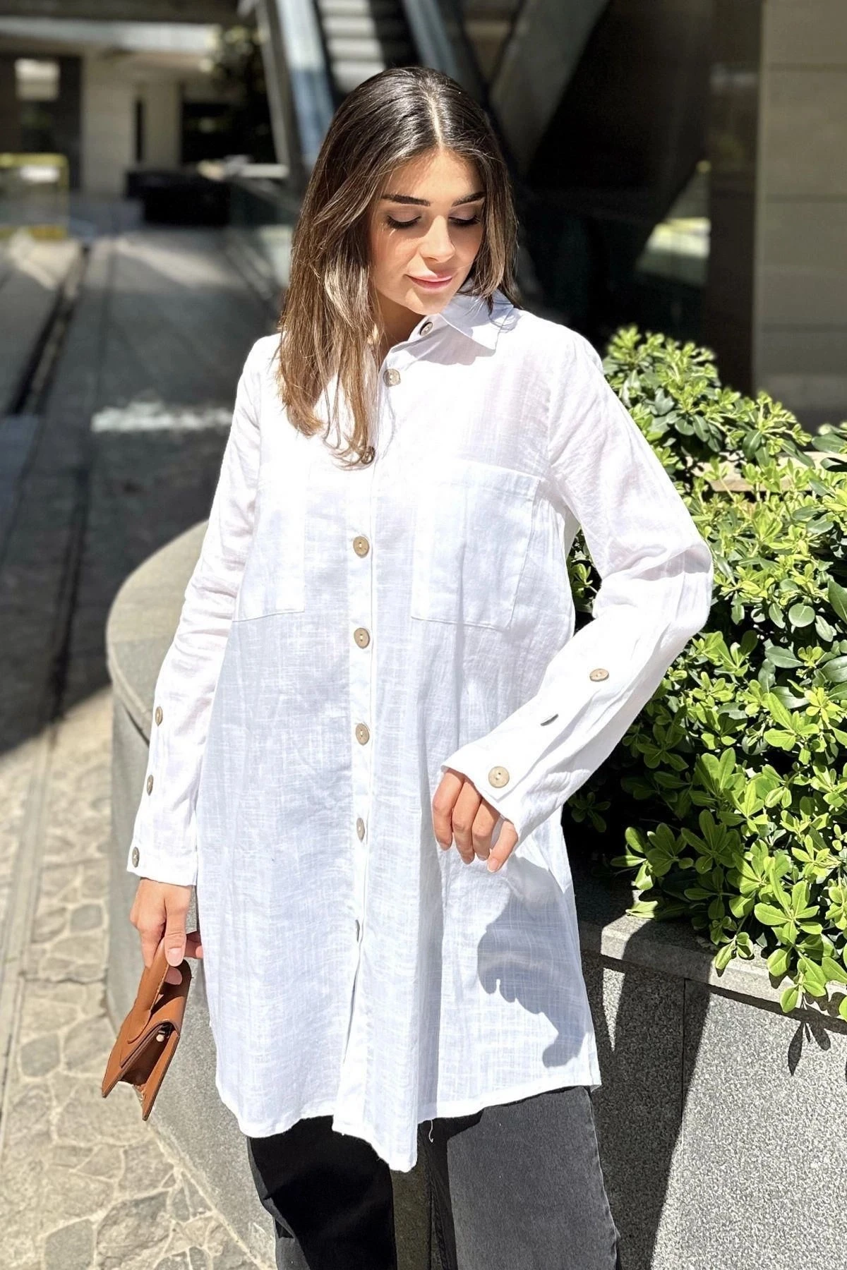 Kadın Beyaz Uzun Kol, Ahşap Düğme Detaylı, Arkası Pliseli, Salaş Ve Uzun, Pamuklu Tunik Gömlek