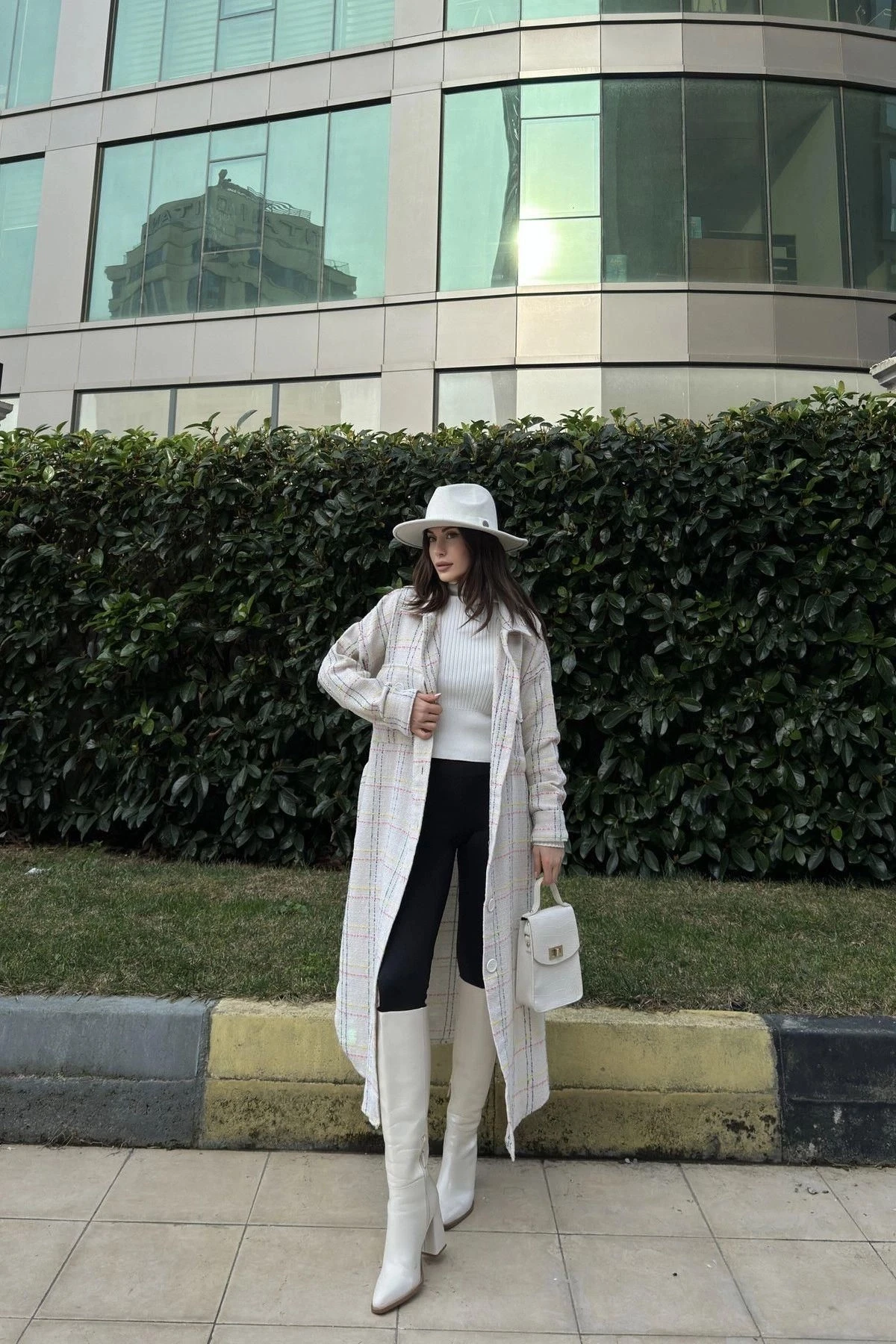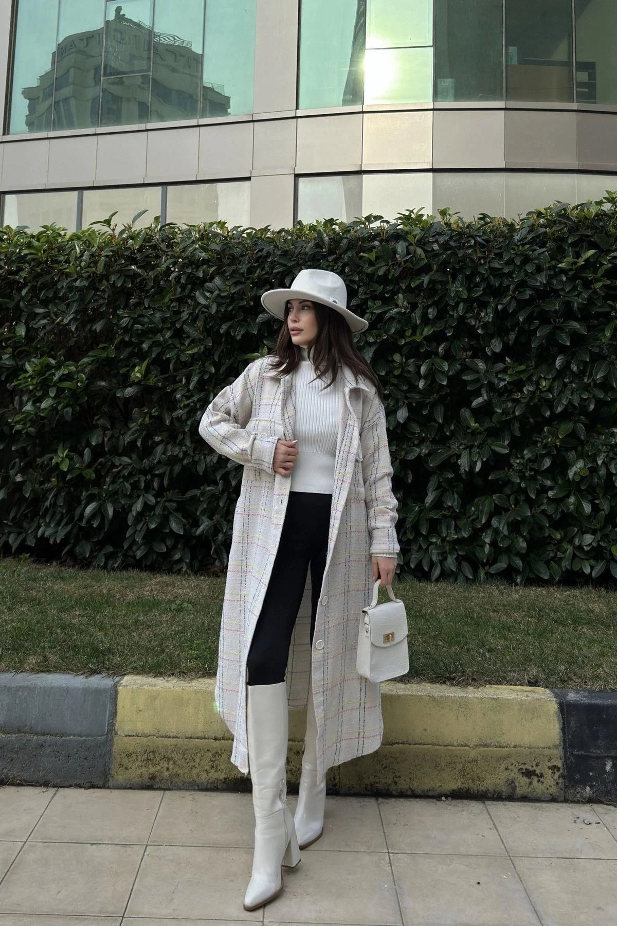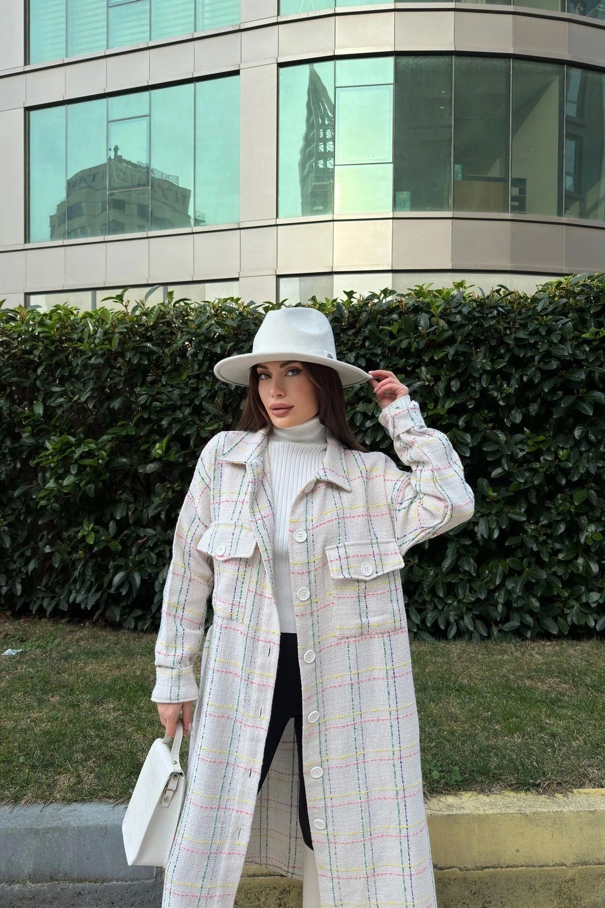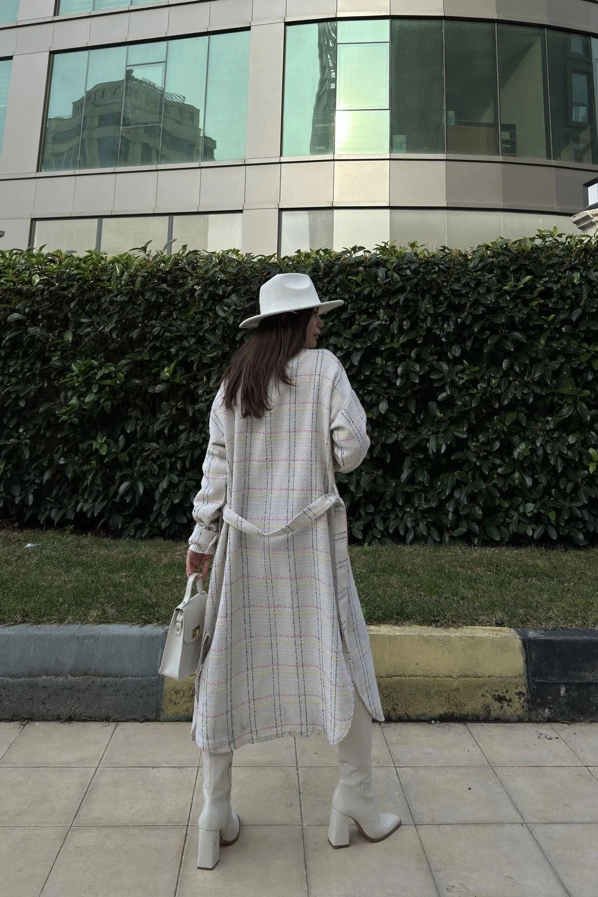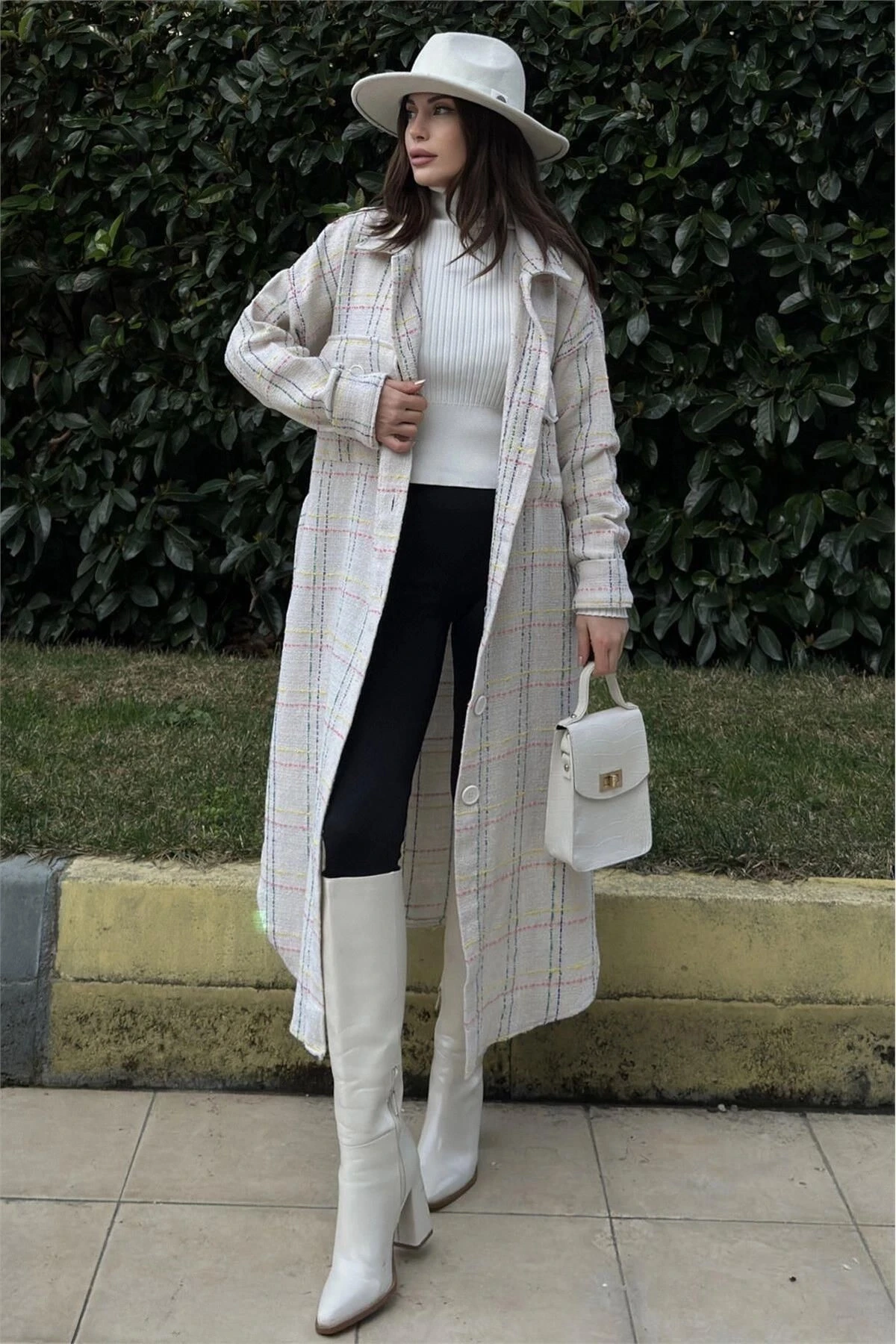Kadın Beyaz Uzun Kol, Çift Cepli, Eteği Oval Kesim, Kemerli, Tüvit Kumaş Trençkot