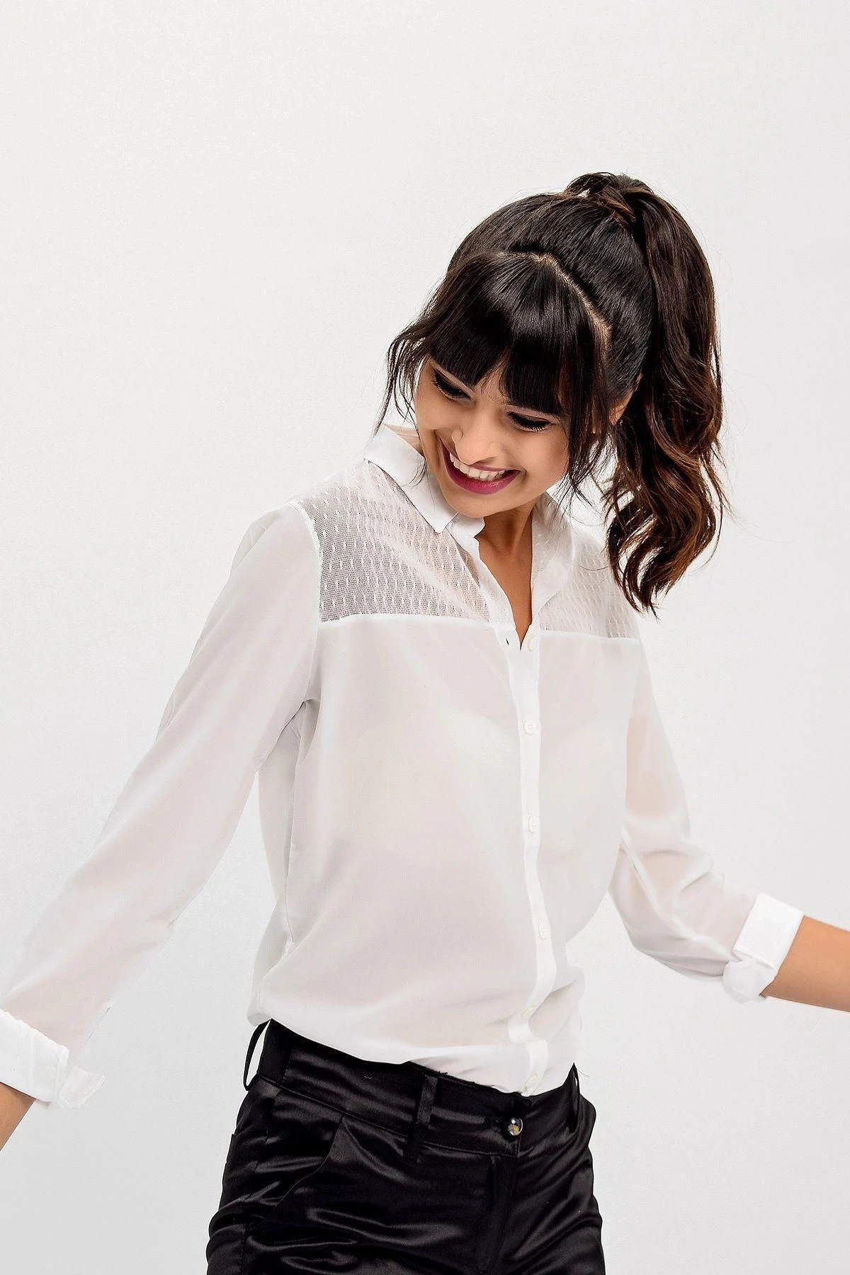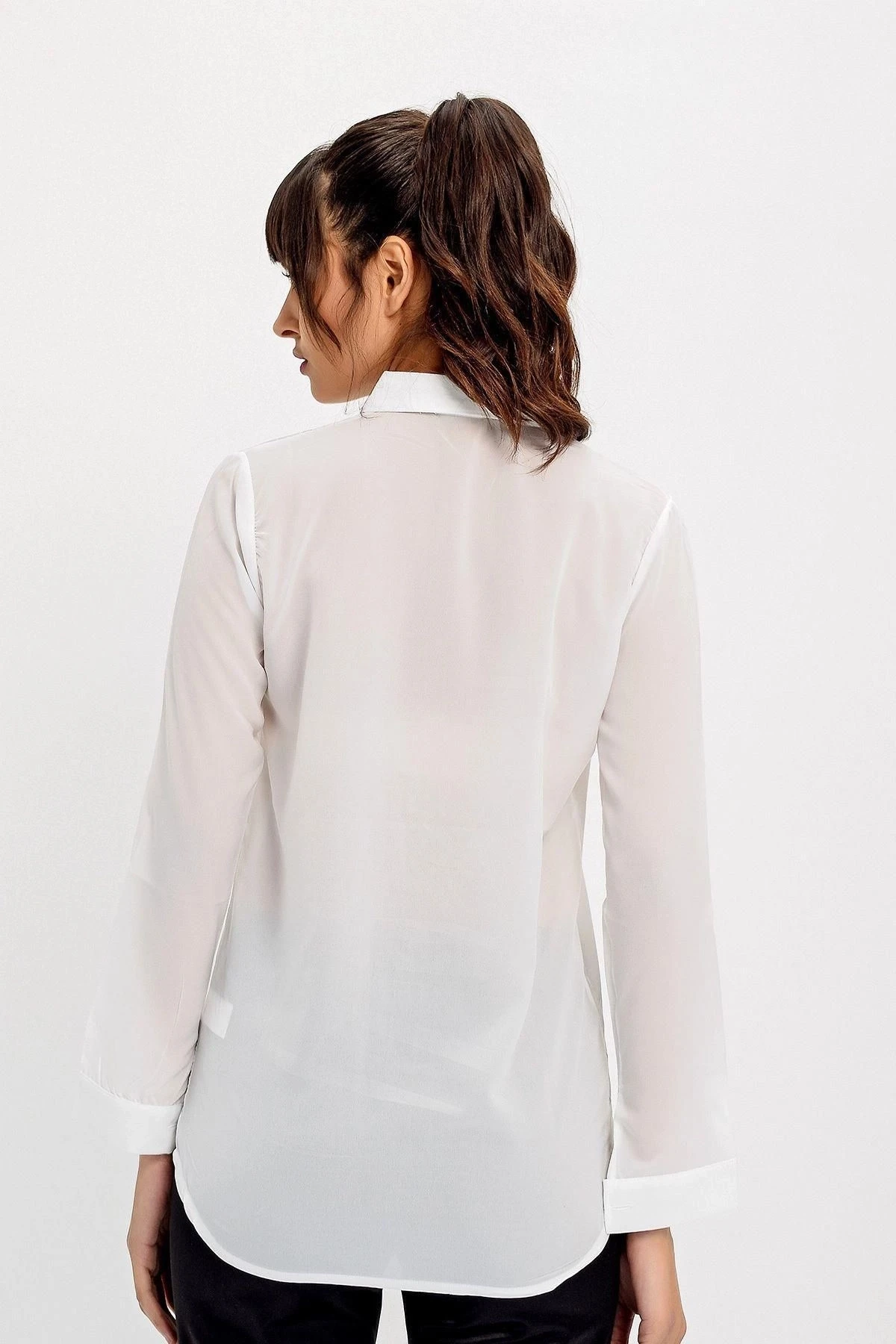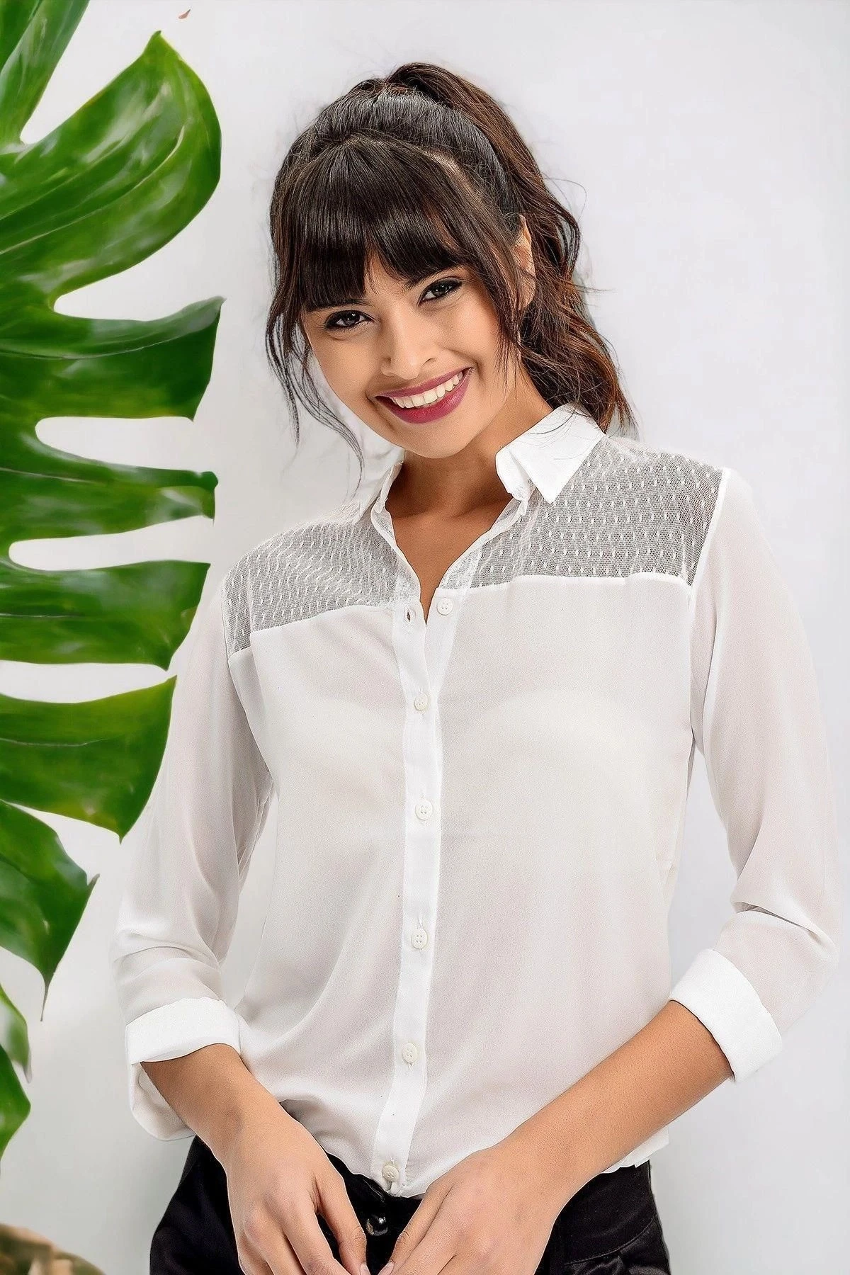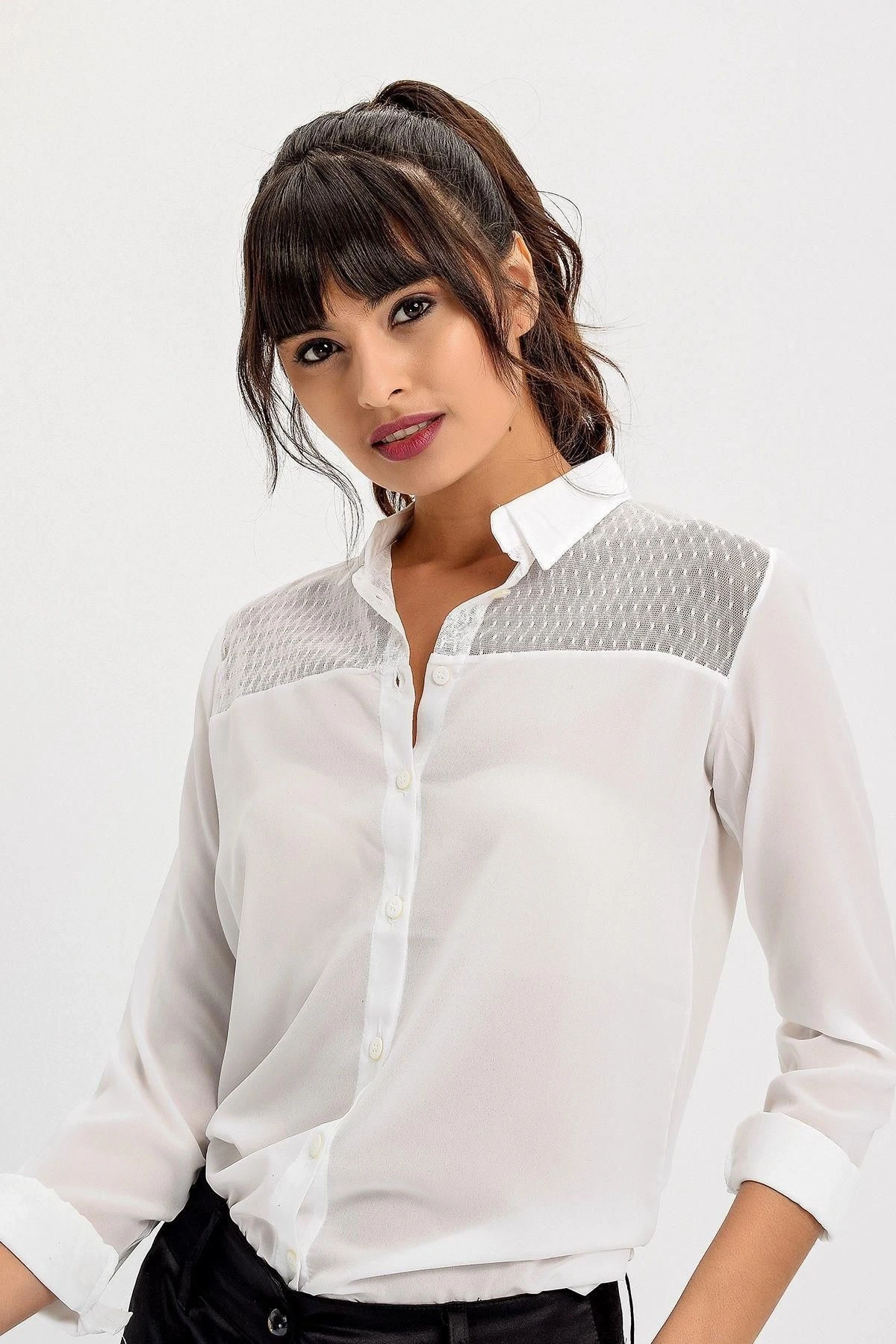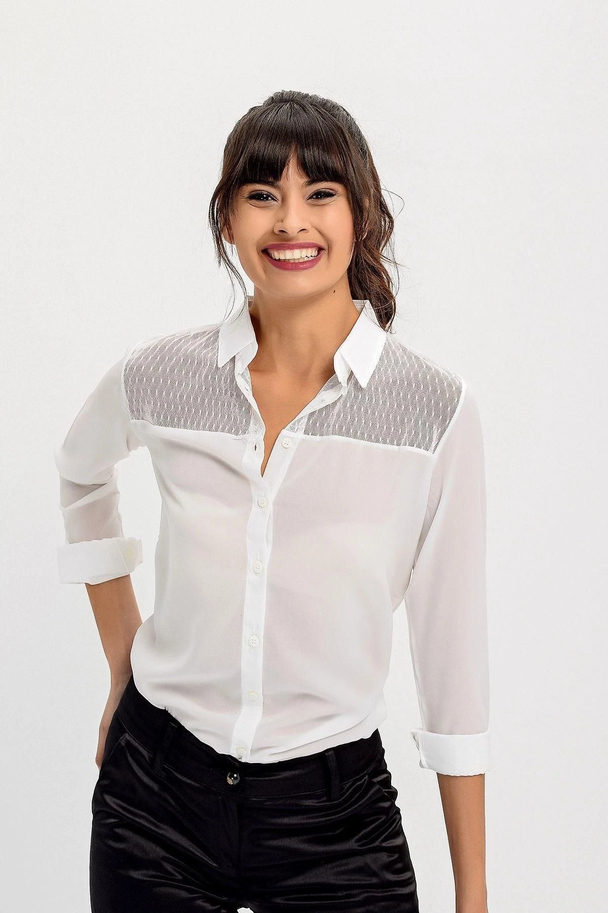 Bu beyaz renkli gömlek, uzun kollu bir tasarıma sahiptir ve klasik bir yakaya sahiptir.; Gömleğin detayları arasında zarif dantel işlemeler bulunur.; Regular kesim, rahat bir uyum sağlar ve standart bir boyda tasarlanmıştır.; Bu gömleğin kumaş içeriği %60 polyester ve %40 pamuk kombinasyonundan oluşur.; Polyester, dayanıklılığı ve şeklini koruma özelliği ile bilinirken, pamuk ise nefes alabilme ve cilt dostu bir özelliğe sahiptir.; Bu kumaş kombinasyonu, gömleği hem rahat hem de şık kılar.; Beyaz renk, gömleğin klasik ve zarif bir görünüme sahip olmasını sağlar.; Bu renk, her türlü kombinasyona uyum sağlayabilir ve şıklık katmak için mükemmeldir.; Gömleğin kalıbı, her bedene uyum sağlayacak şekilde tasarlanmıştır ve çeşitli beden tiplerine uyum sağlar.; Dantel detayları, bu gömleği özel kılar.; İşlemeler, gömleğe zarif bir dokunuş katarak dikkat çekici bir görünüm sunar.; Bu detaylar, gömleği daha feminen ve şık hale getirir.; Bu gömlek, herhangi bir şık etkinlikte veya günlük kullanımda mükemmel bir seçenektir.; Kombinasyonlarınızı tamamlamak için pantolonlar, etekler veya şortlarla kolayca uyum sağlayabilir.; Hem rahatlığı hem de şıklığı bir araya getiren bu gömlek, gardırobunuzun vazgeçilmez bir parçası olacak.