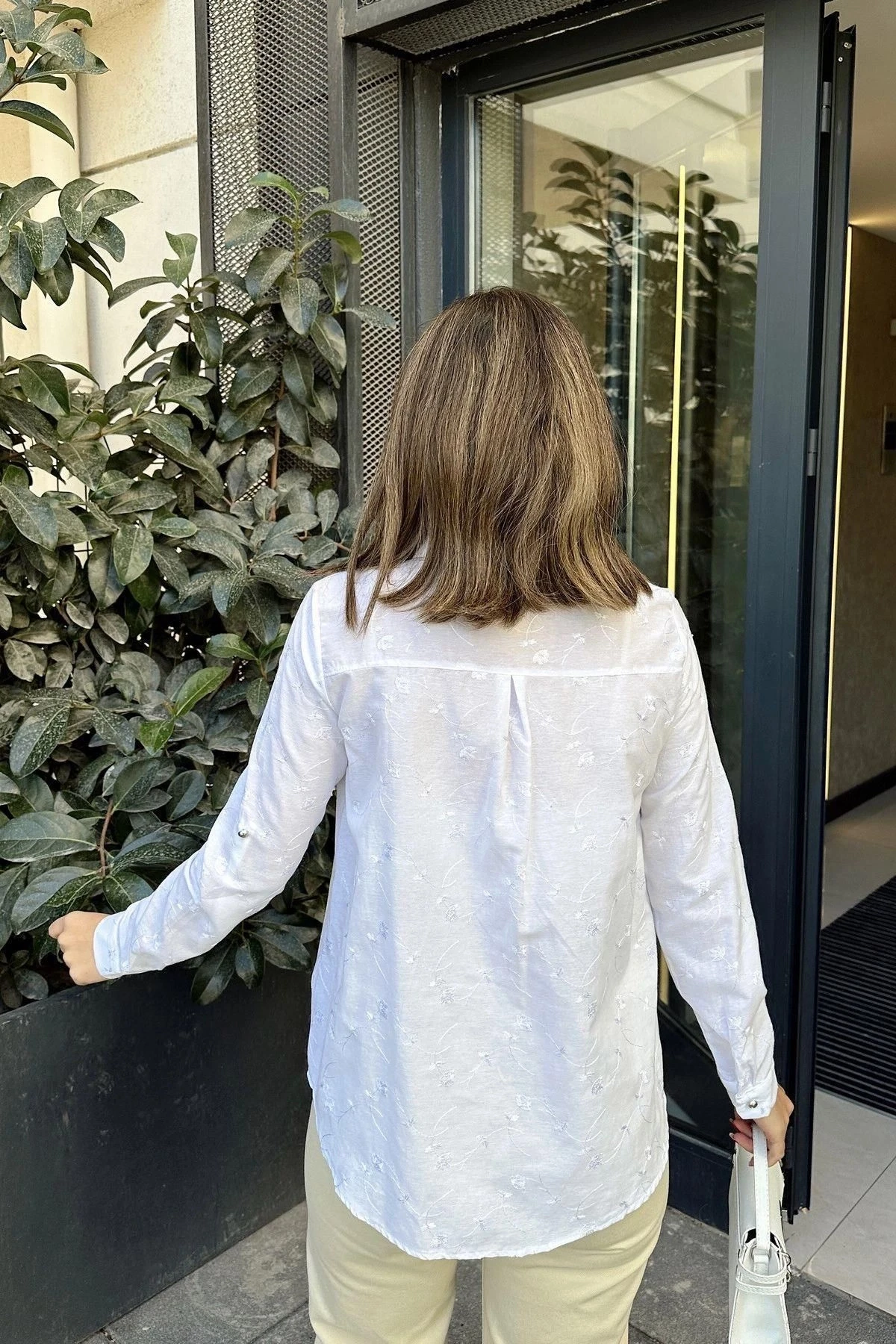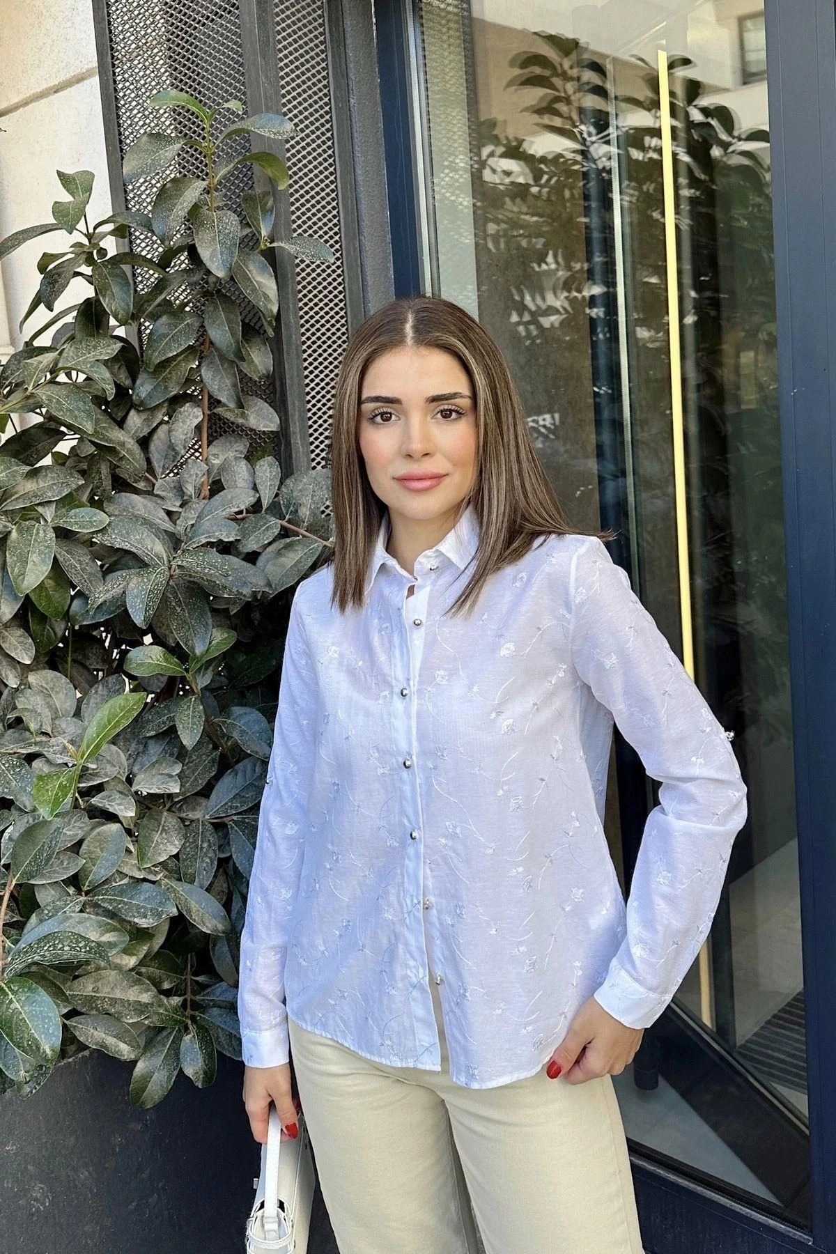 Kadın Beyaz Uzun Kol, Silver Düğme Detaylı, Nakış İşlemeli, Klasik Gömlek