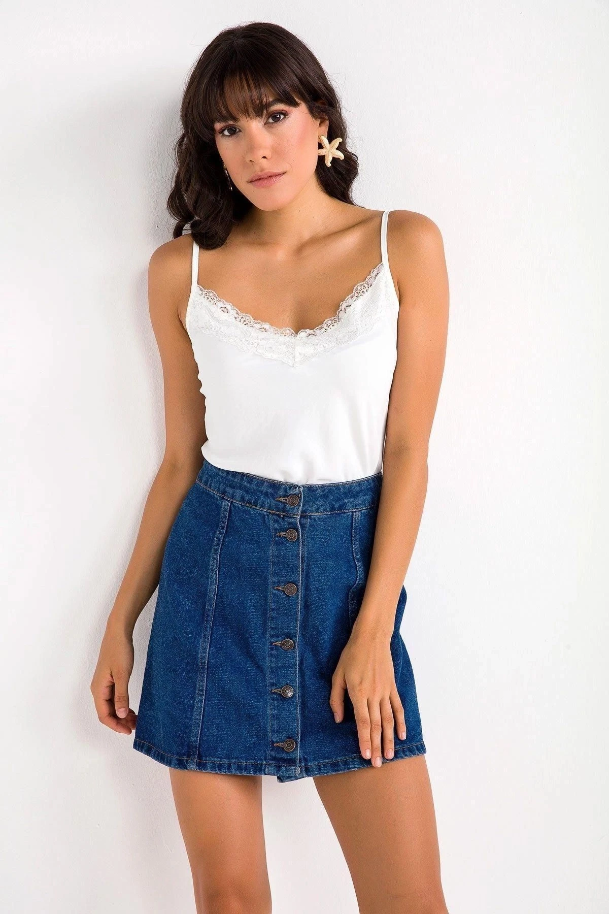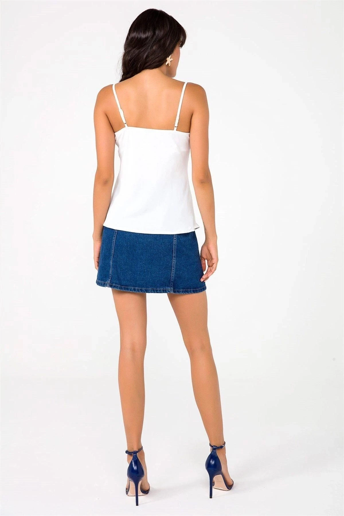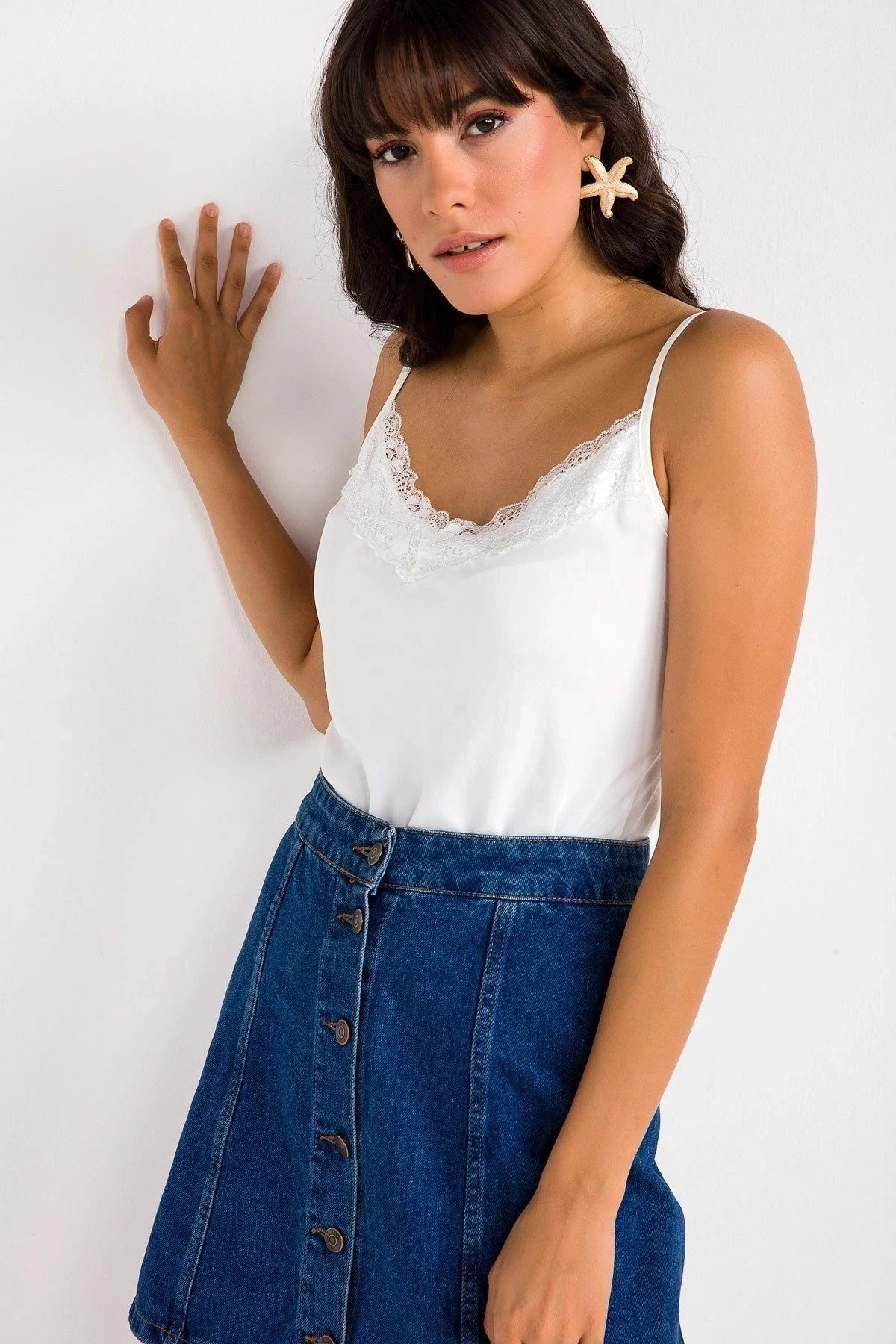 Kadın Beyaz V Yaka, Askılı Kol, Dantel Detaylı, Regular Kesim, Standart Boy Bluz