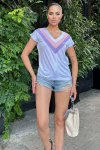 Kadın Beyaz V Yaka, Kısa Kol, Color Block Detaylı, Terletmez Dokulu Kumaş, Salaş Bluz, Tshirt