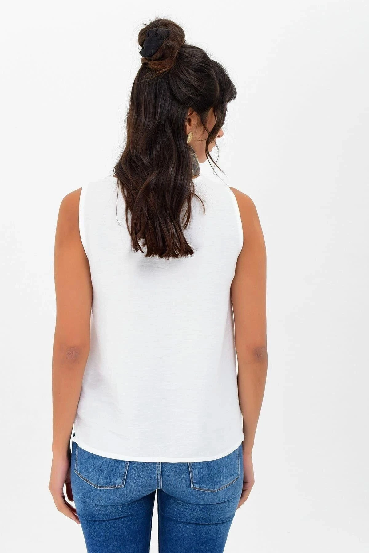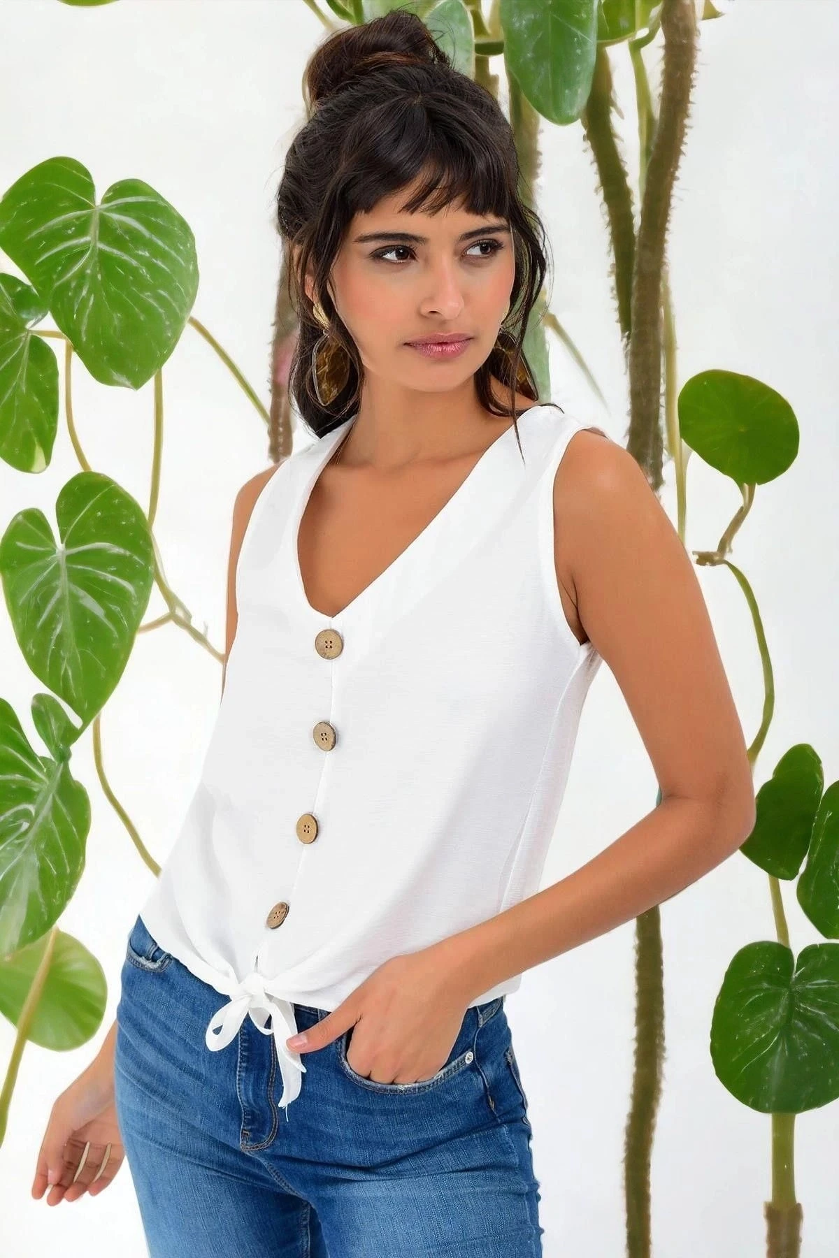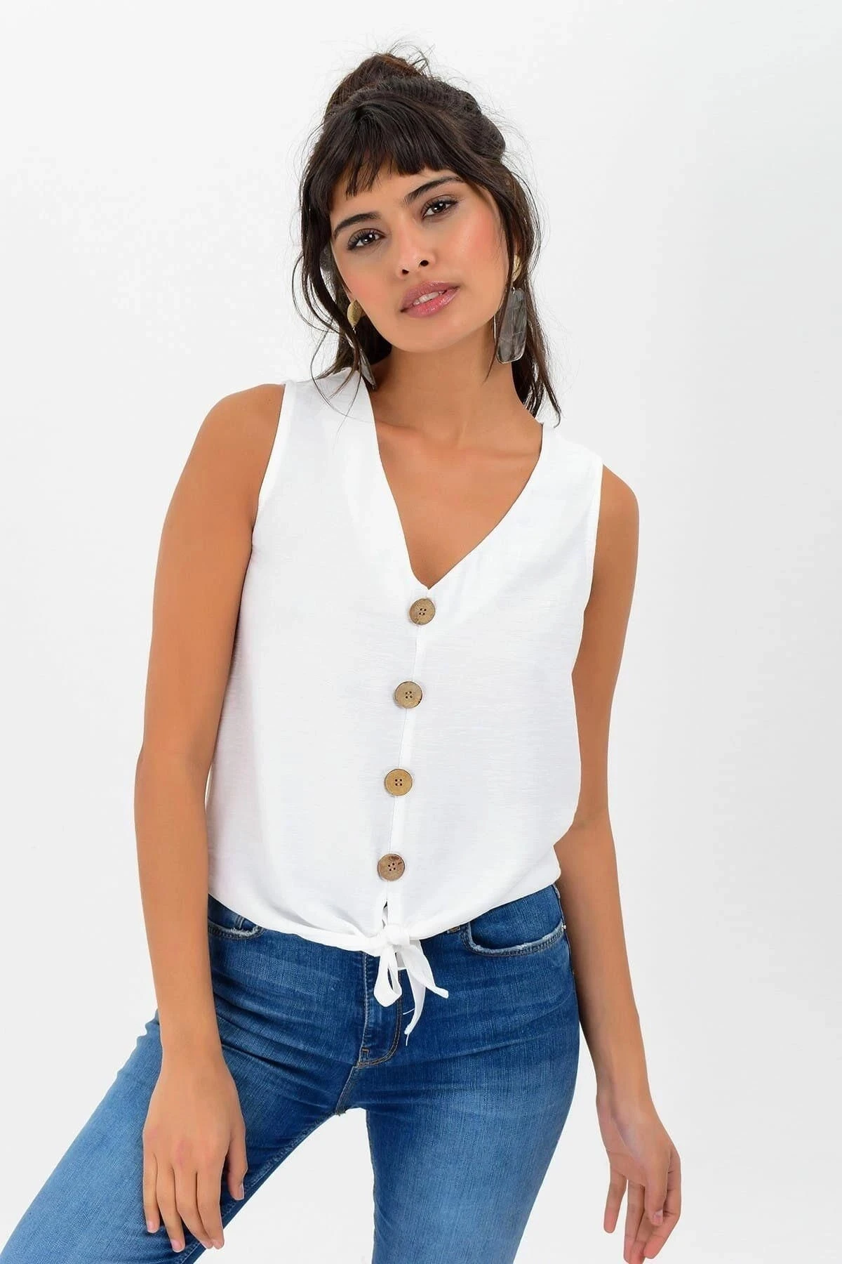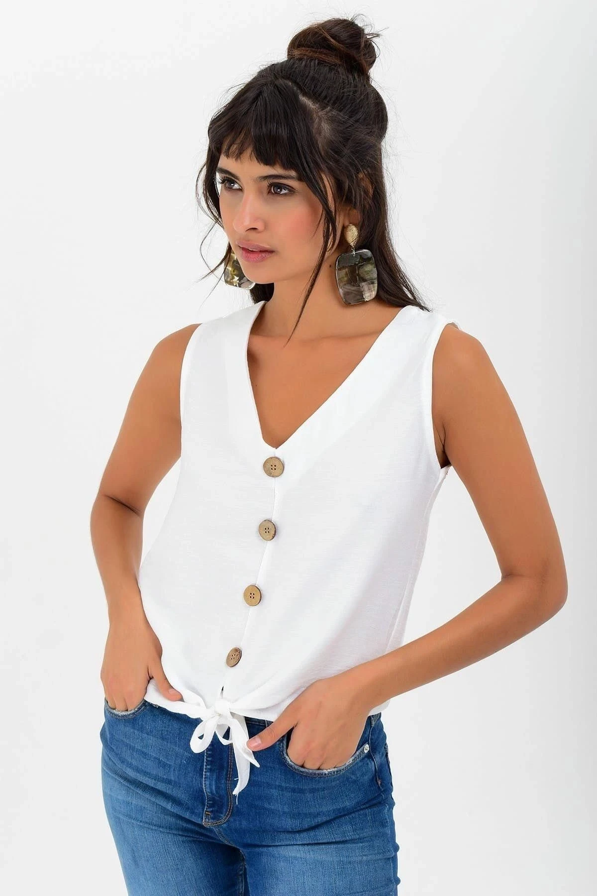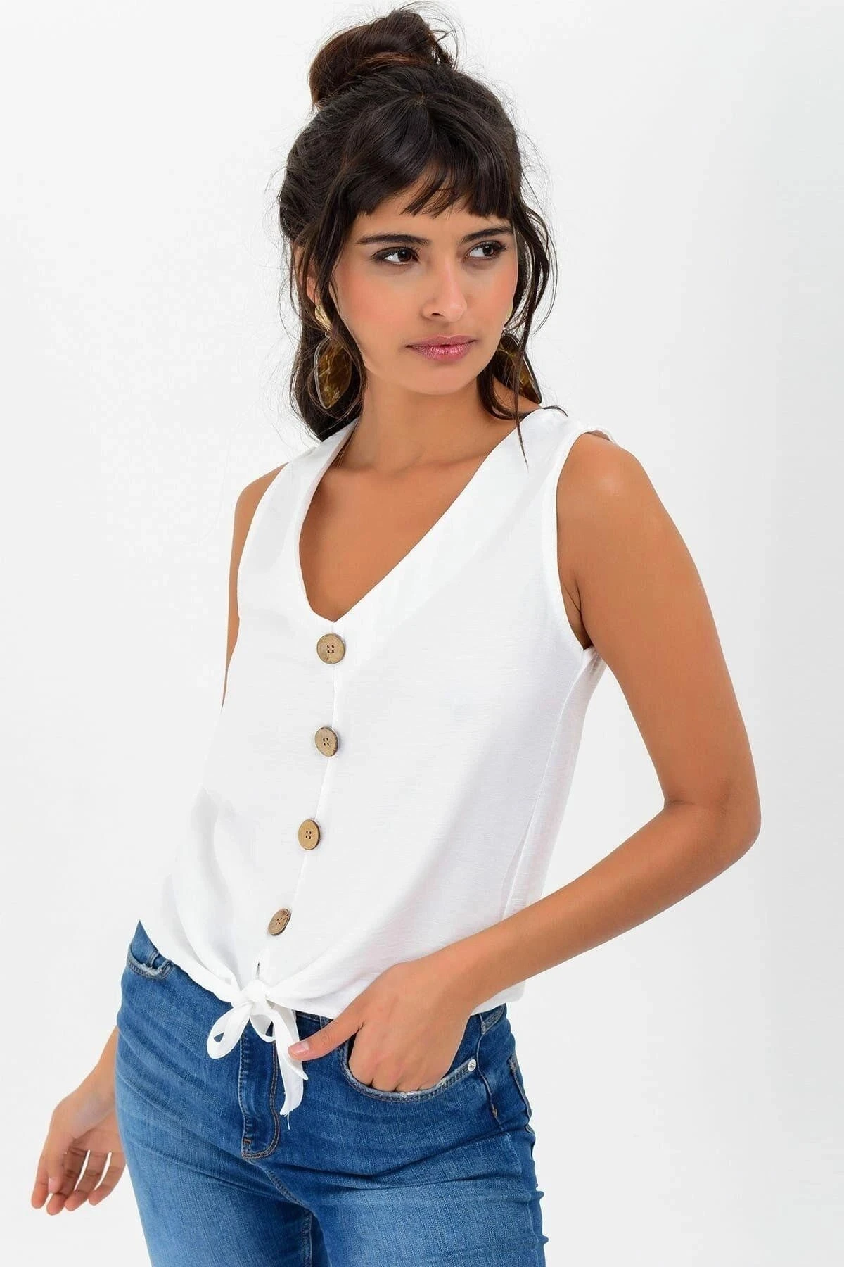 Kadın Beyaz V Yaka Sıfır Kol Düğme Detaylı, Bağlamalı Regular Kesim Standart Boy Bluz