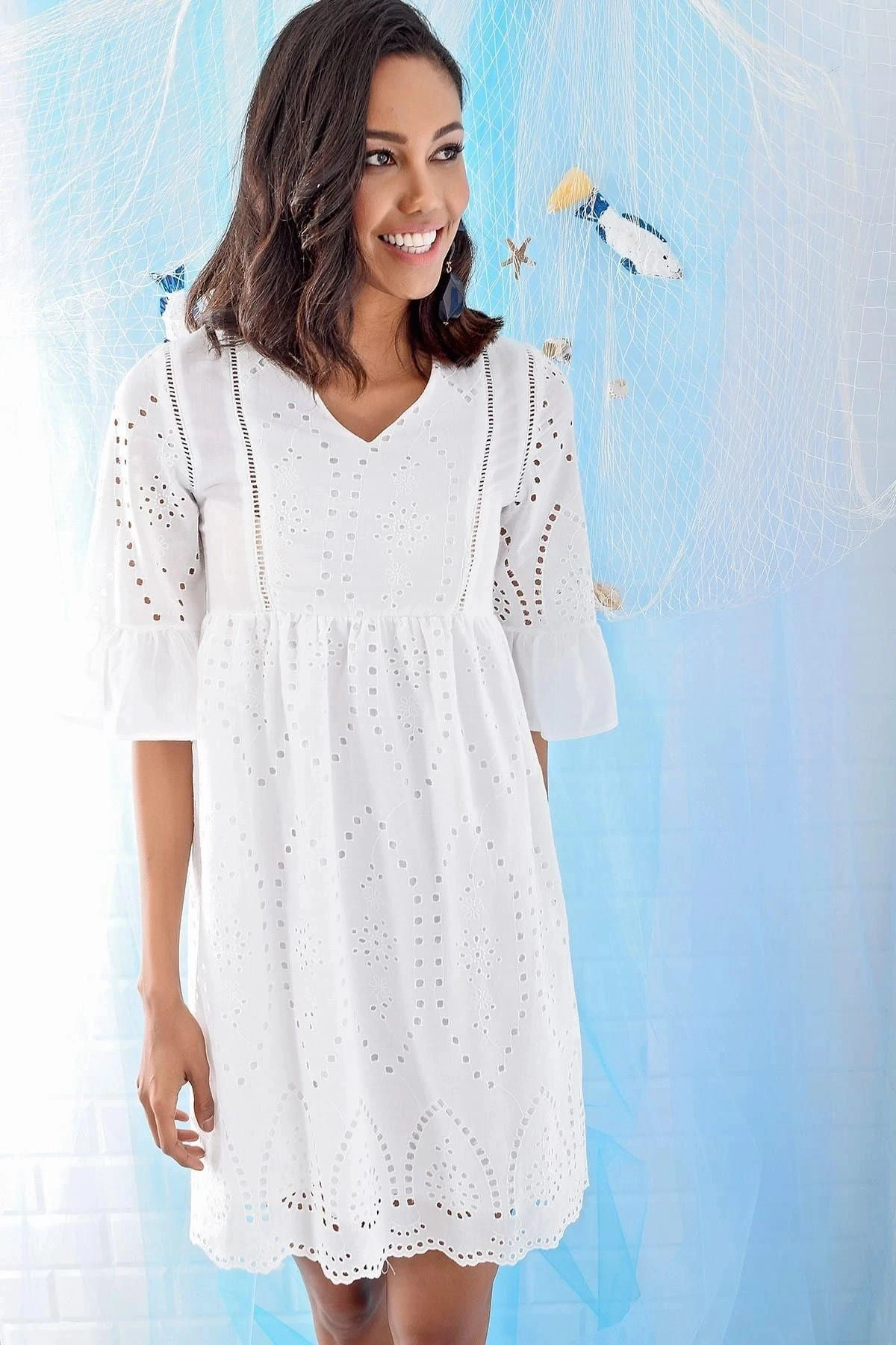 Kadın Beyaz V Yaka Truvakar Kol Fıstıklı Regular Kesim Midi Boy Diz üstü Elbise