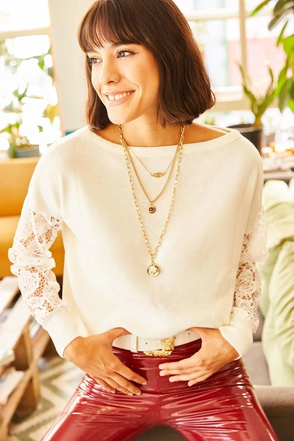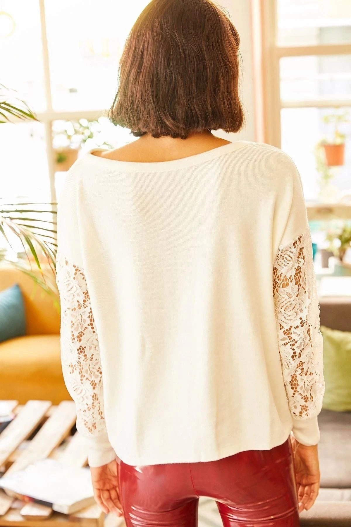 Bu beyaz renkli triko, zarif dantel detayları ve şık yuvarlak yaka tasarımıyla öne çıkan bir parçadır.; Uzun kollu kesimi, oversize tarzıyla rahat ve modern bir görünüm sunar.; Kaliteli kumaşı, %95 viskoz ve %5 elastan içeriğiyle yumuşaklık, esneklik ve dayanıklılık sağlar.; Bu triko, her mevsimde giyilebilecek çok yönlü bir seçenektir.; Beyaz renk, şıklık ve zarafetin simgesidir, herhangi bir stil veya kombinle mükemmel uyum sağlar.; Yuvarlak yaka tasarımı, her yüz şekliyle uyumlu olup, her durumda zarif bir görünüm sunar.; Dantel detayları, bu trikoya zarif bir dokunuş katar.; İnce işçilikle işlenen dantel desenleri, trikonun şıklığını ve çekiciliğini artırır.; Bu detaylar, trikoya benzersiz bir karakter ve sofistike bir tarz kazandırır.; Oversize kesim, rahat ve ferah bir his yaratırken aynı zamanda şık bir görünüm sunar.; Bu kesim, her bedene uyum sağlayarak her vücut tipinde harika durur.; Ayrıca, trikonun üzerine ekstra katmanlar eklemek veya rahat bir görünüm elde etmek istediğinizde ideal bir seçenektir.; Bu trikonun kumaşı, %95 viskoz ve %5 elastan karışımından oluşur.; Viskoz, yumuşaklık ve konfor sağlarken elastan, esneklik ve şekil tutma özelliği sunar.; Bu kumaş, dayanıklı ve uzun ömürlü olup, giyim deneyiminizi mükemmelleştirir.; Bu beyaz renkli, yuvarlak yaka triko, her kadının gardırobunda olması gereken şık ve çok yönlü bir parçadır.; Kaliteli kumaşı, dantel detayları ve oversize kesimiyle tarzınızı tamamlamak için mükemmel bir seçenektir.; Herhangi bir mevsimde ve herhangi bir durumda kullanabileceğiniz bu triko, şıklık ve rahatlık arayan kadınlar için ideal bir tercihtir.