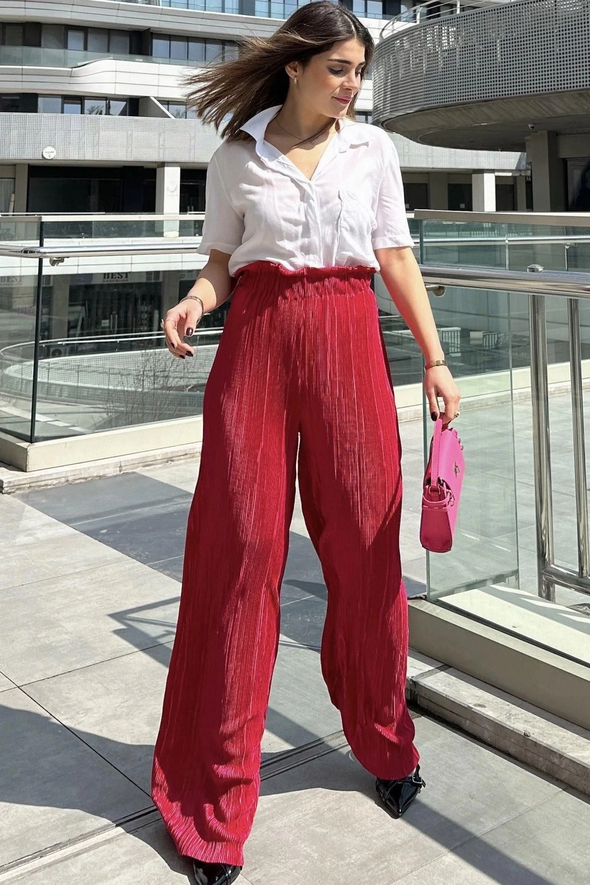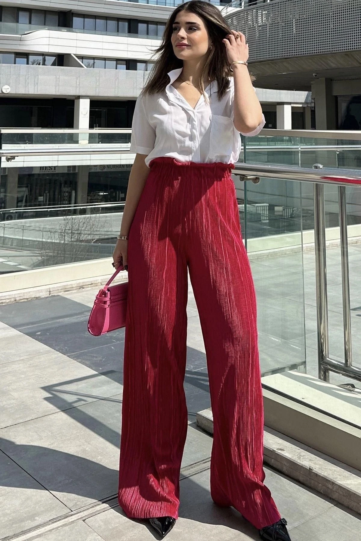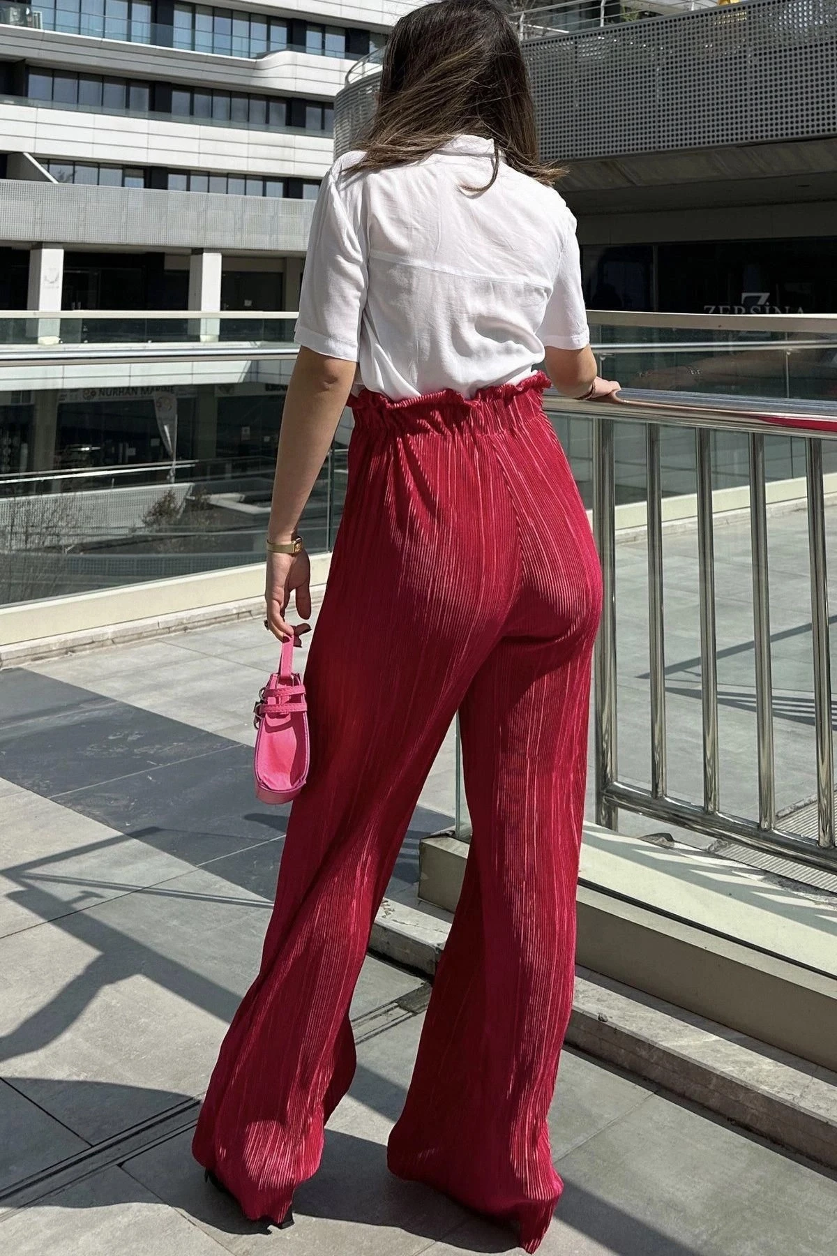 Kadın Bordo Beli Lastikli, Yüksel Bel, Salaş Kesim, Bol Paça Bürümcük Pantolon