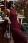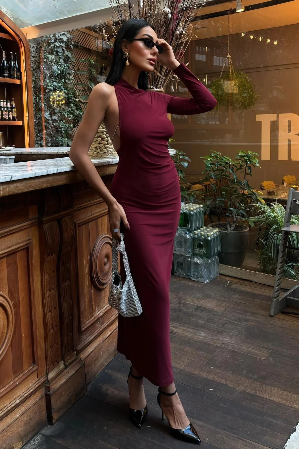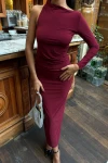 Kadın Bordo Candy Kumaş Uzun Tek Kol Elbise