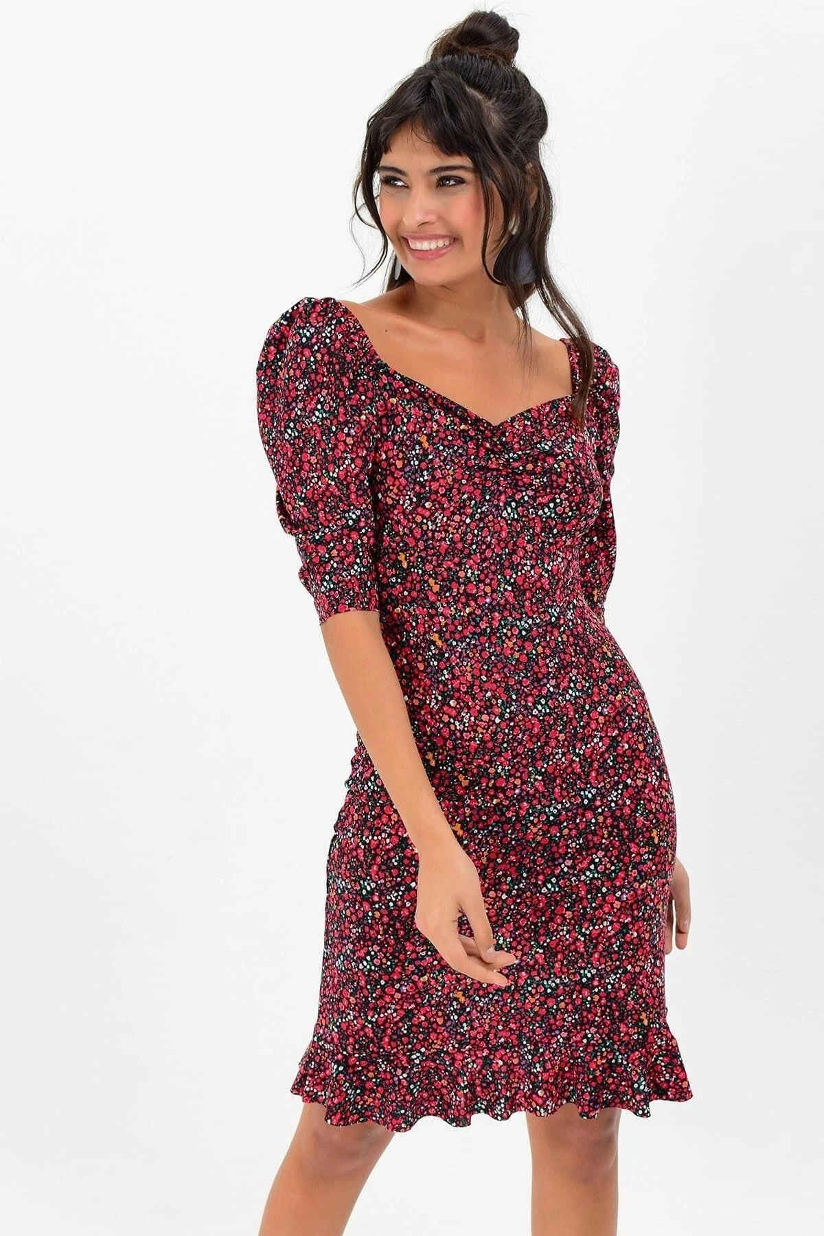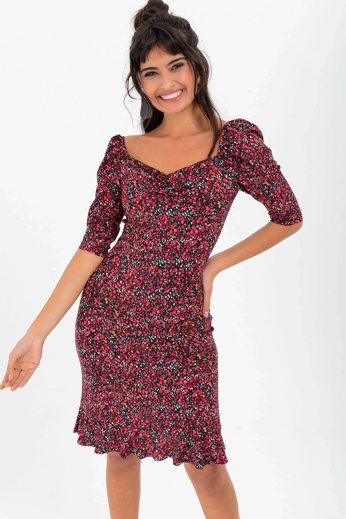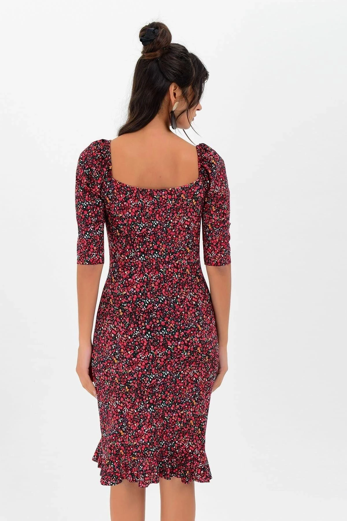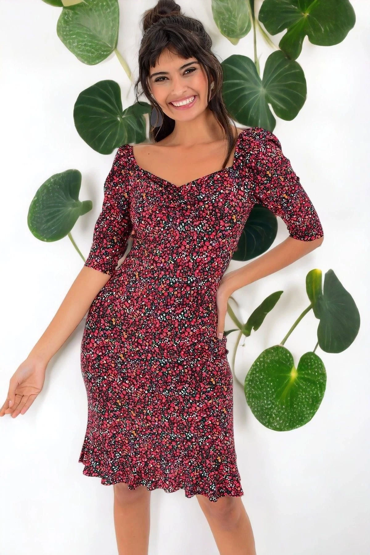 Yeni Bordo Renk Çiçek Desenli Elbisemiz, kusursuz bir kombin için tam da aradığınız parça! Kaliteli kumaşının %50 pamuk ve %50 viskoz karışımıyla üretilmiştir, böylece gün boyu rahatlık ve nefes alabilirlik sağlar.; Bu elbise, body fit kesimi ve midi boyuyla vücudu saran ve zarif bir siluet sunar.; Karpuz kol detayı, zarafeti ve şıklığı bir araya getirirken, kalp yaka tasarımıyla da romantik bir dokunuş ekler.; Truvakar kol stili ise modern bir çizgi katarken, diz üstü uzunluğu ofis ve günlük kullanıma uygun hale getirir.; Bordo rengin asaletini yansıtan çiçek desenleri, elbisenin görünümüne canlılık ve feminen bir hava katar.; Bu desenler, kumaşın üzerinde mükemmel bir uyum sağlar ve elbiseye sofistike bir görünüm kazandırır.; Kaliteli kumaş yapısı, dayanıklılık ve konforu bir araya getirirken, cildinizle uyumlu bir dokunuş sunar.; %50 pamuk, elbisenin yumuşaklık ve nefes alabilirlik sağlarken, %50 viskoz ise kumaşın hafif ve akıcı olmasını sağlar.; Bu elbise, iş yerinde veya günlük yaşamda şıklığınızı ve stilinizi öne çıkarmanız için mükemmel bir seçenektir.; Ofis ortamında diz üstü boyuyla profesyonel bir görünüm sunarken, günlük kullanımda da şık ve rahat bir seçim olacaktır.; Bordo Renk Çiçek Desenli Elbisemiz, tasarımı ve kumaş kalitesiyle öne çıkan bir parça.; Siz de şıklığınızı ve tarzınızı bu muhteşem elbiseyle taçlandırın!