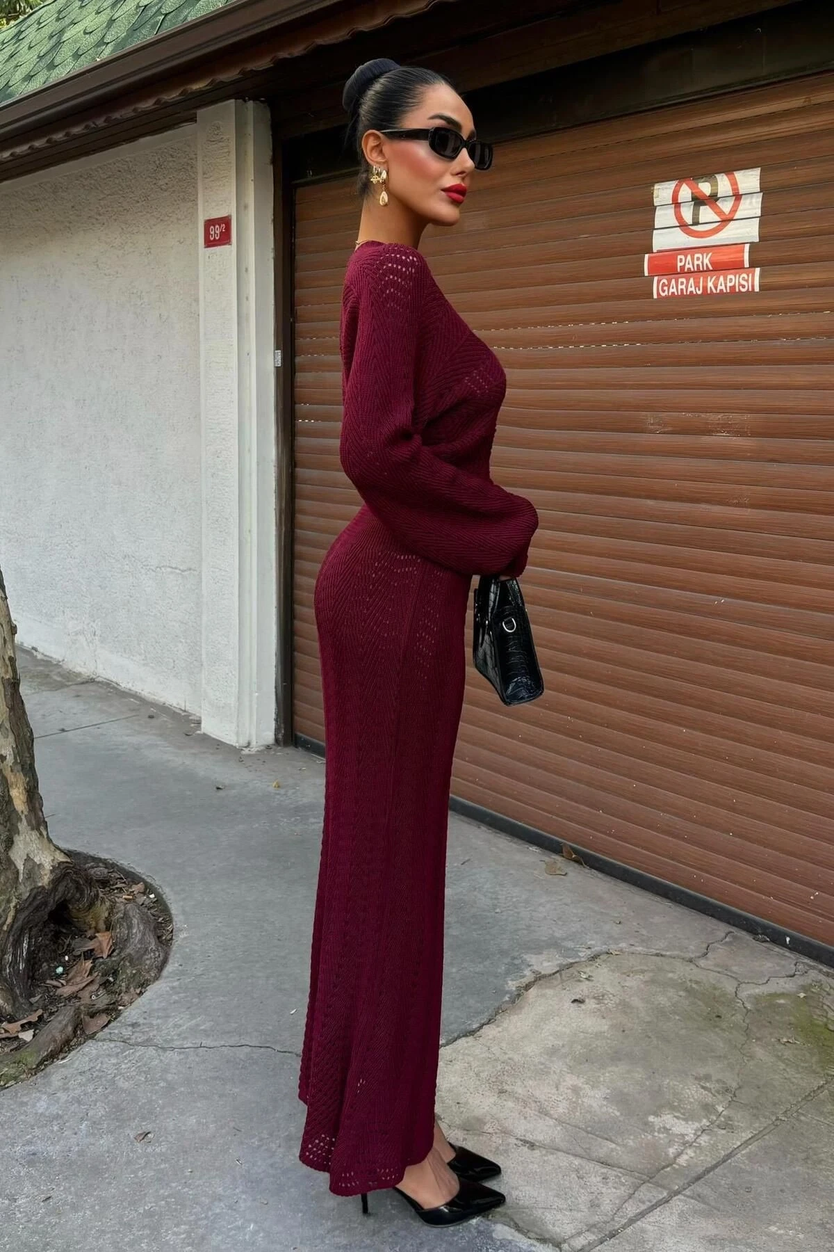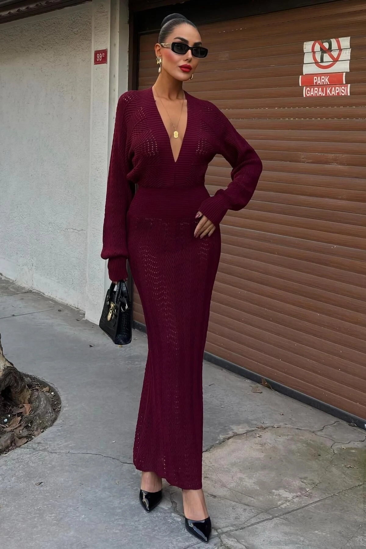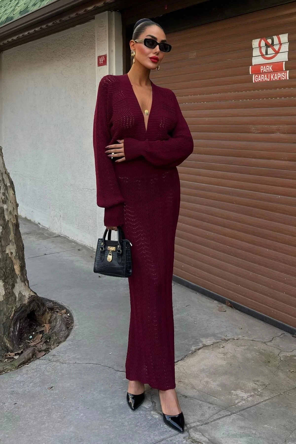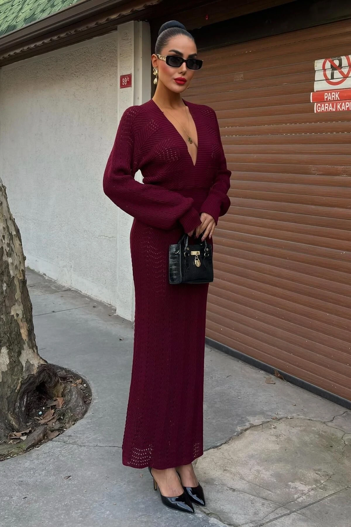 Kadın Bordo Çizgili Akrilik Uzun V Yaka Elbise