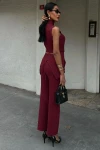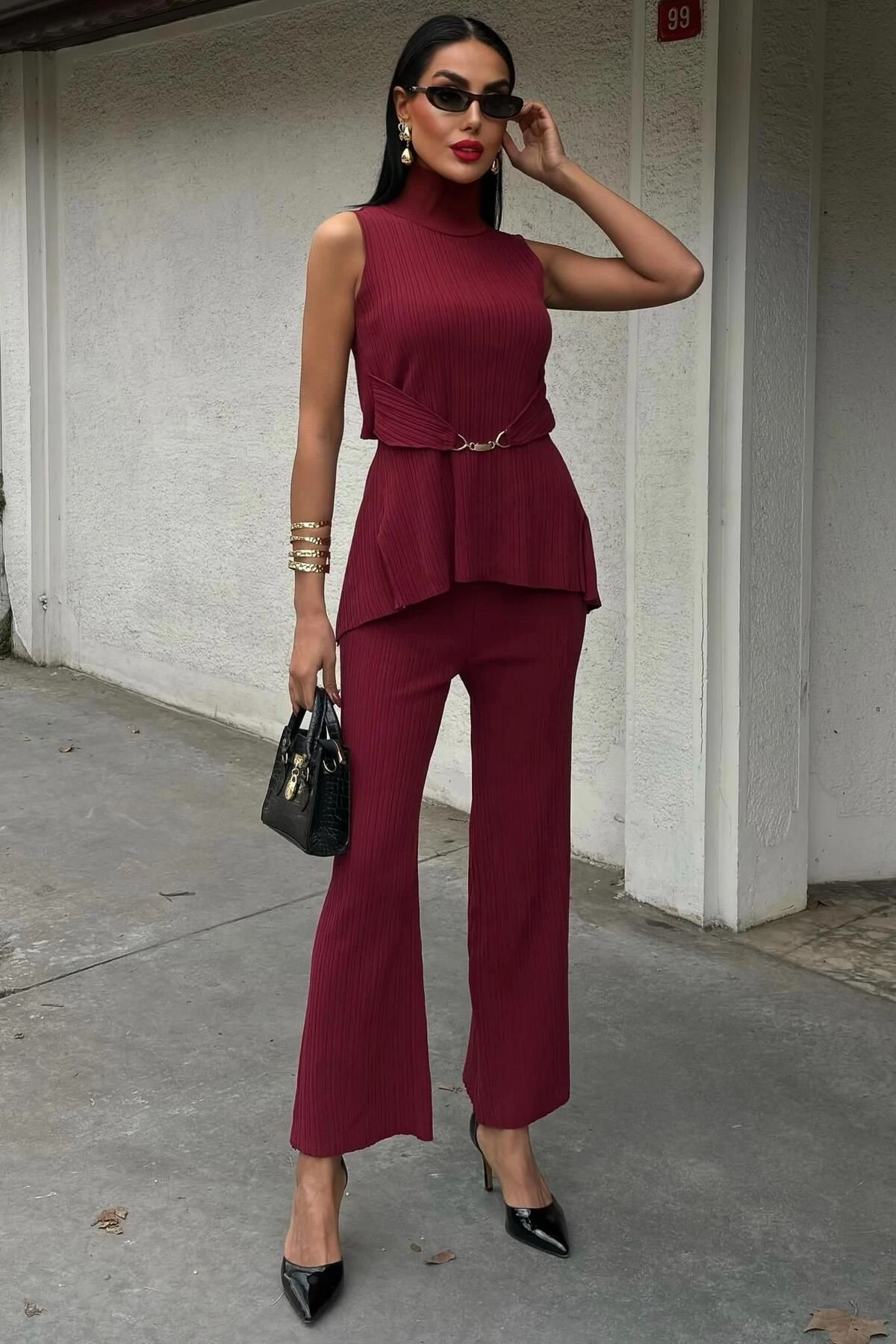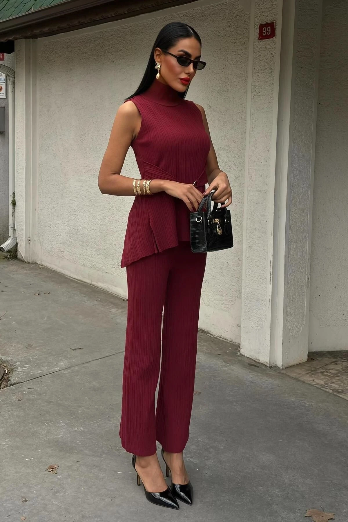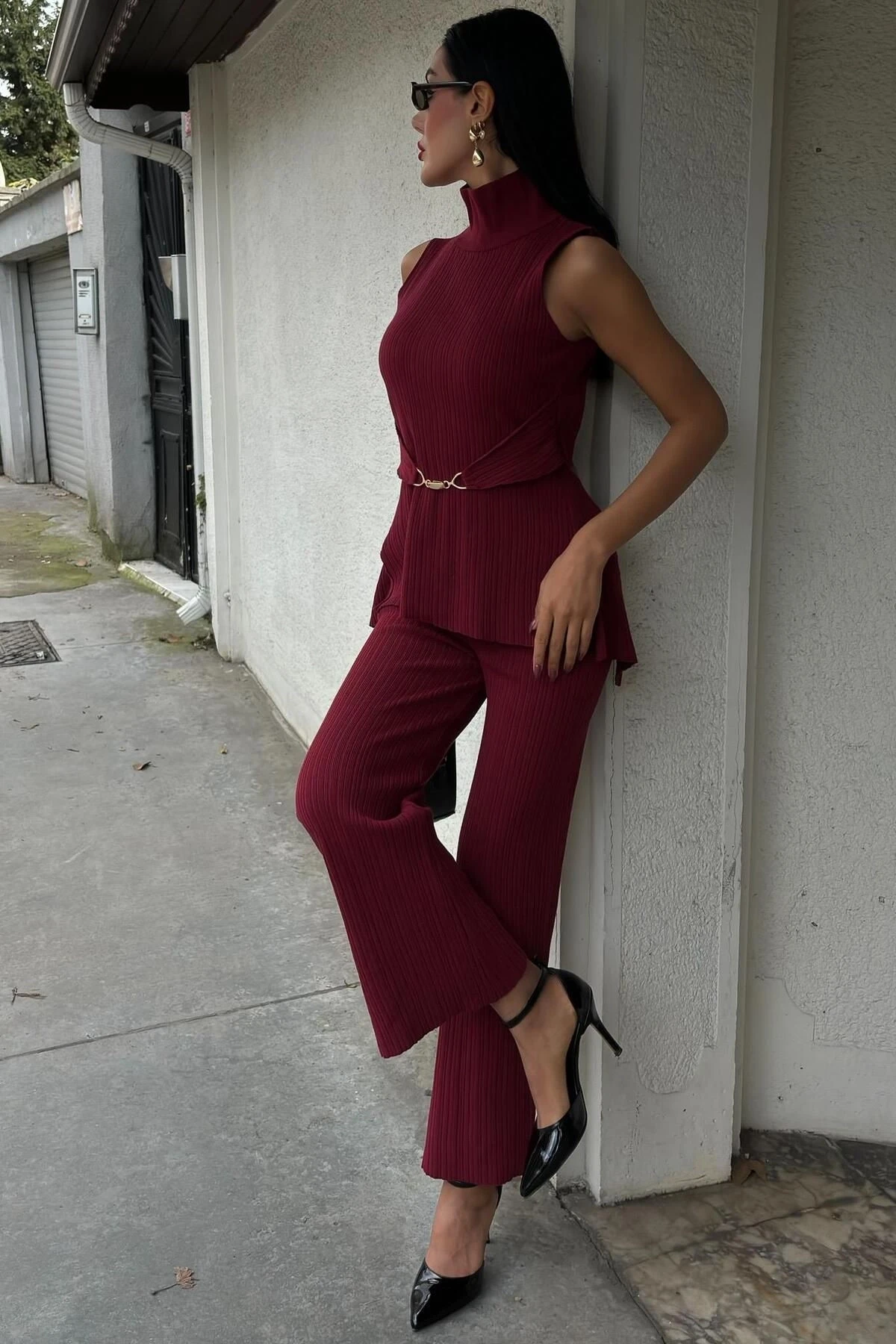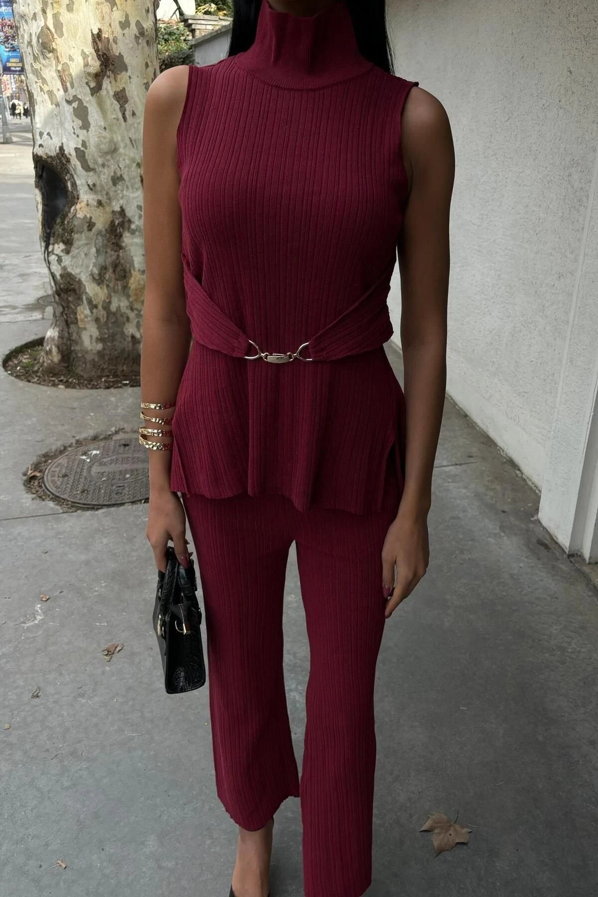 Kadın Bordo Dik Yaka Kolsuz Fitilli Triko Takım