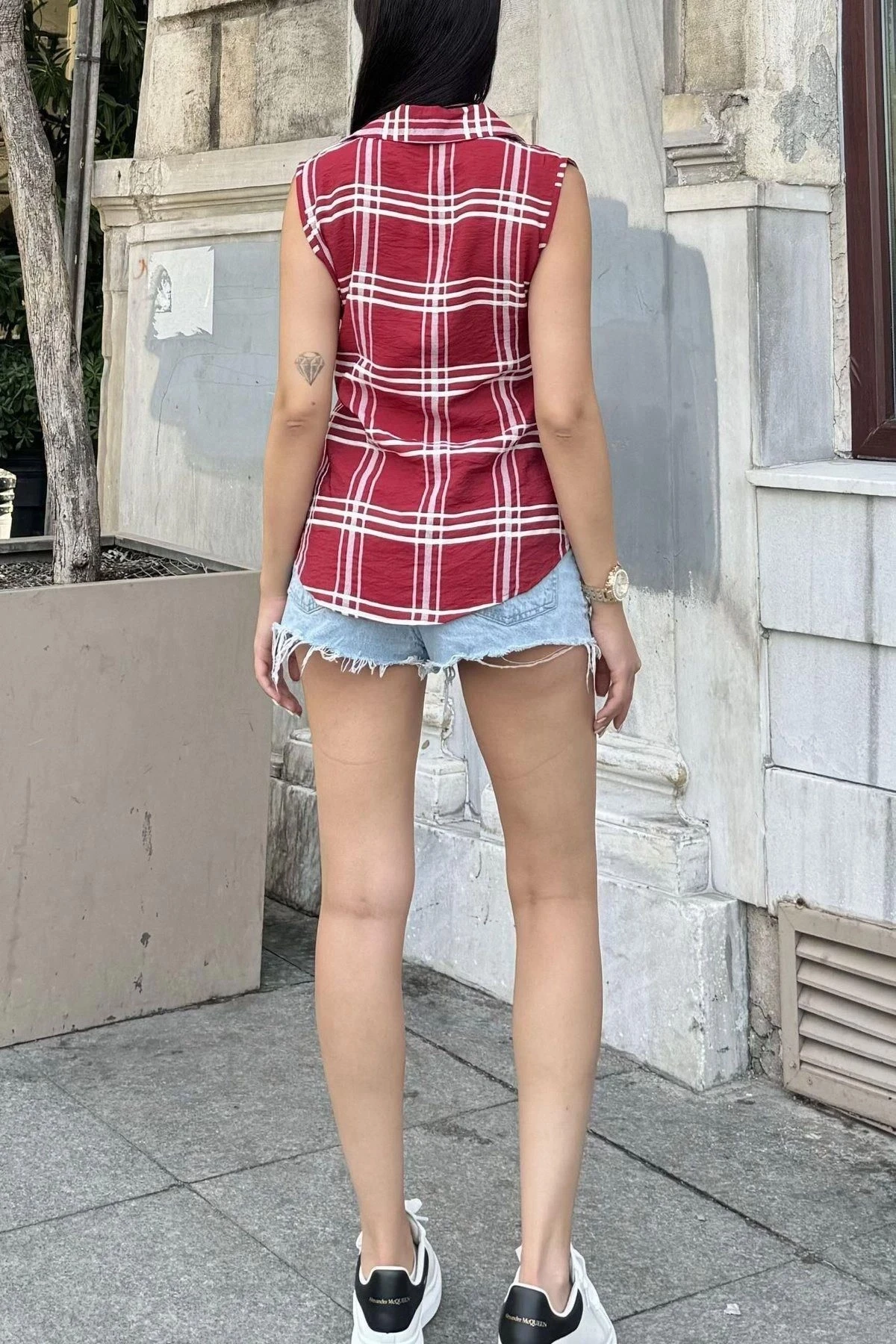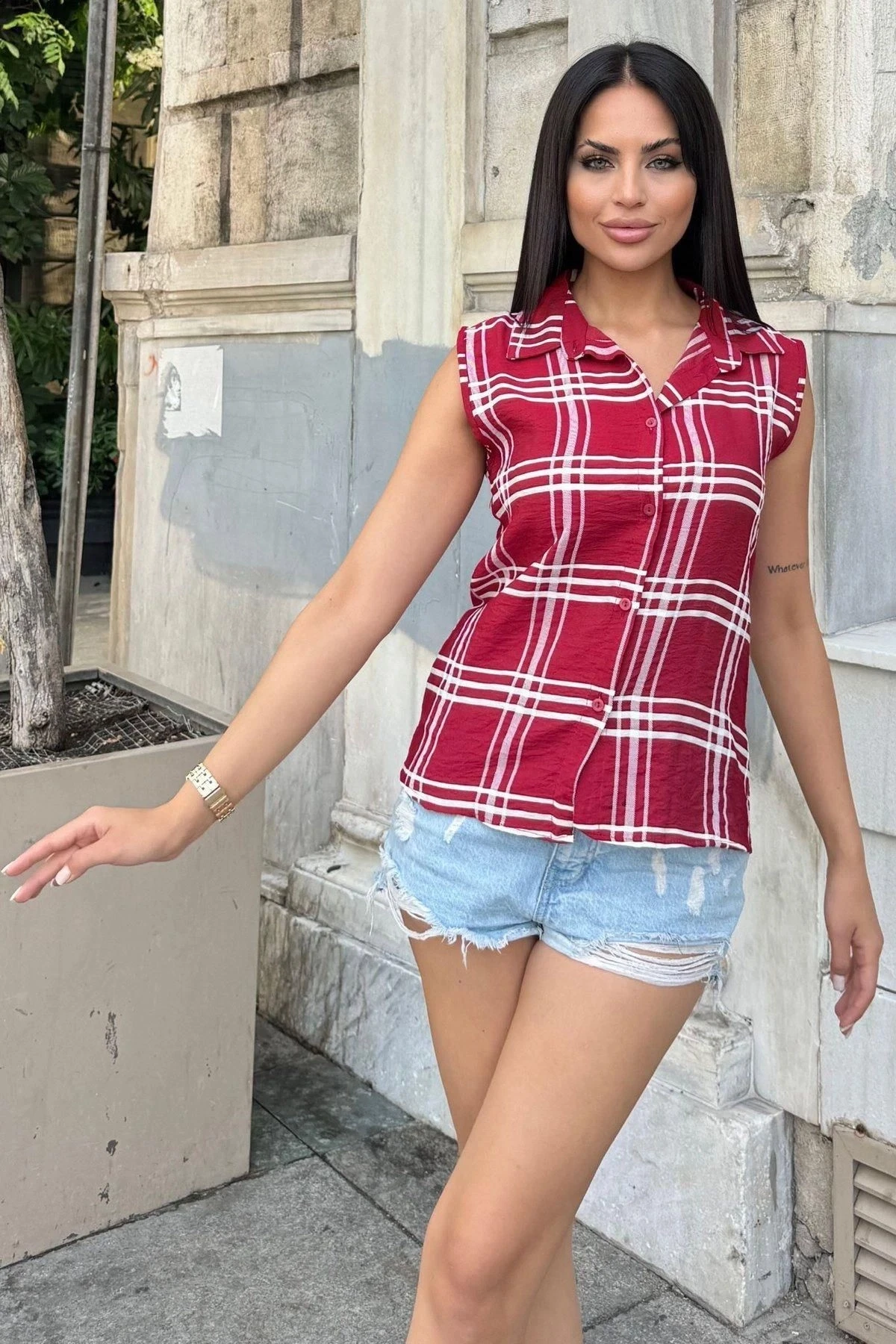 Kadın Bordo Ekose Desen, Dokulu Bodrum Kumaş, Kolsuz Rahat Gömlek