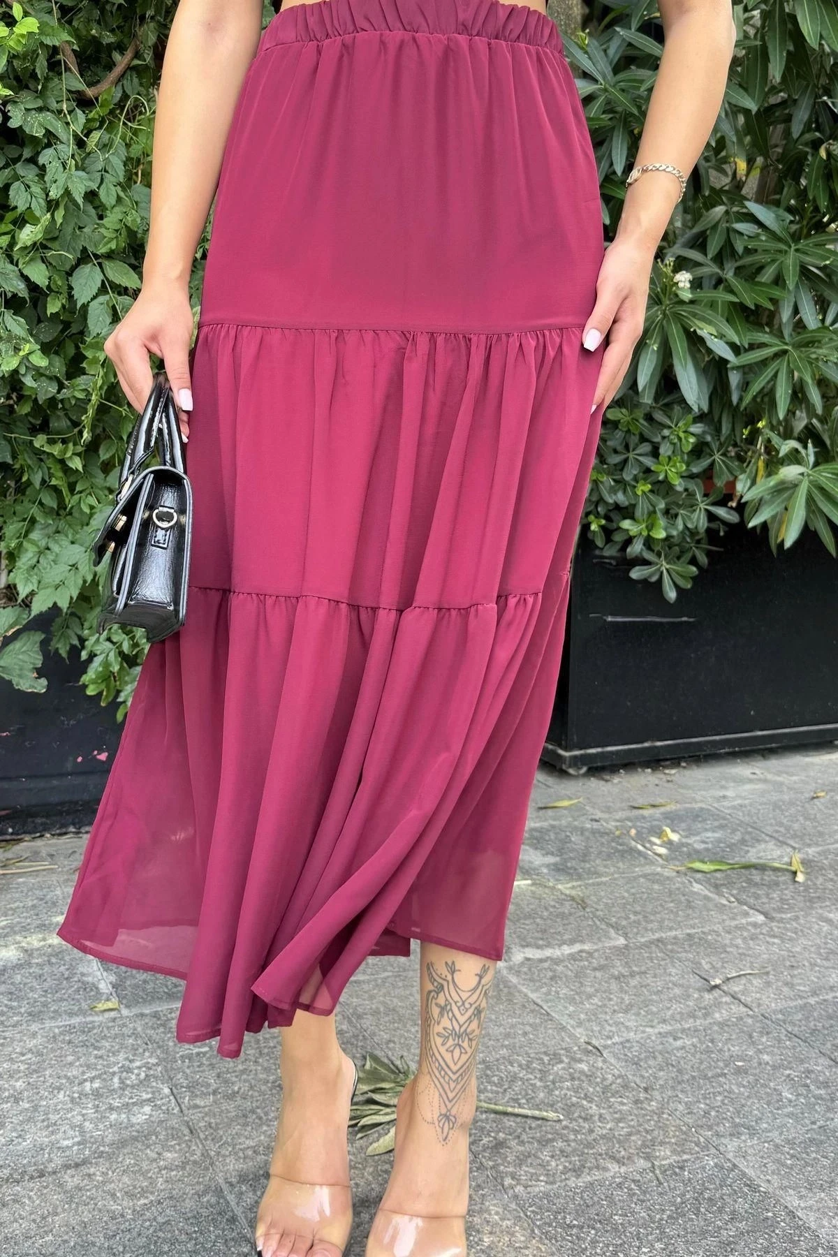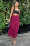 Kadın Bordo Kat Kumaşlı, Rahat Kesim, Bel Lastikli, Uzun Şifon Etek