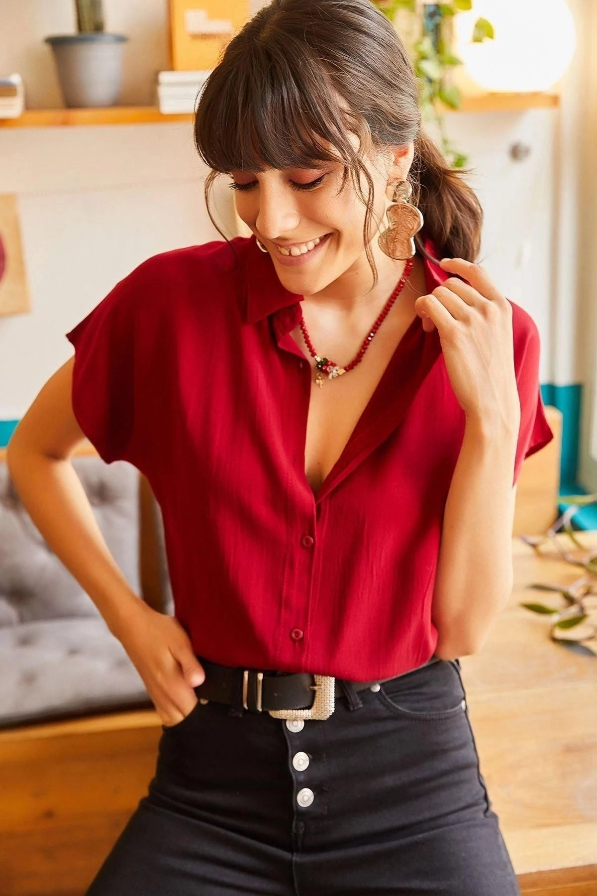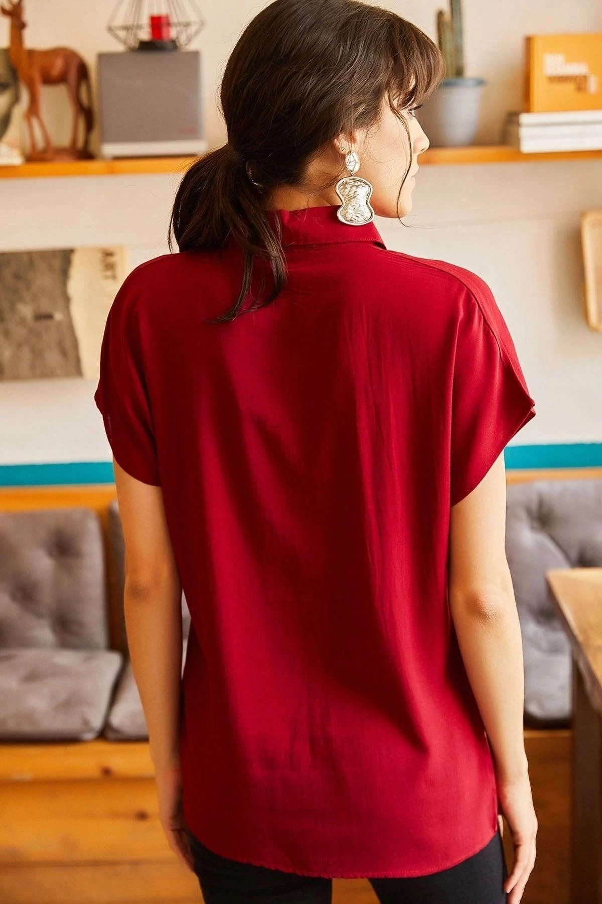 Kadın Bordo Kısa Kol Basic Polo Yaka Regular Kesim Standart Boy Gömlek