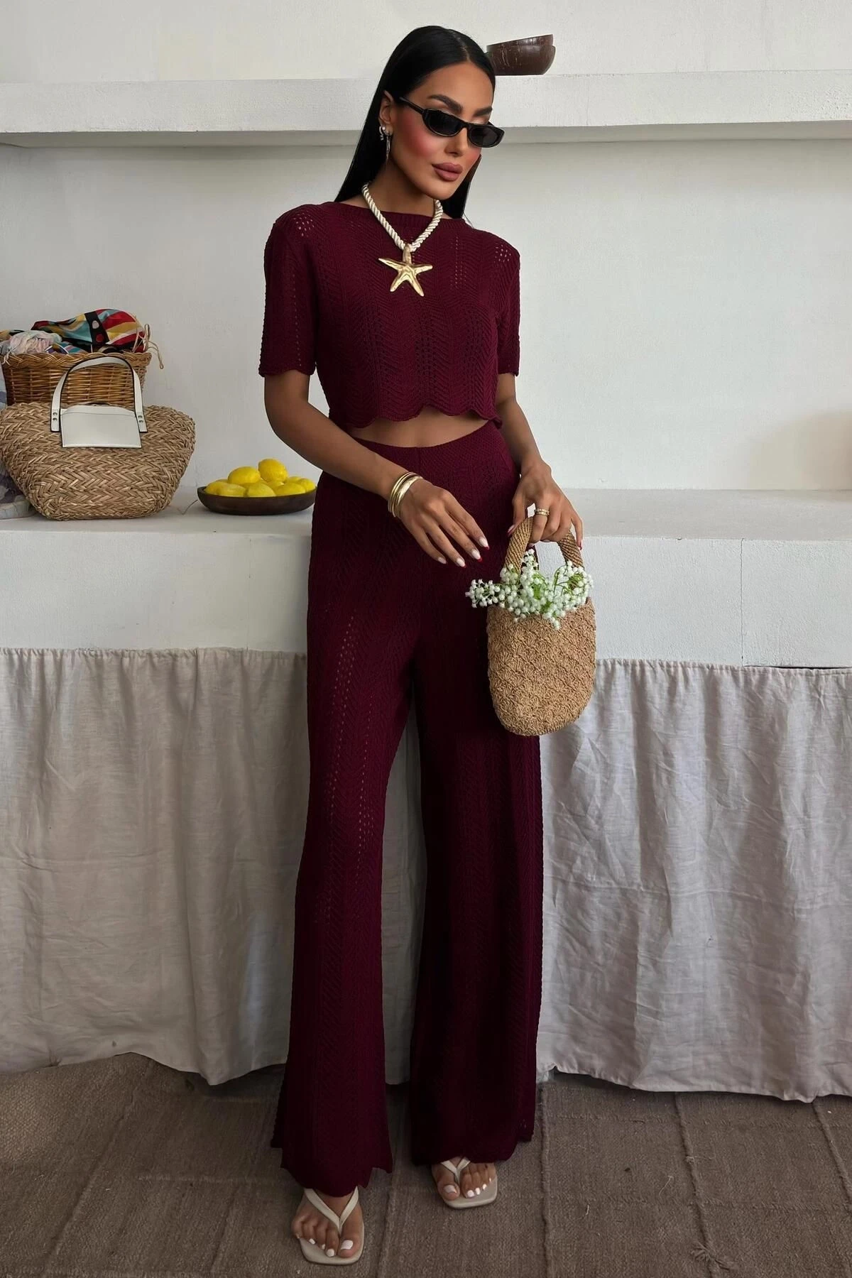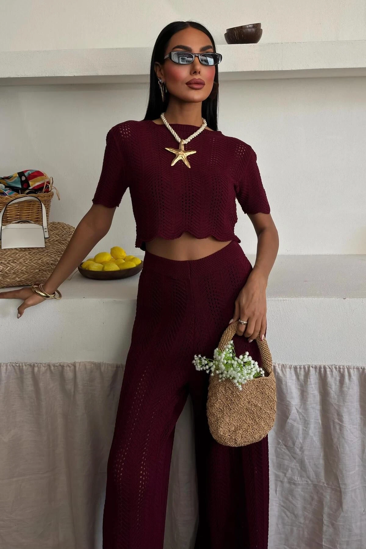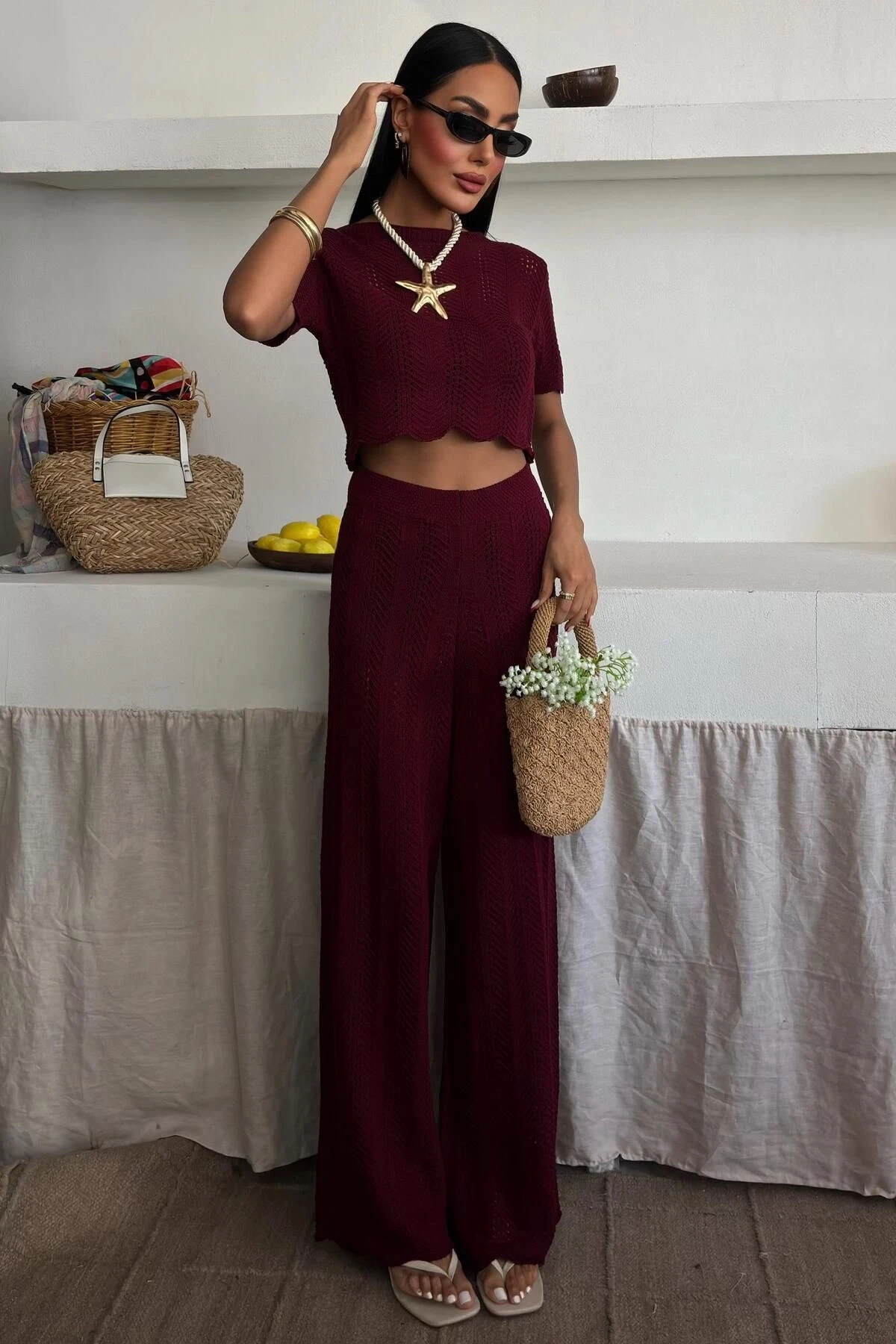 Kadın Bordo Örme Akrilik Kısa Kollu İkili Takım
