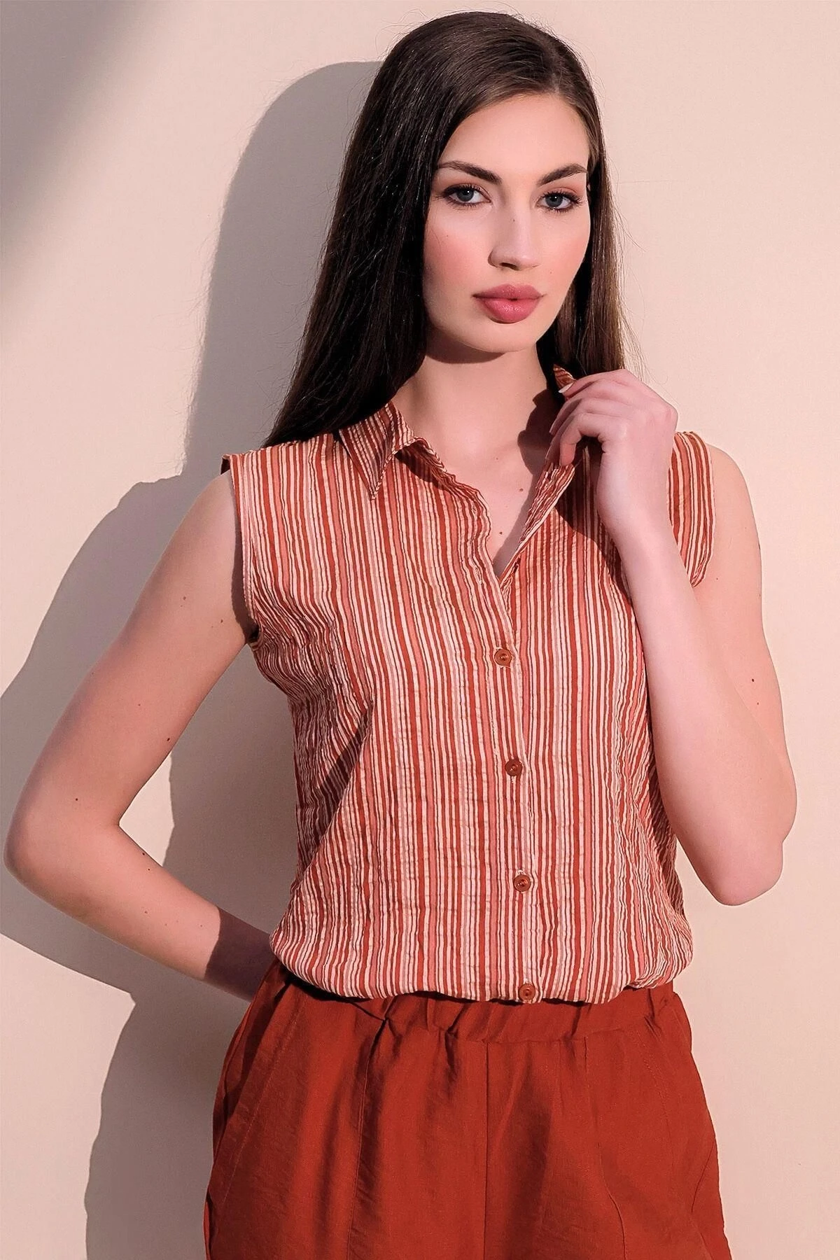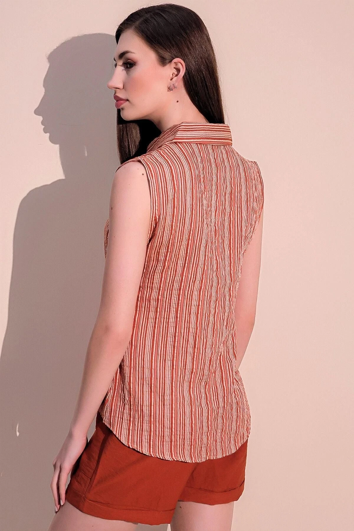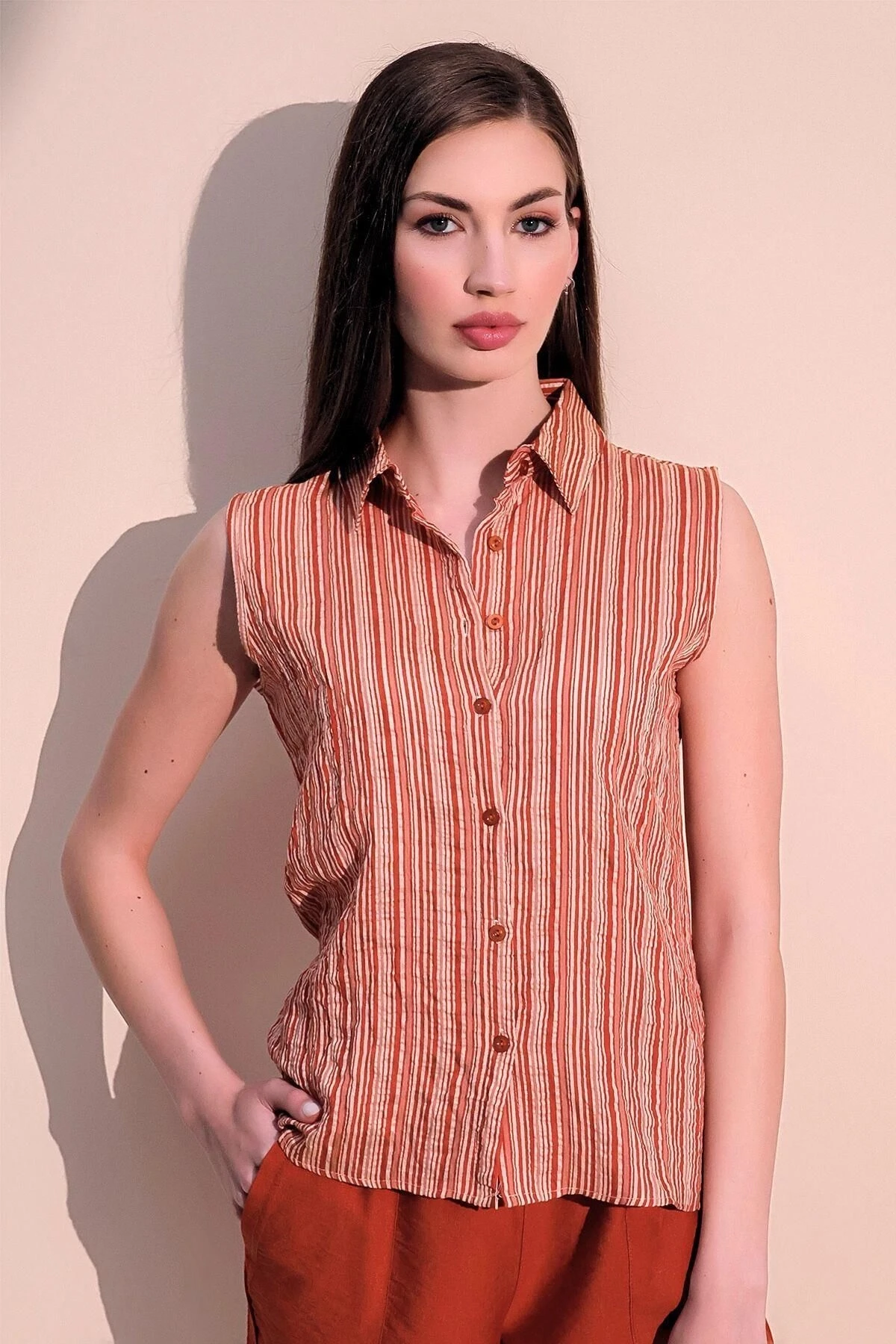 Yeni bordo renkli rahat ve dokulu kumaştan üretilen bu çizgili kolsuz gömlek, tarzınızı tamamlayacak mükemmel bir seçimdir.; Kumaşın içeriği %60 polyester ve %40 pamuktan oluşur, bu da hem dayanıklılık sağlar hem de nefes alabilen bir yapıya sahiptir.; Gömleğin rengi, canlı bordo tonuyla dikkat çekicidir.; Bu renk, herhangi bir kıyafetinizle mükemmel uyum sağlar ve şıklığınızı ön plana çıkarır.; Aynı zamanda bordo, her mevsime uyum sağlayabilen zamansız bir renktir.; Rahat ve dokulu kumaş yapısı, giydiğinizde size mükemmel bir konfor sunar.; İnce bir doku hissiyle yumuşaklık ve pürüzsüzlük sağlar.; Ayrıca kumaşın nefes alabilen özelliği, sıcak havalarda serin kalmanızı sağlar ve terlemeyi en aza indirir.; Çizgili tasarımı, gömleğe şık bir hava katarken aynı zamanda enerjik bir görünüm sunar.; İnce beyaz çizgiler, bordo rengin üzerinde hoş bir kontrast oluşturur.; Bu gömlek, günlük giyimde veya özel bir etkinlikte şık bir seçenek olarak kullanılabilir.; Kalıp olarak, bu gömlek standart bir kesime sahiptir ve çoğu bedene uyum sağlar.; Rahat ve gevşek yapısıyla hareket özgürlüğünüzü kısıtlamaz.; Bu bordo renkli, rahat ve dokulu kumaş çizgili kolsuz gömlek, tarzınızı tamamlayacak ve şıklığınızı ön plana çıkaracak mükemmel bir seçimdir.; Hem rahatlığı hem de şık tasarımıyla gardırobunuzun vazgeçilmez parçalarından biri olacak.