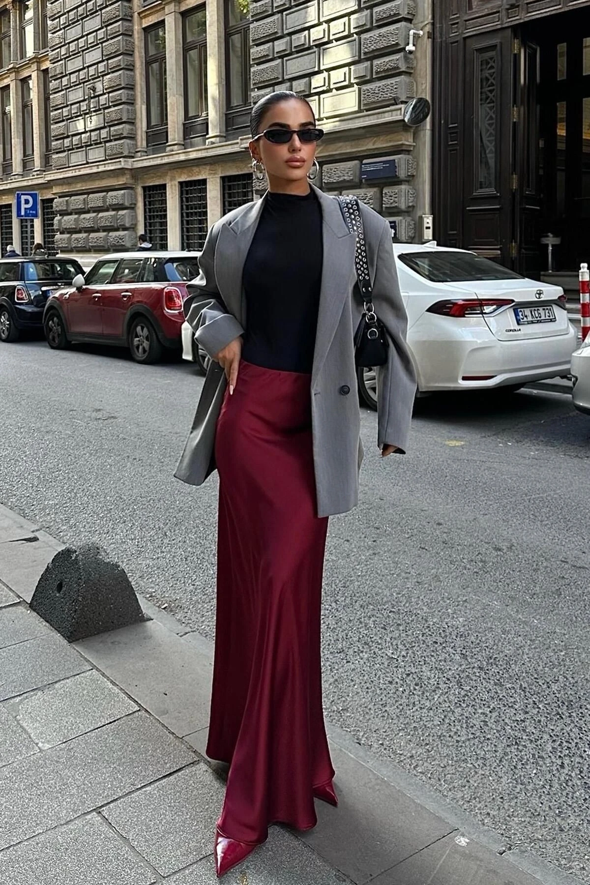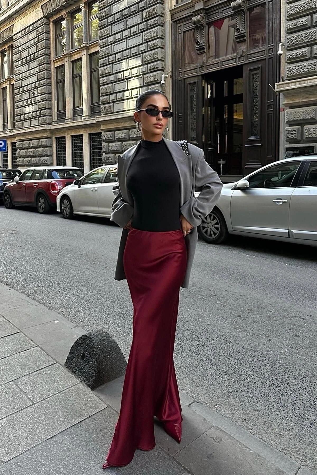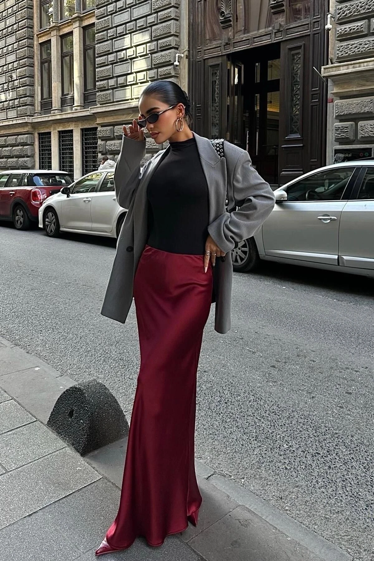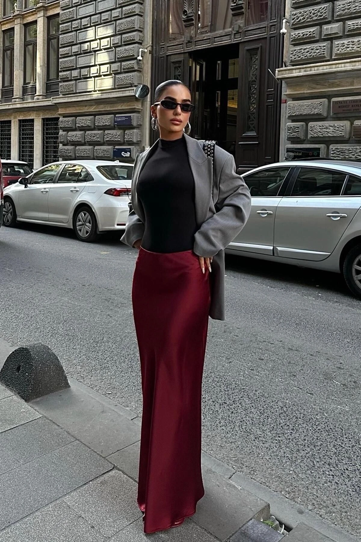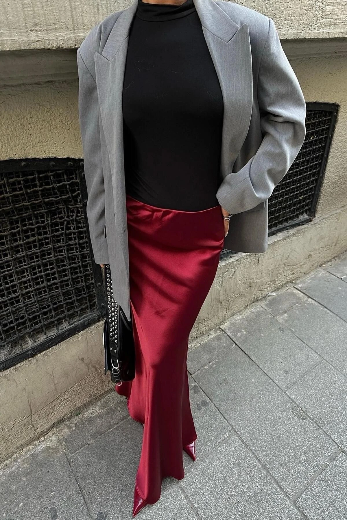 Kadın Bordo Saten Uzun Maxi Etek