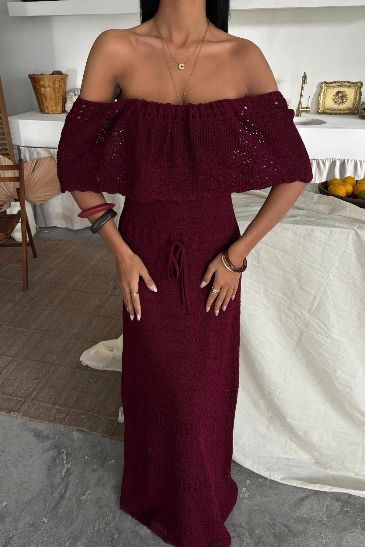 Kadın Bordo Straplez Triko Uzun Elbise