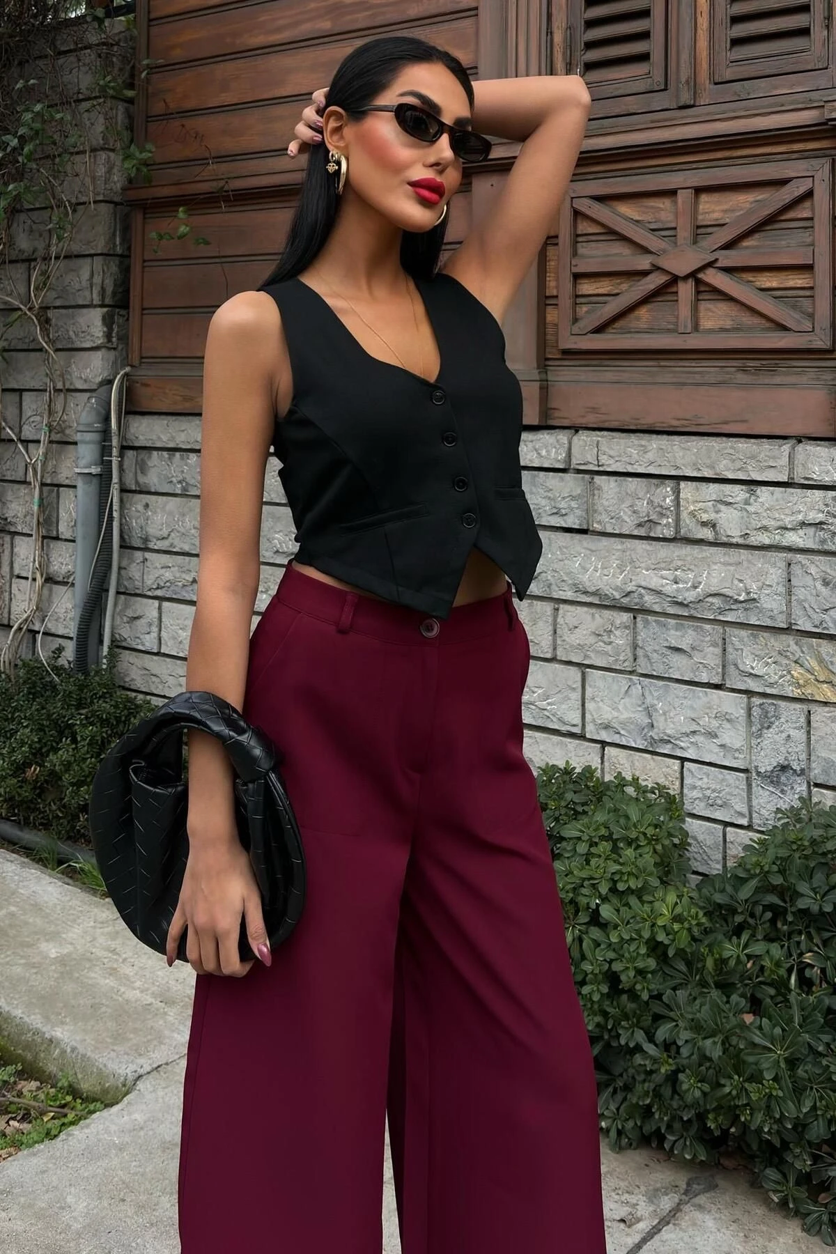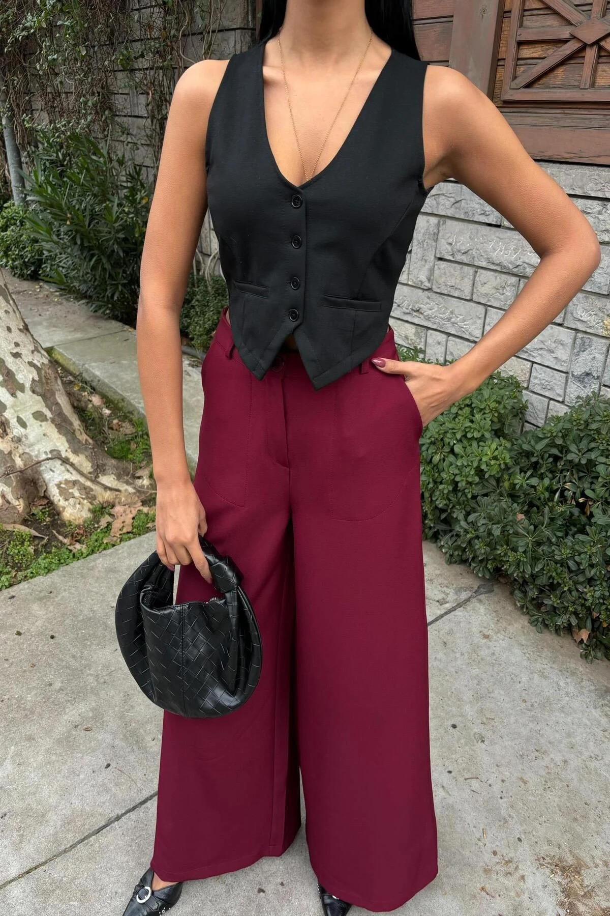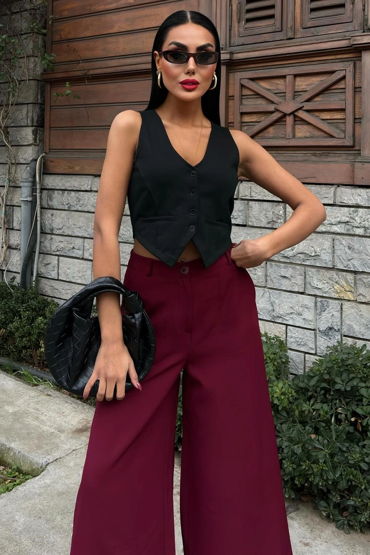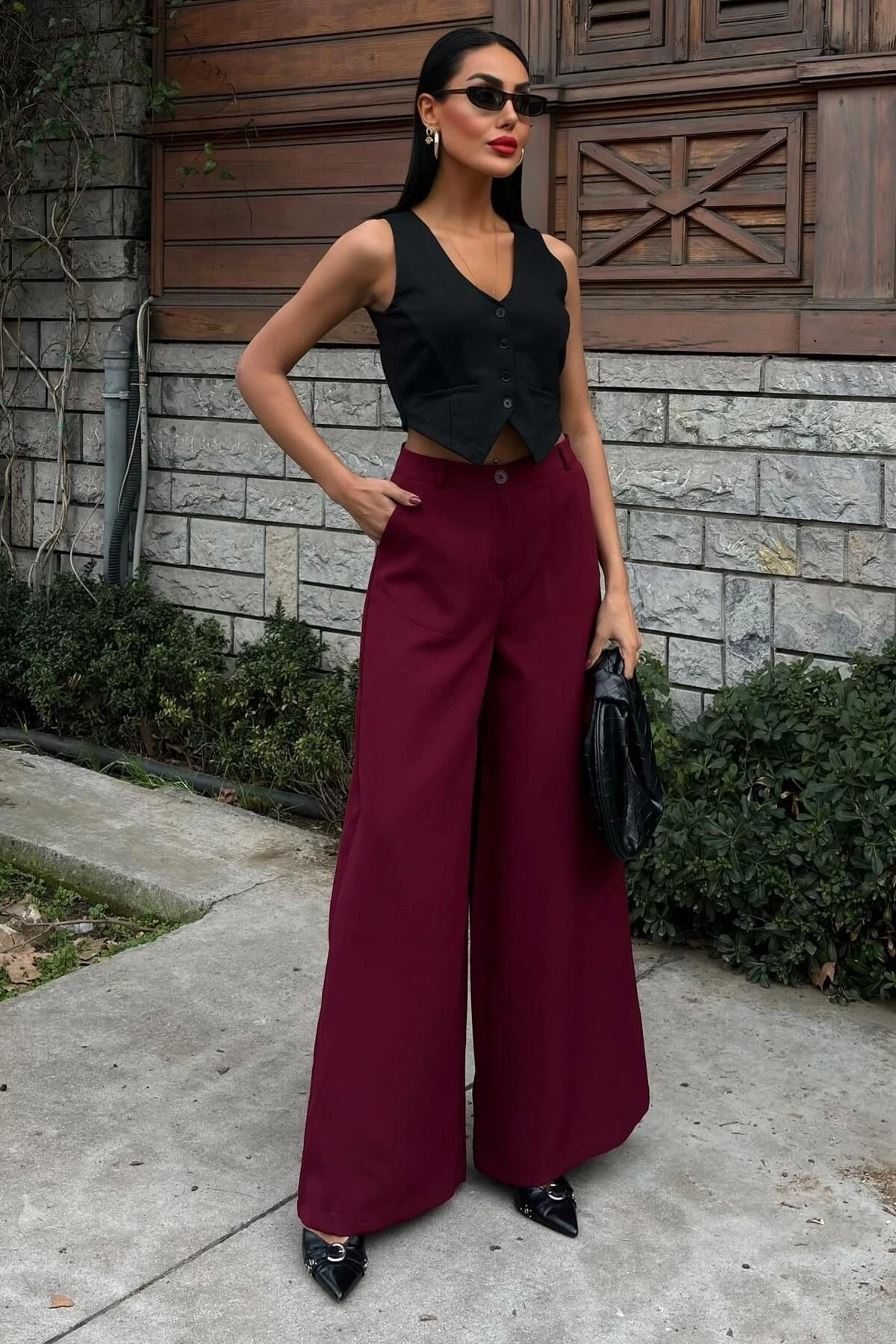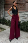 Kadın Bordo Uzun Dokuma Bol Paça Pantolon