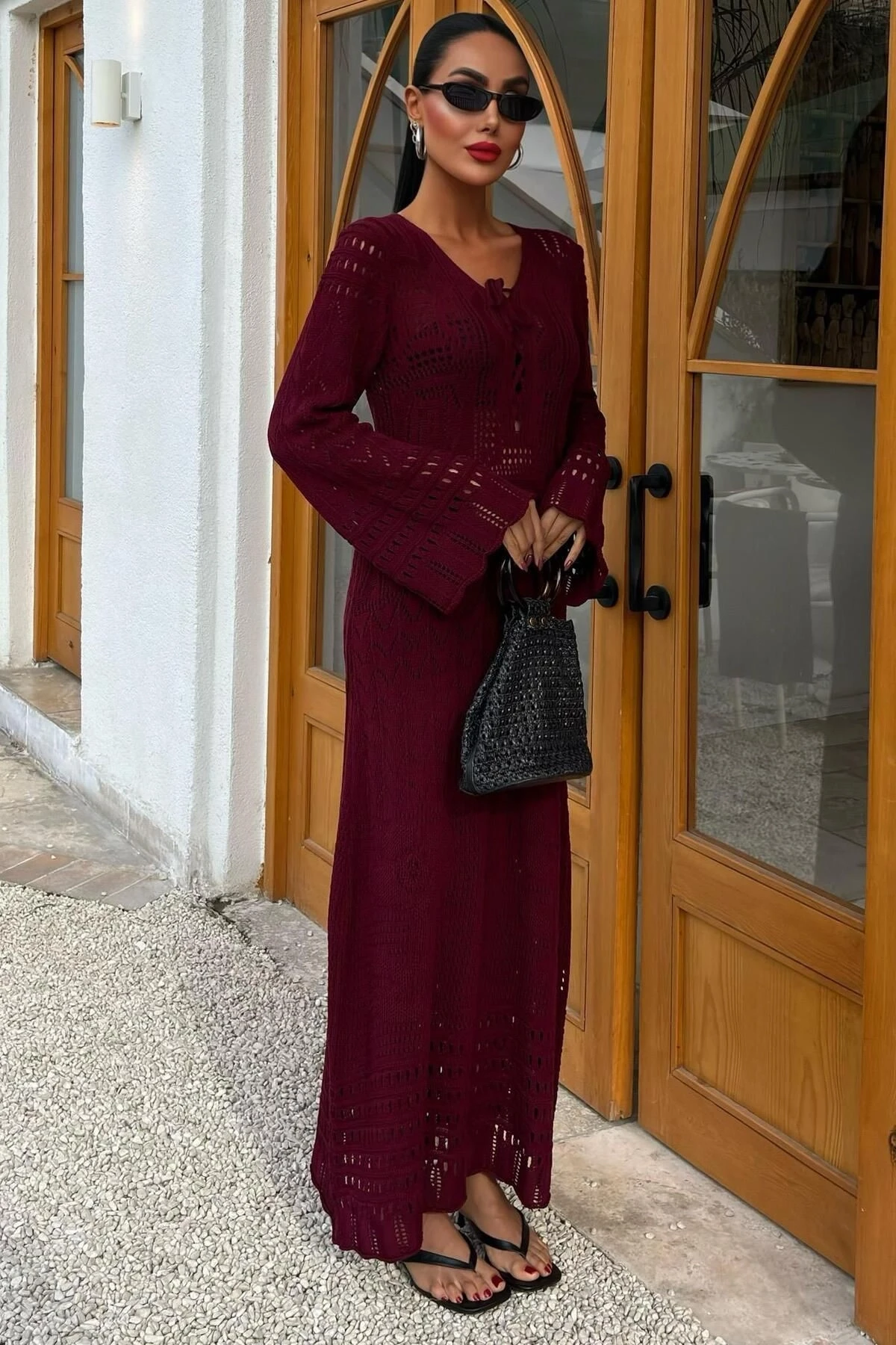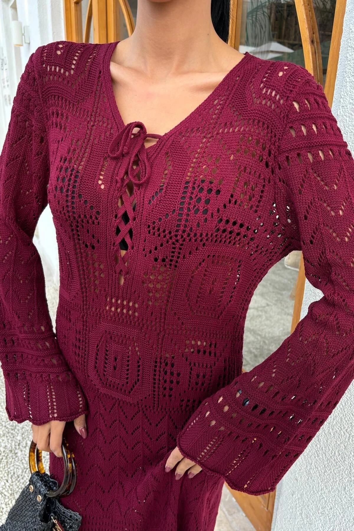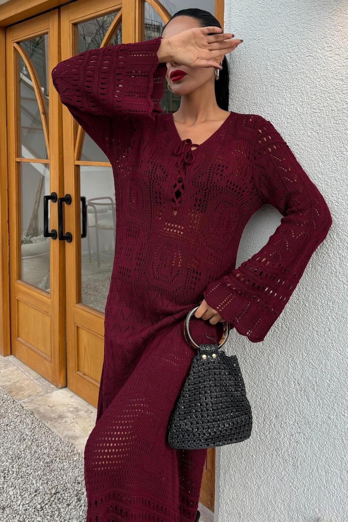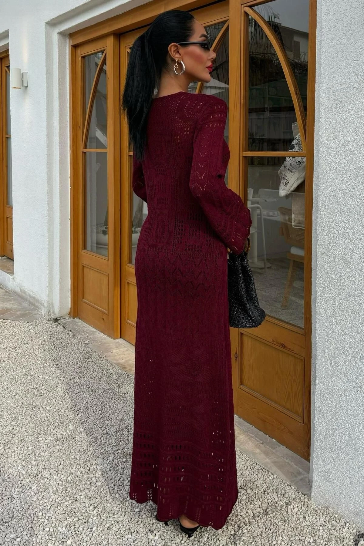 Kadın Bordo Uzun Örme V Yaka Elbise
