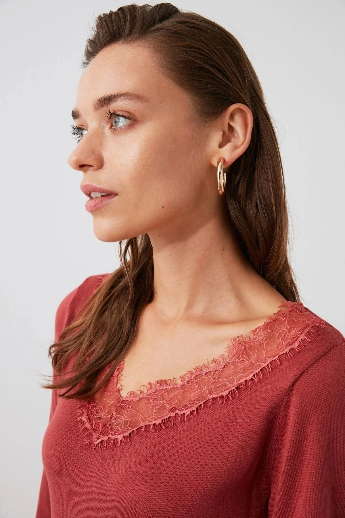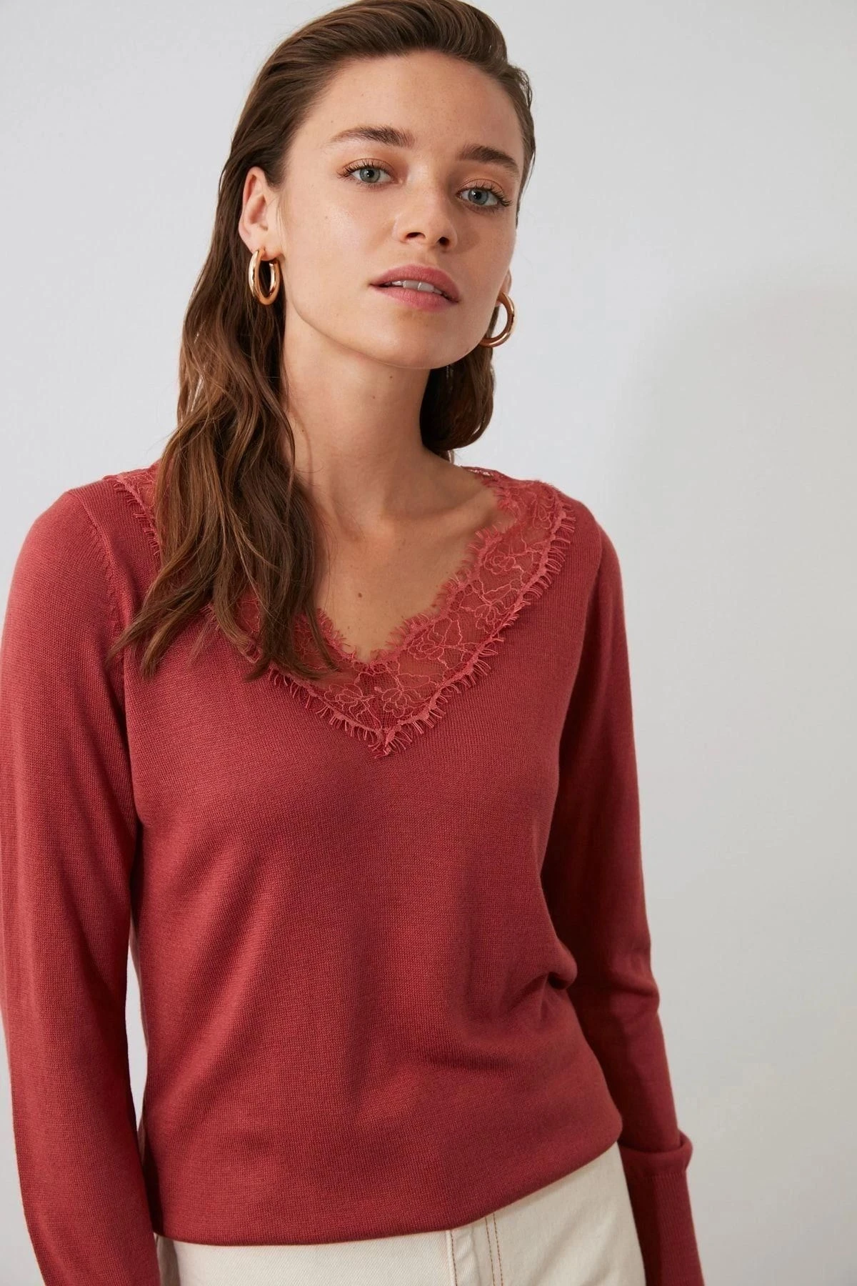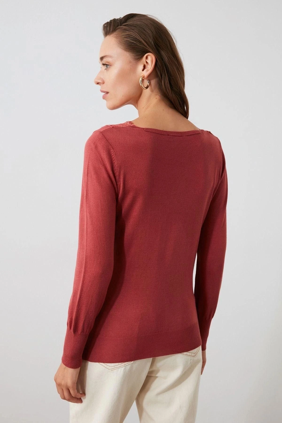 Kadın Bordo V Yaka, Uzun Kol, Dantel Detaylı, Regular Kesim, Standart Boy Triko.
