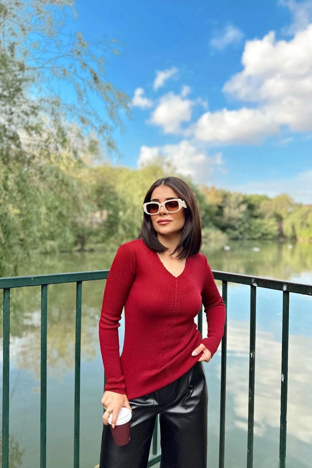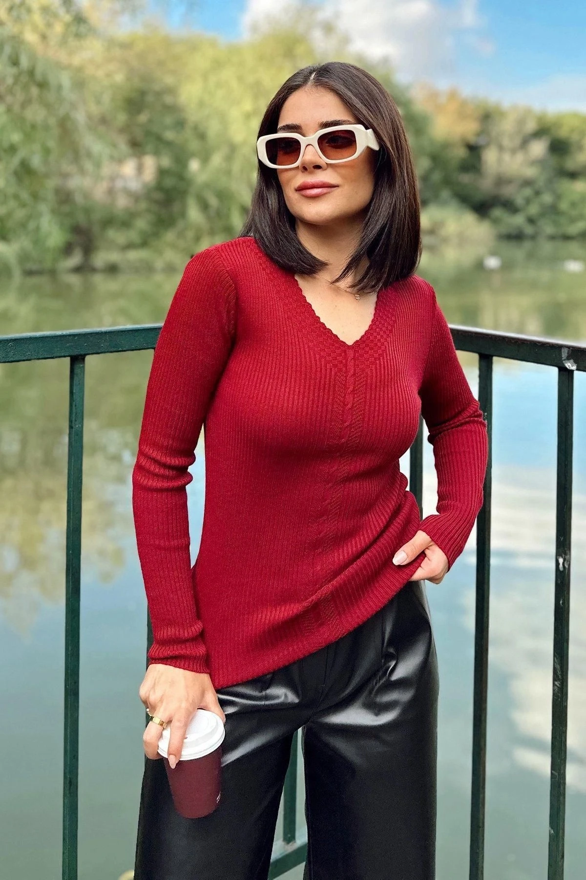 Kadın Bordo V Yaka, Uzun Kol, Vucüda Oturan Kalıp, Esnek Kumaş, Örgü Desen Triko Bluz