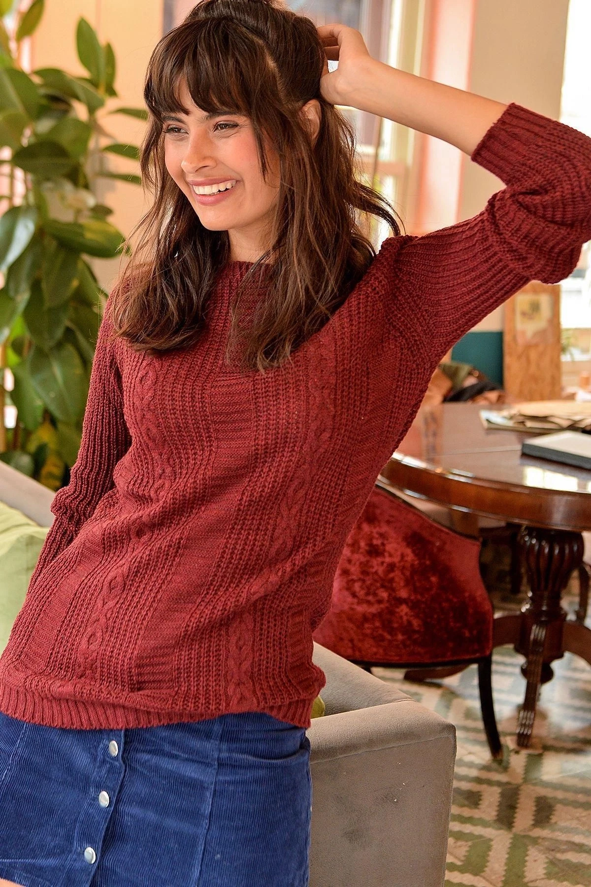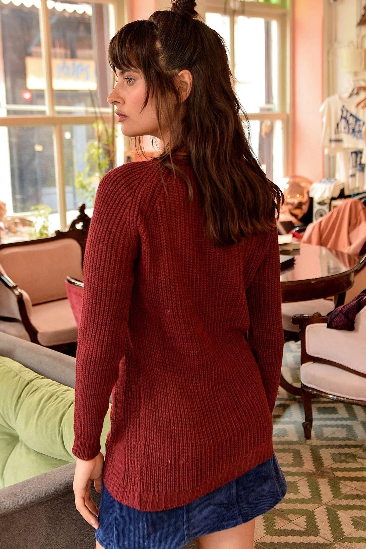 Kadın Bordo Yuvarlak Yaka Basic Regular Kesim Uzun Kol Standart Boy Triko