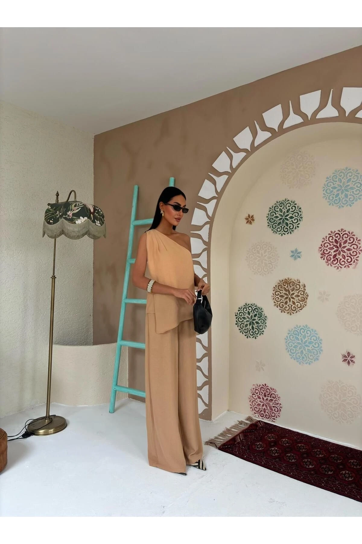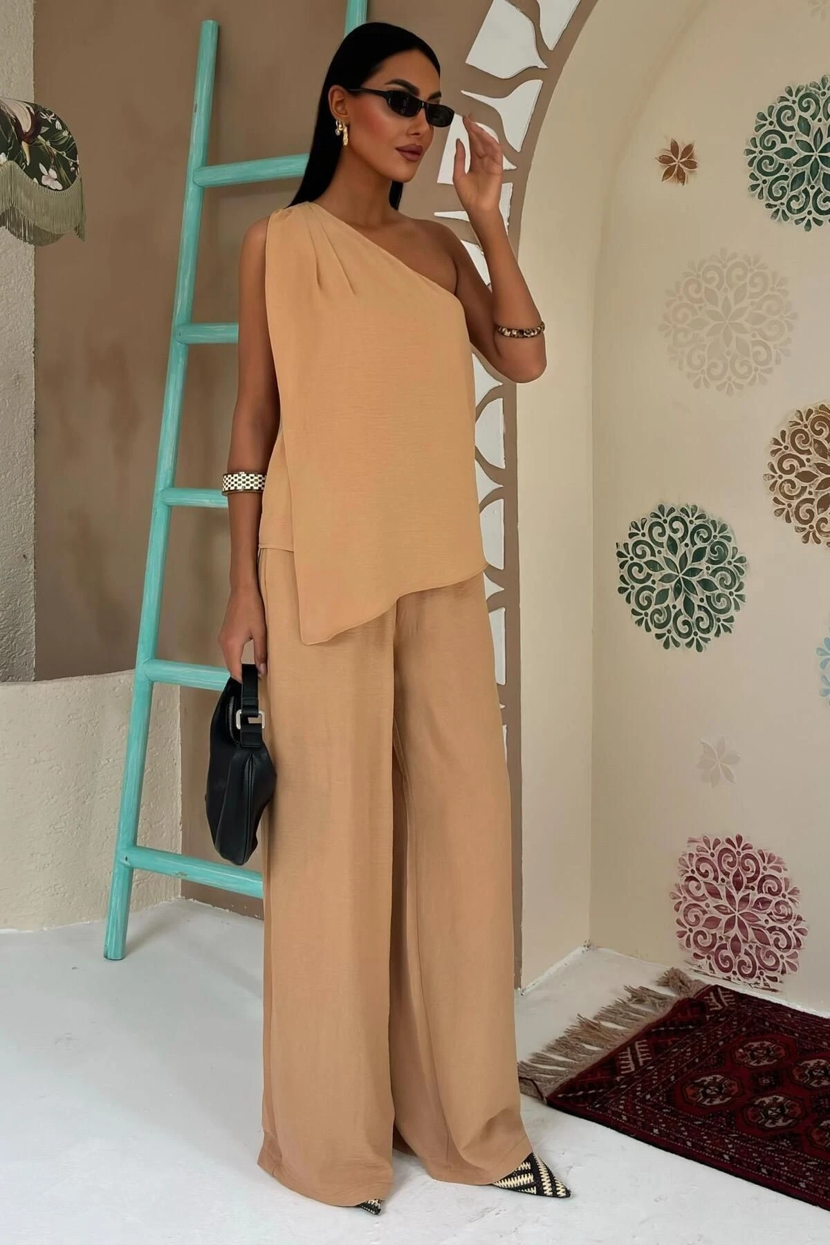 Kadın Camel Ayrobin Tek Omuz Oversize Takım