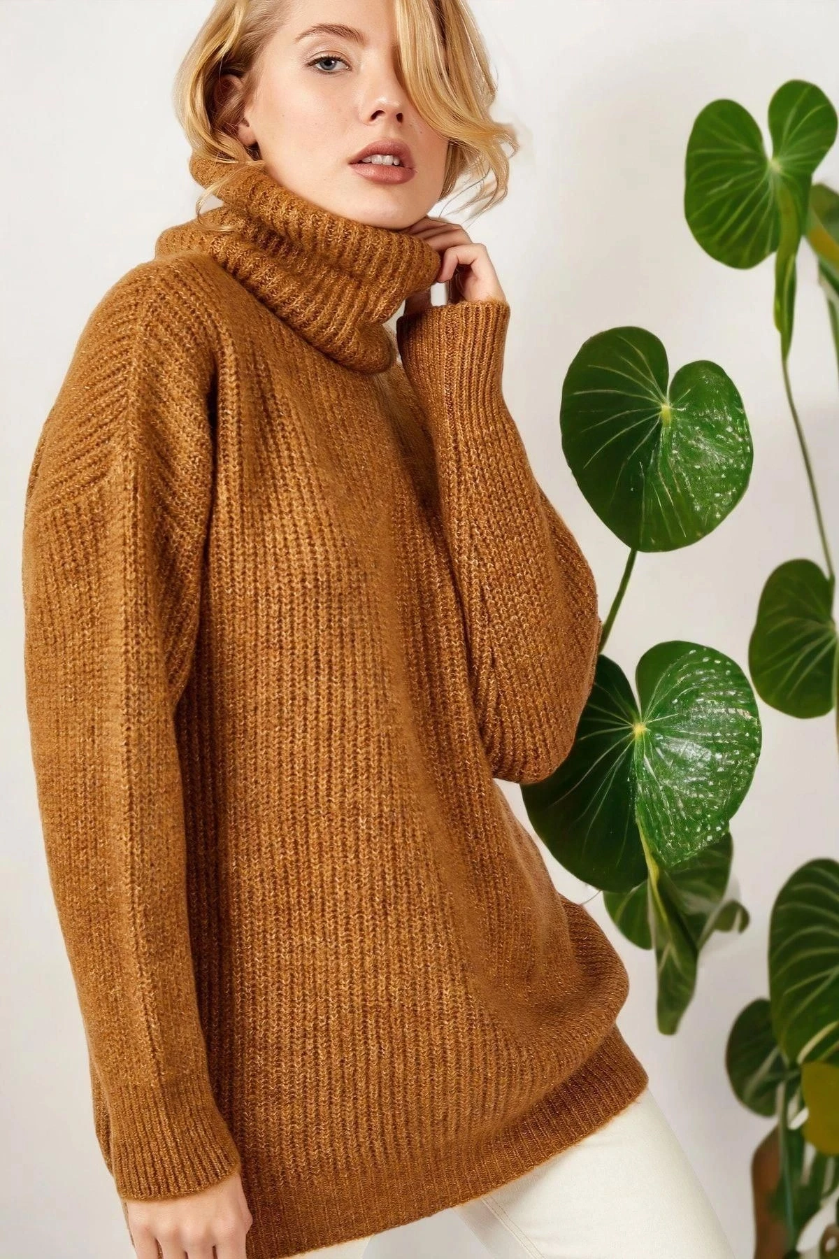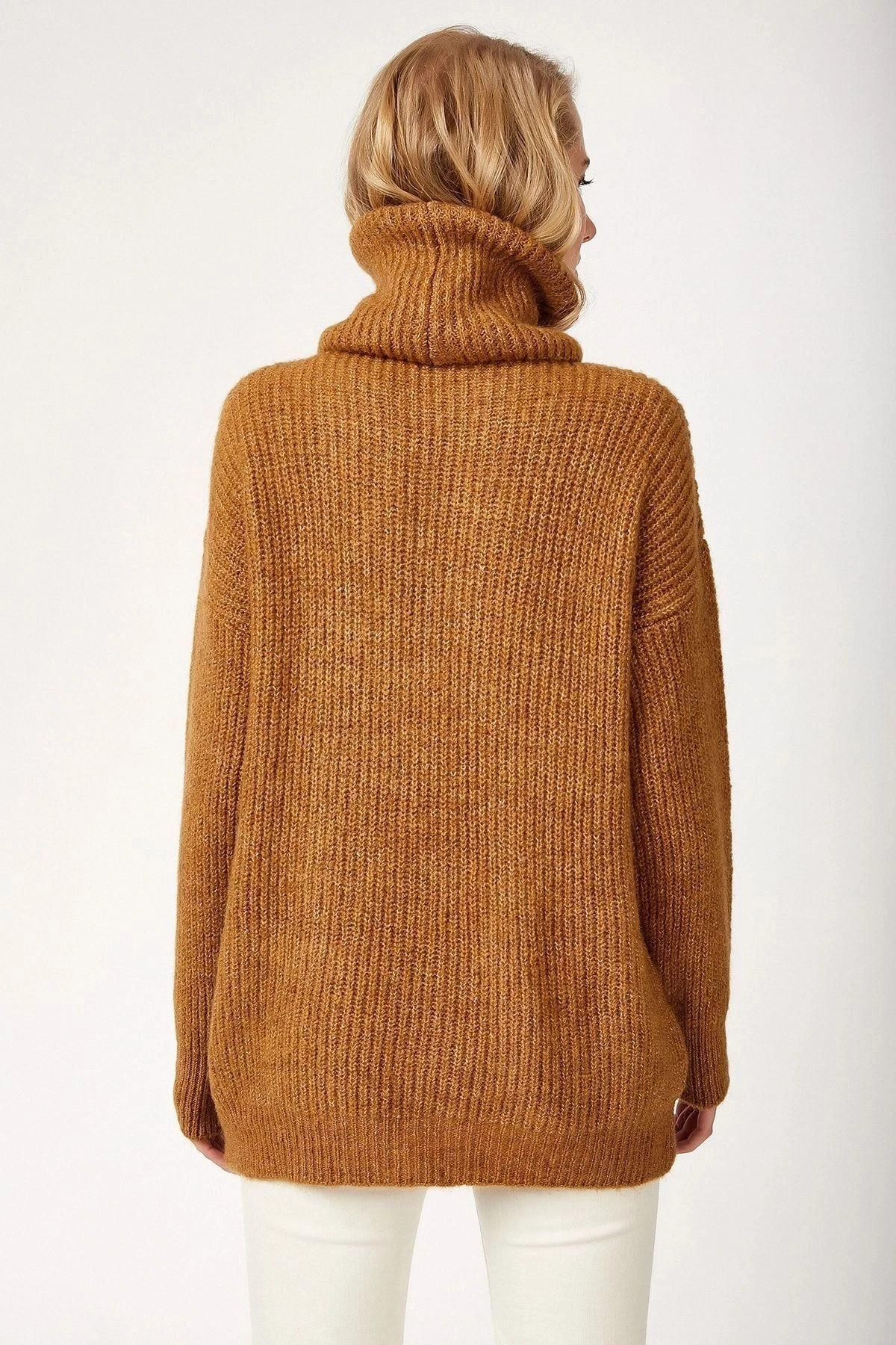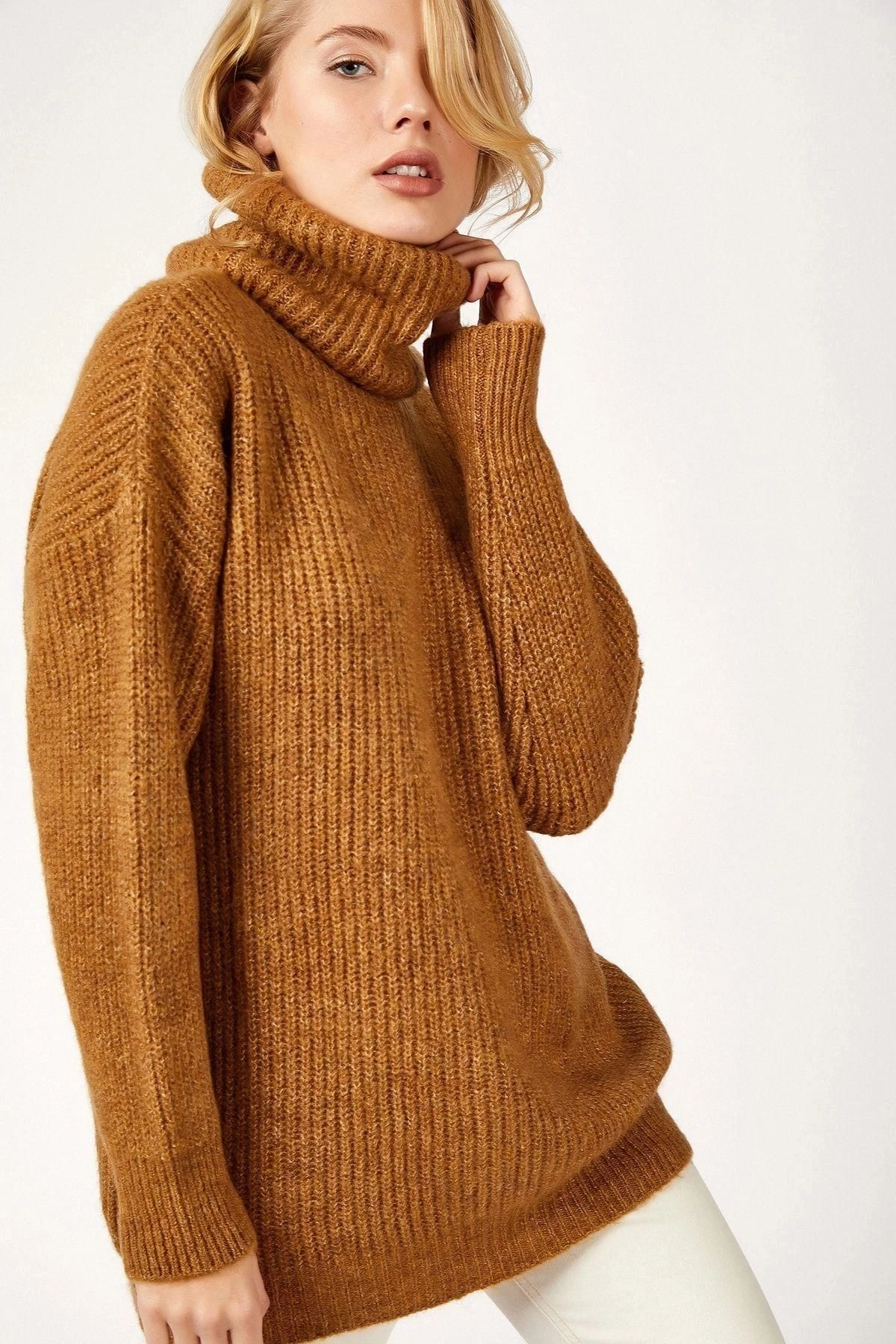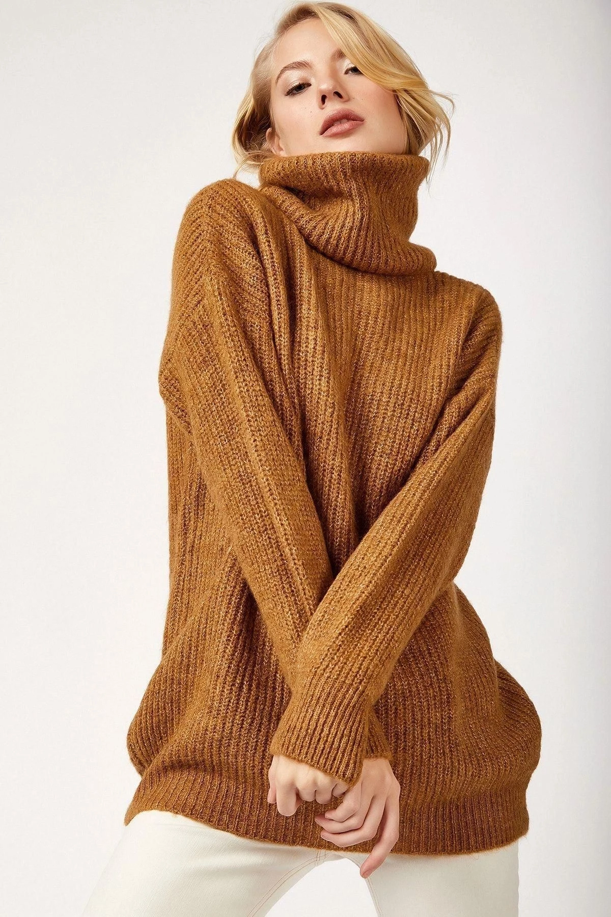 Kadın Camel Basic Uzun Kol Balıkçı Yaka Kaliteli Kumaş Oversize Kesim Standart Boy Kazak