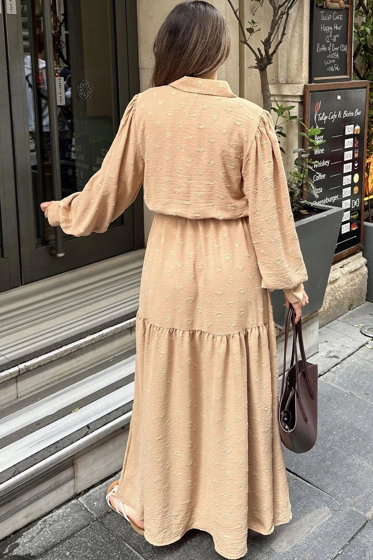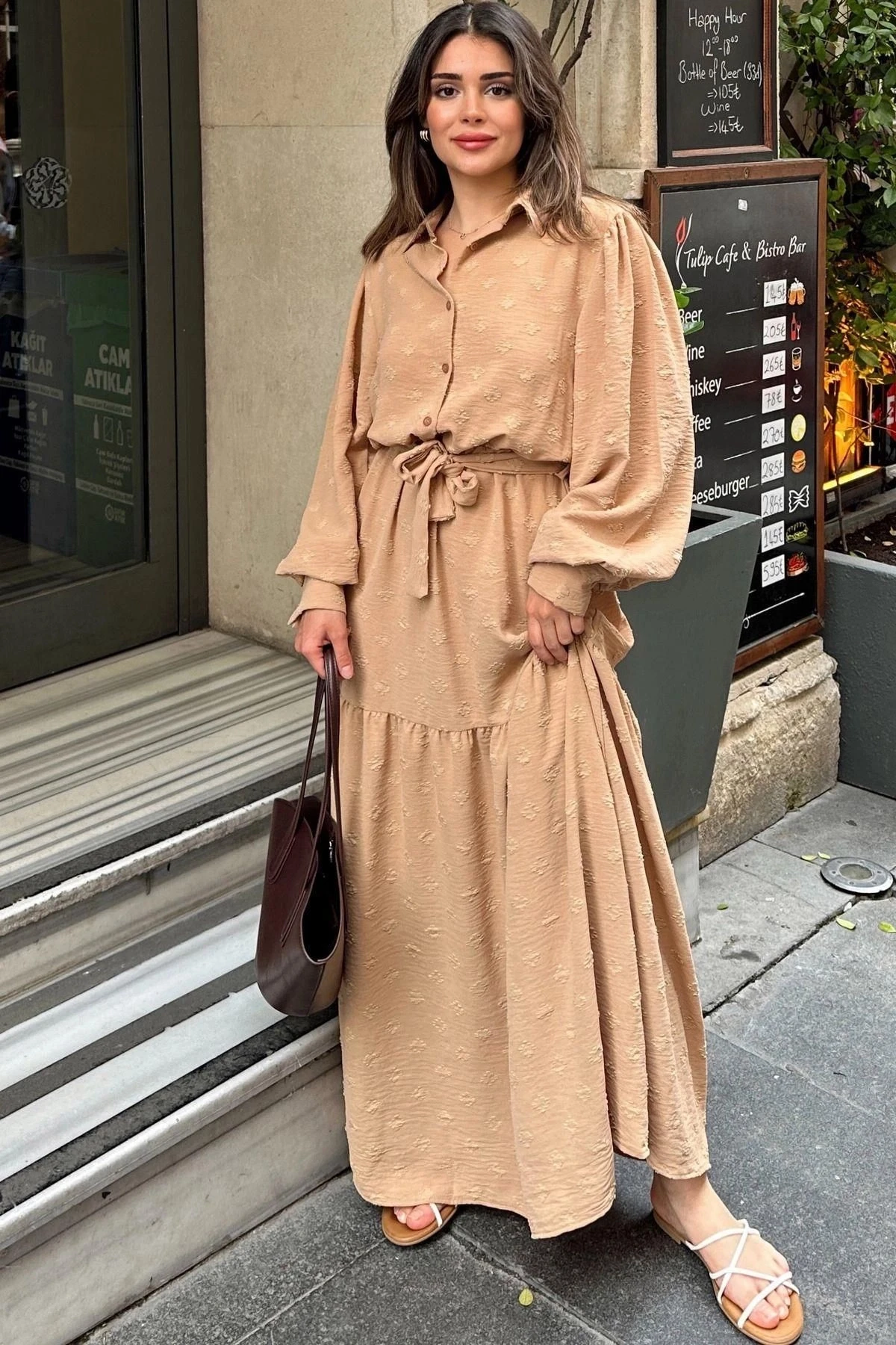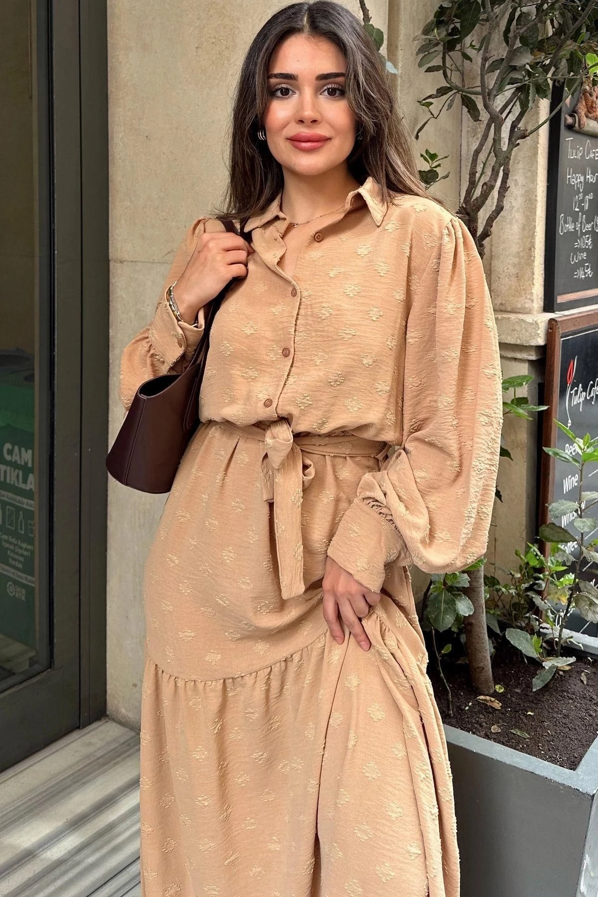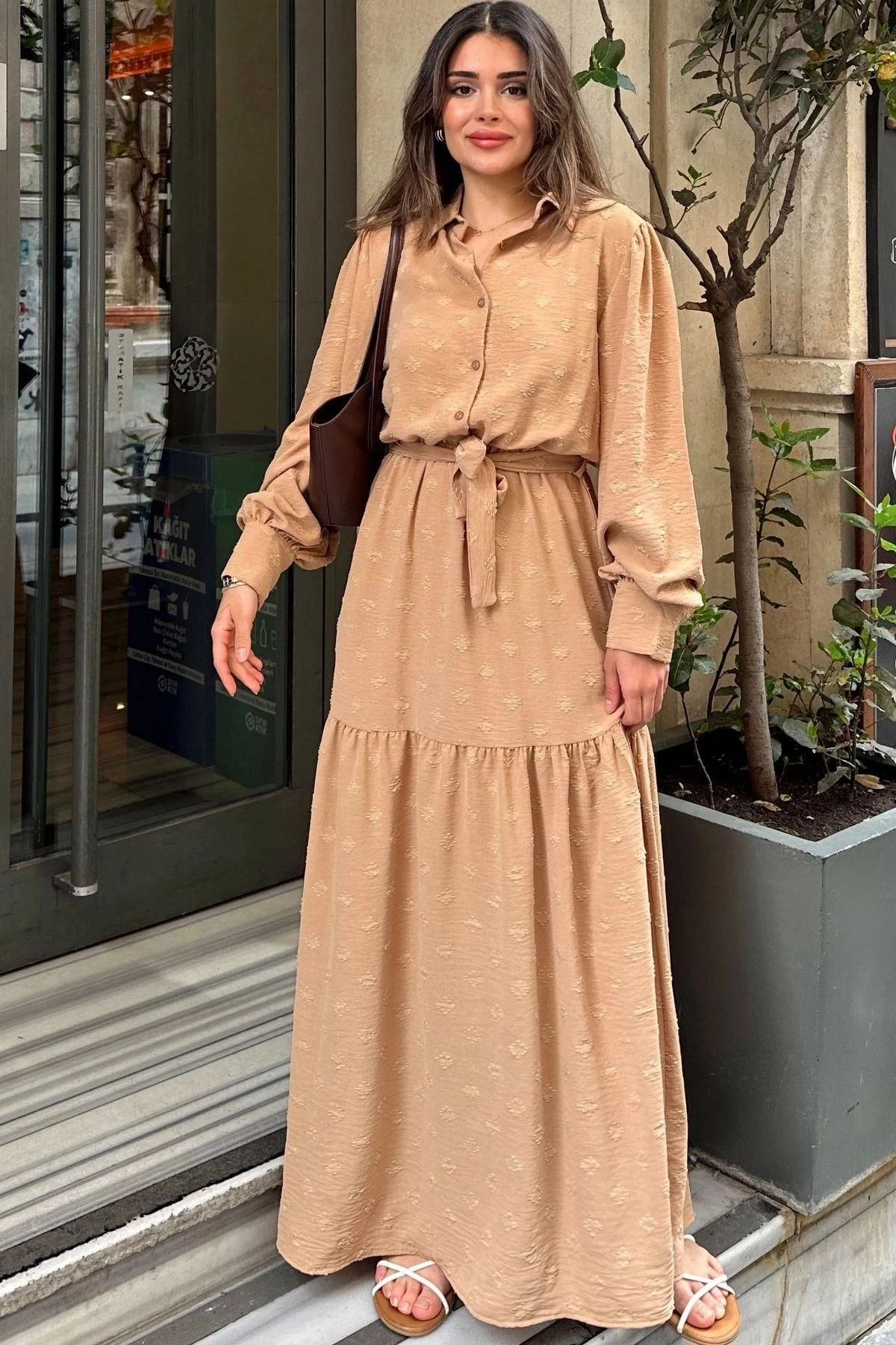 Kadın Camel Dokulu Kumaş, Beli Kuşaklı, Balon Kol, A Kesim, Vintage Maksi Elbise - Tesettüre Uygun