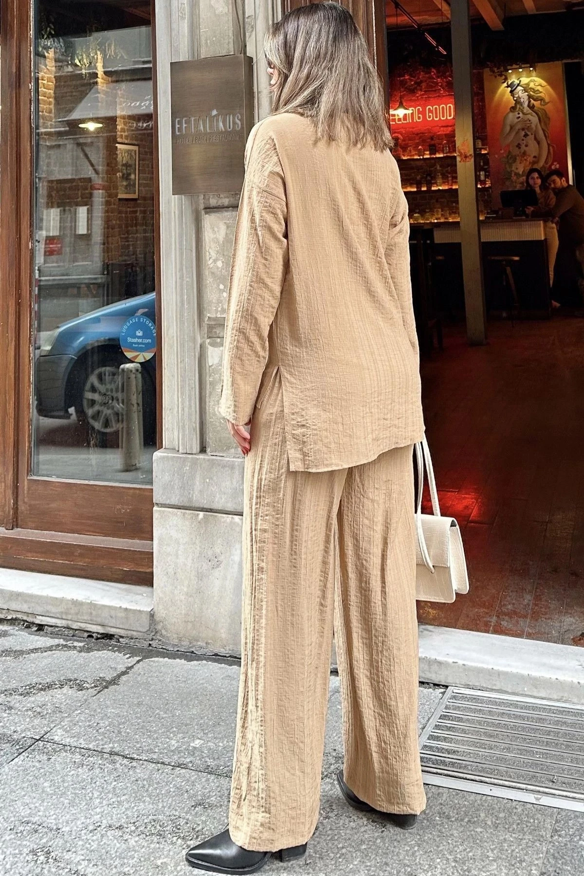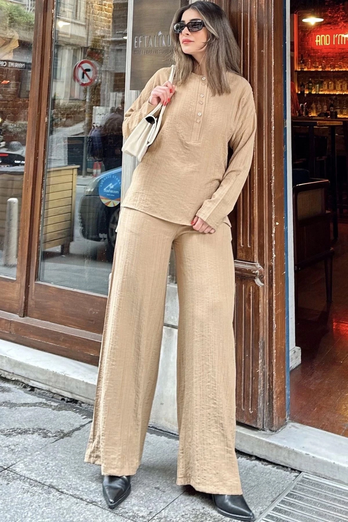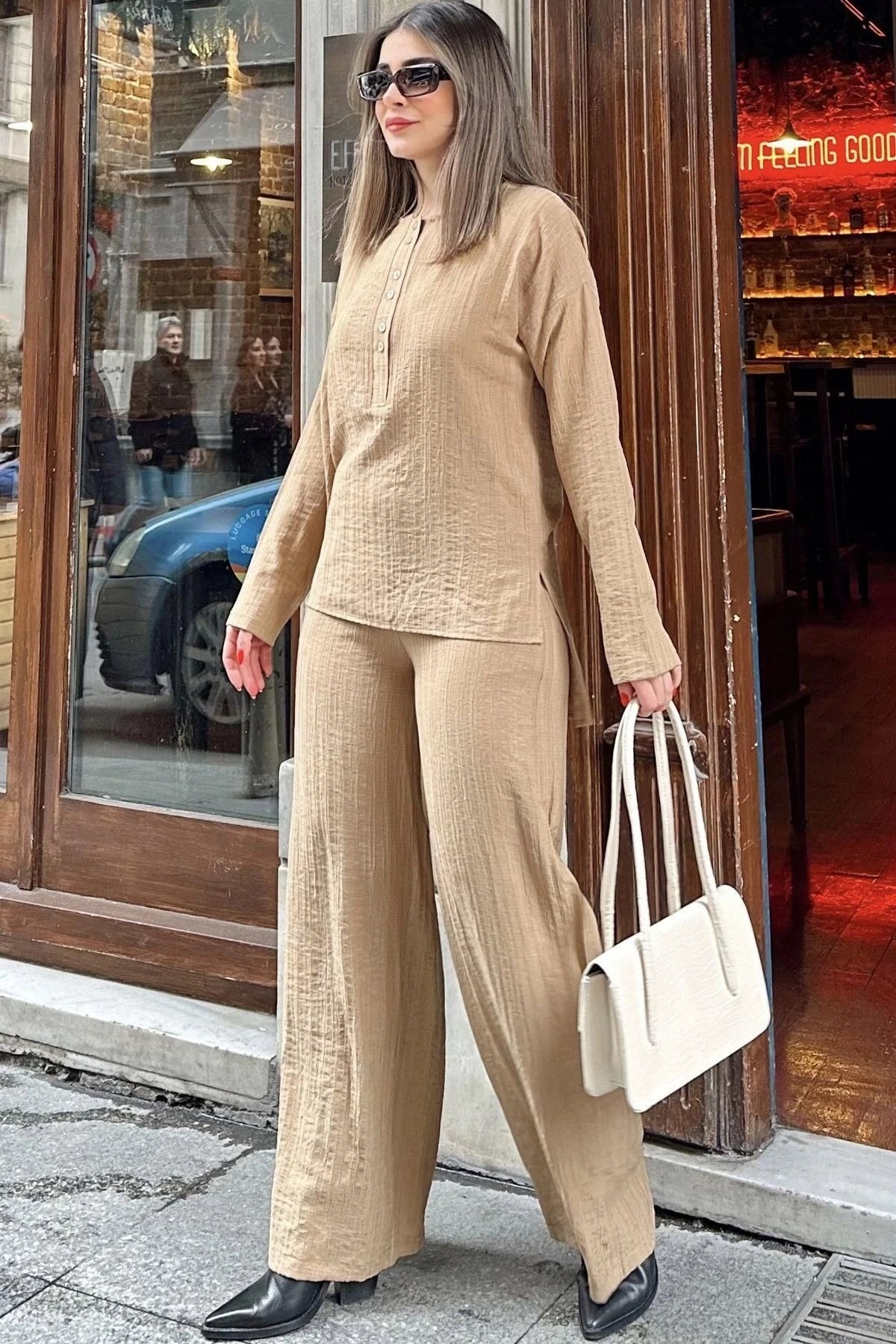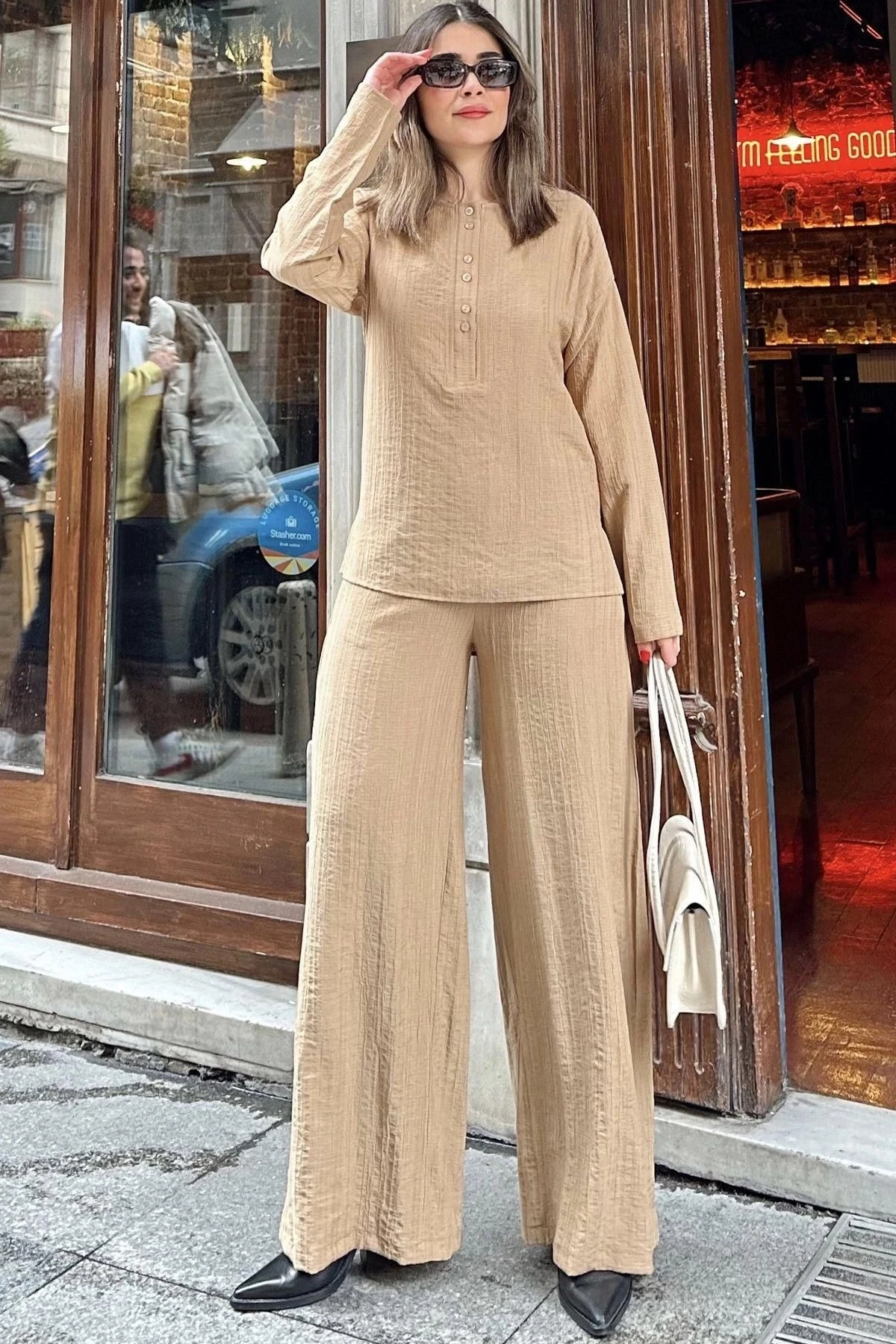 Kadın Camel Düğmeli Yuvarlak Yaka Bluz & Beli Lastikli Geniş Paça Pantolon - Salaş Maya Takım