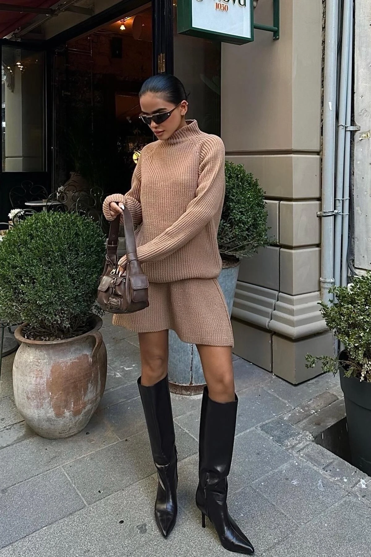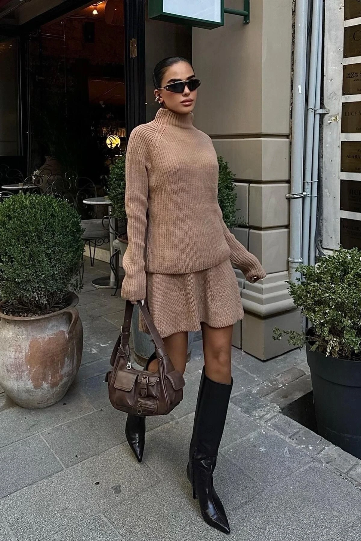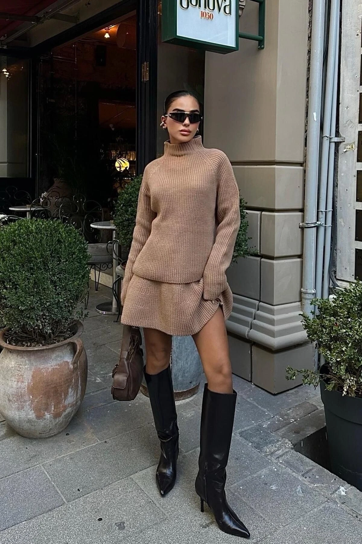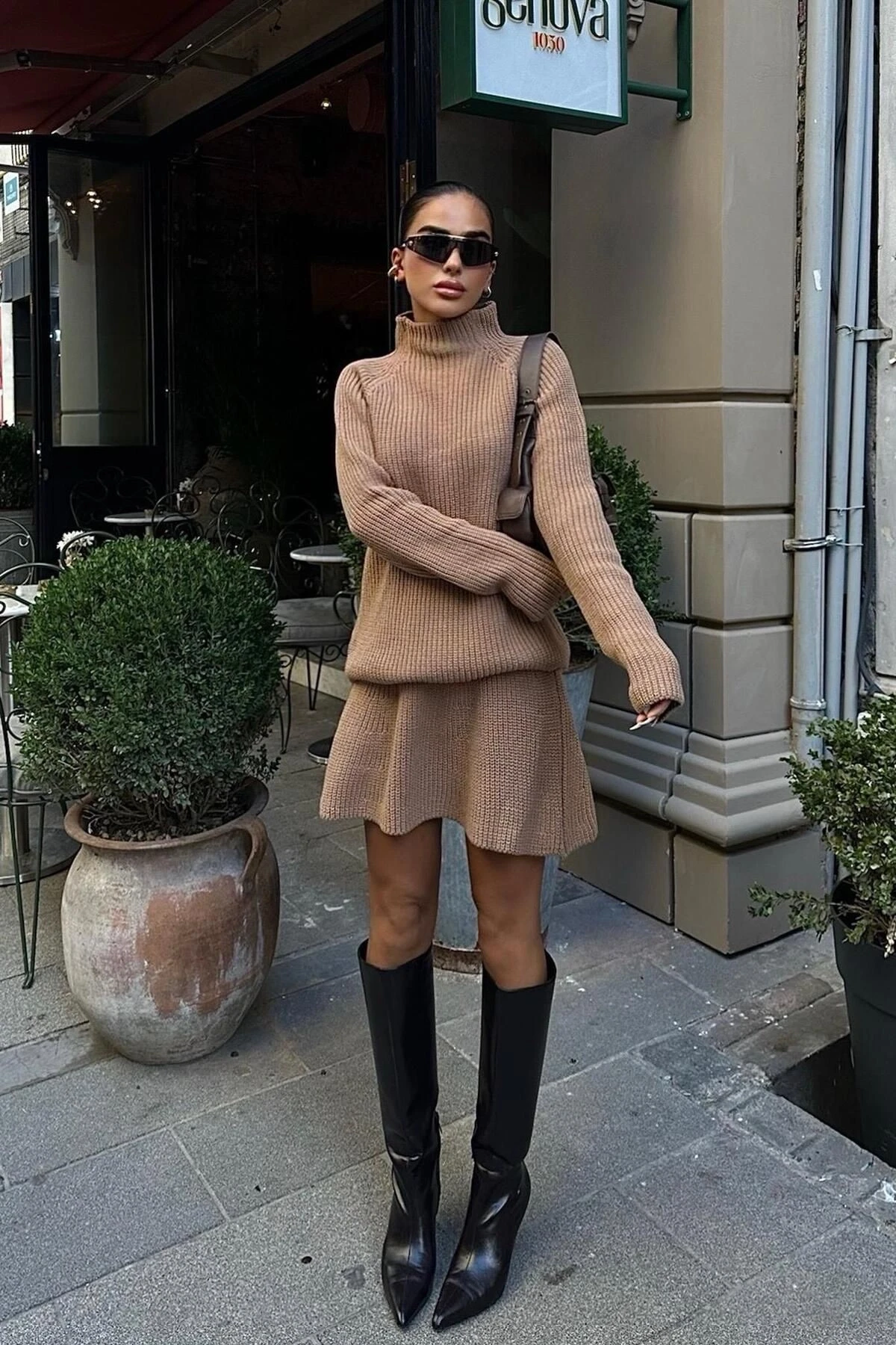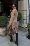 Kadın Camel Fitilli Dik Yaka Triko Kısa Takım