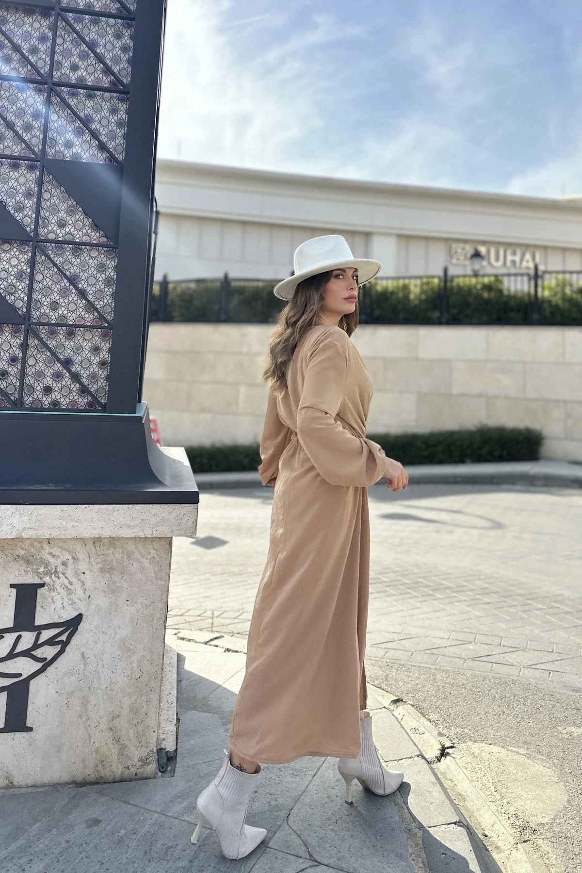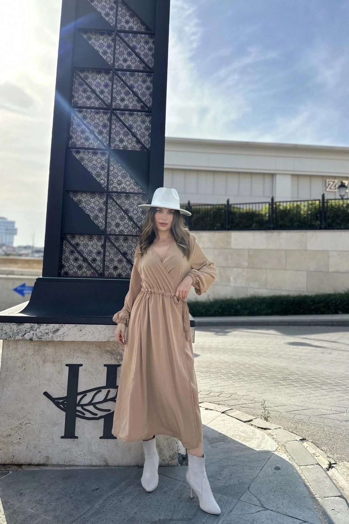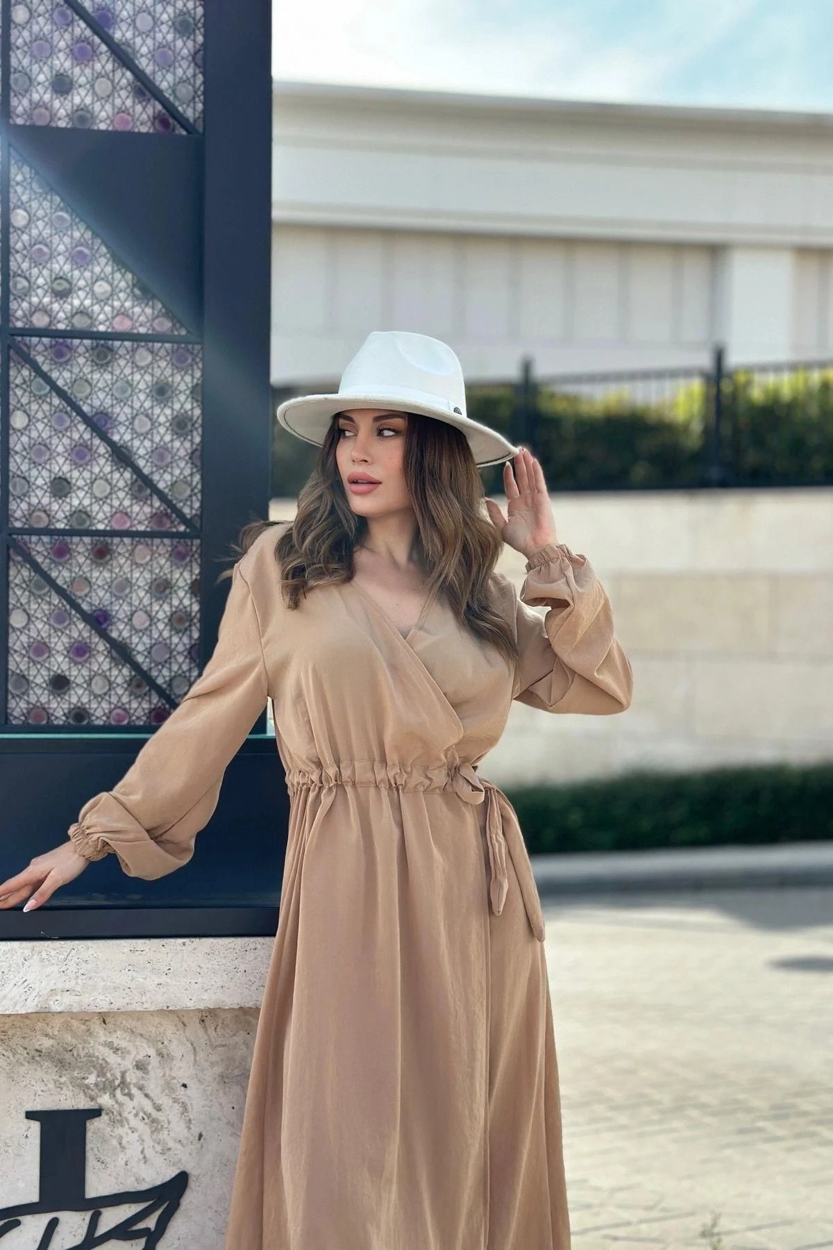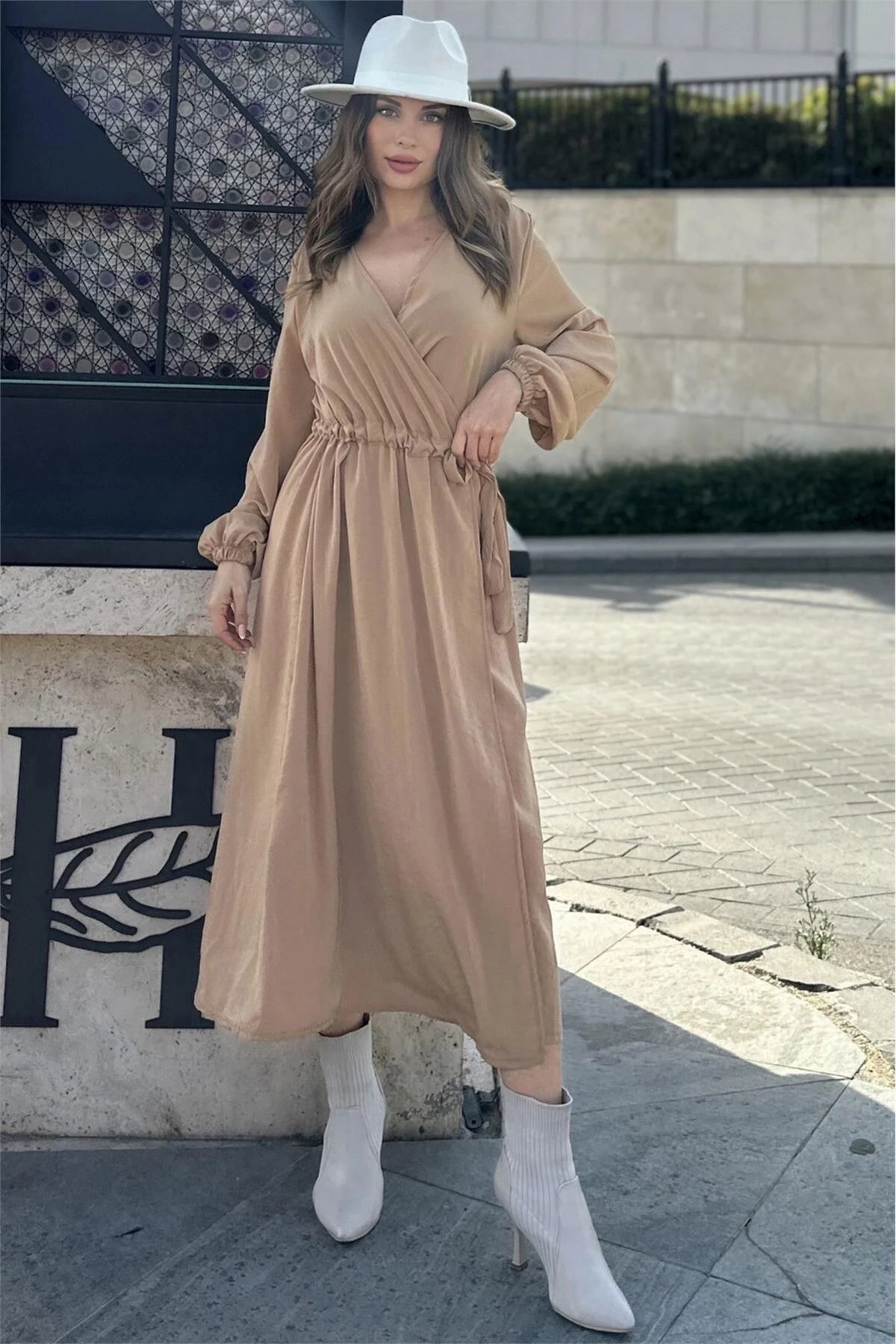 Kadın Camel Kruvaze Yaka, Yırtmaçlı, Beli Kuşaklı, Kol Bilekleri Lastikli, Salaş, Uzun Elbise