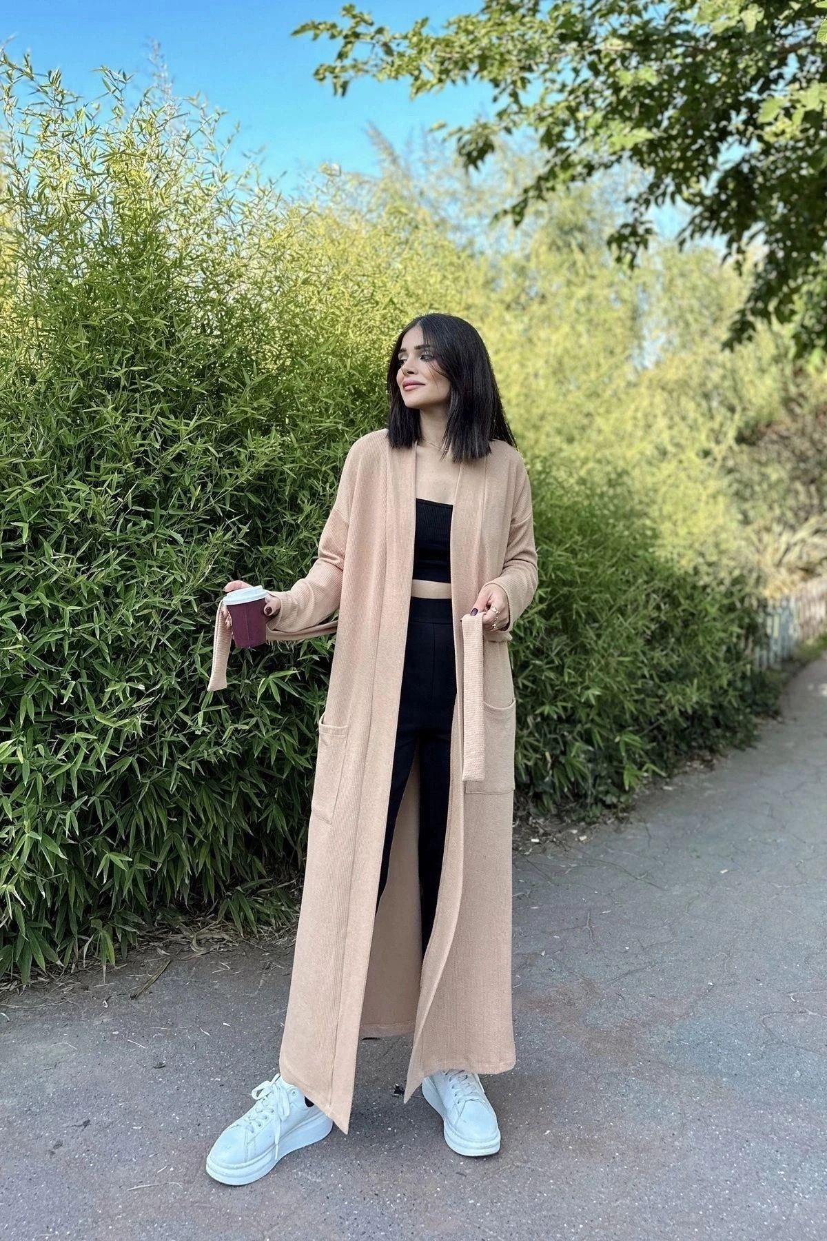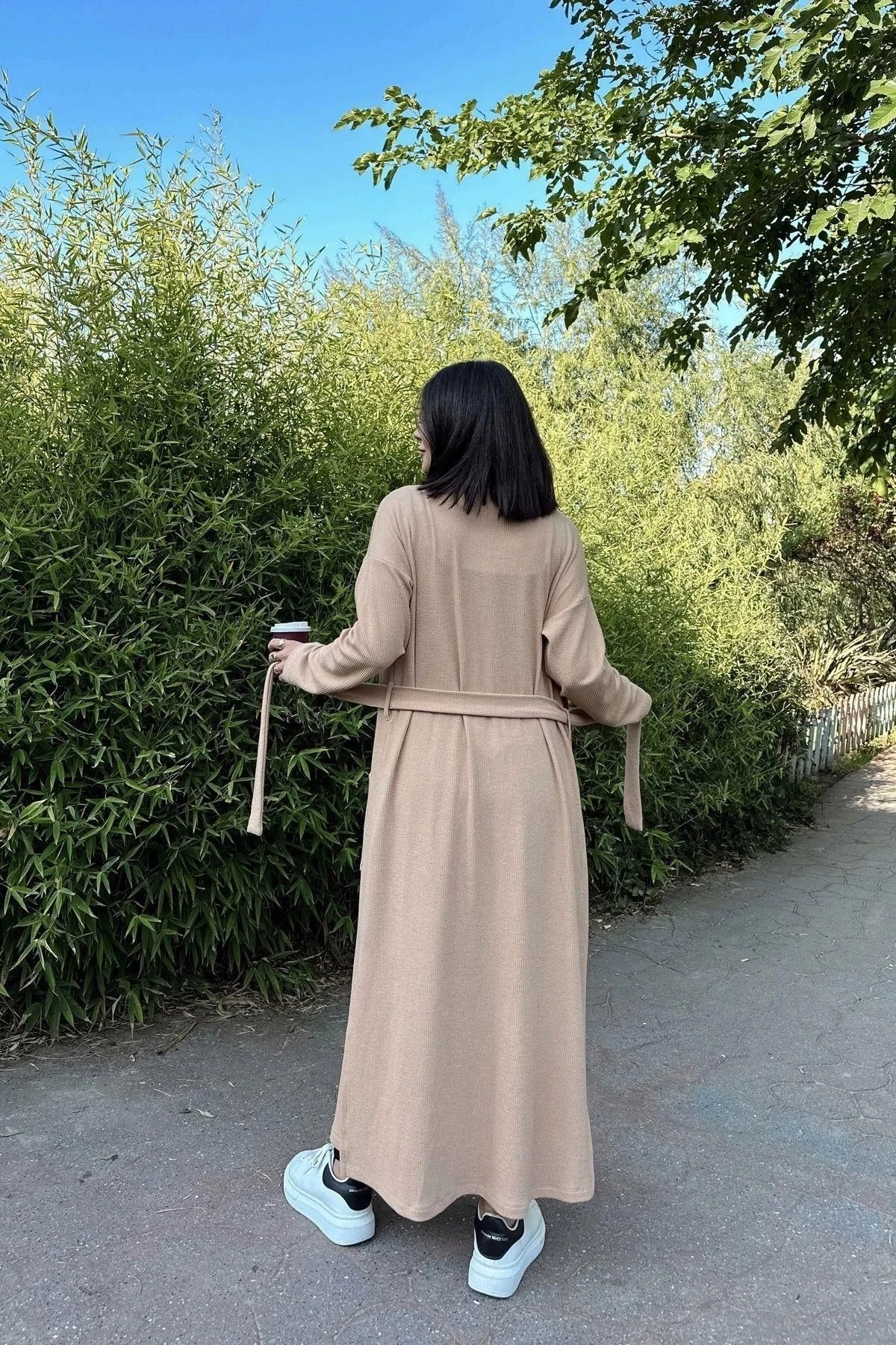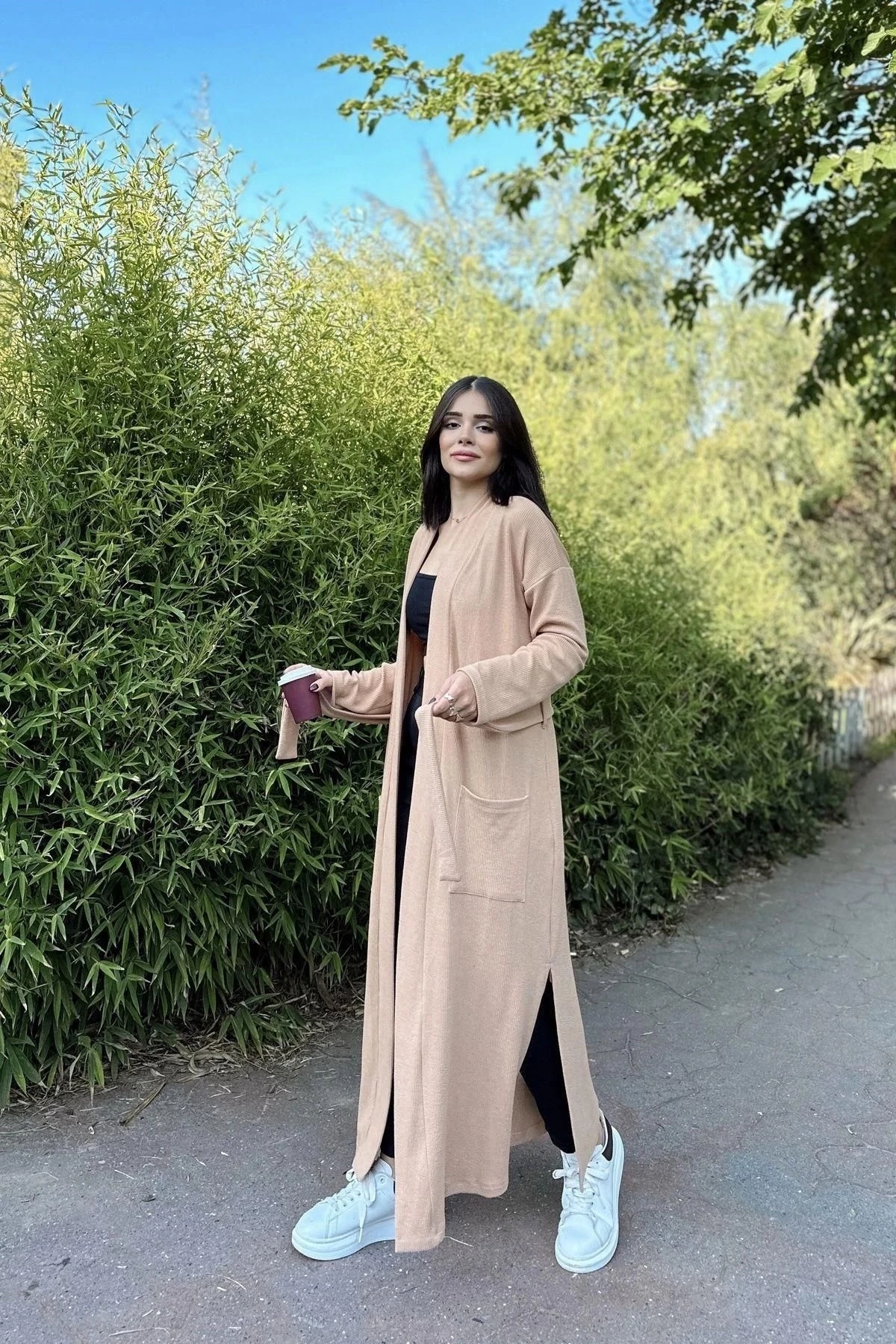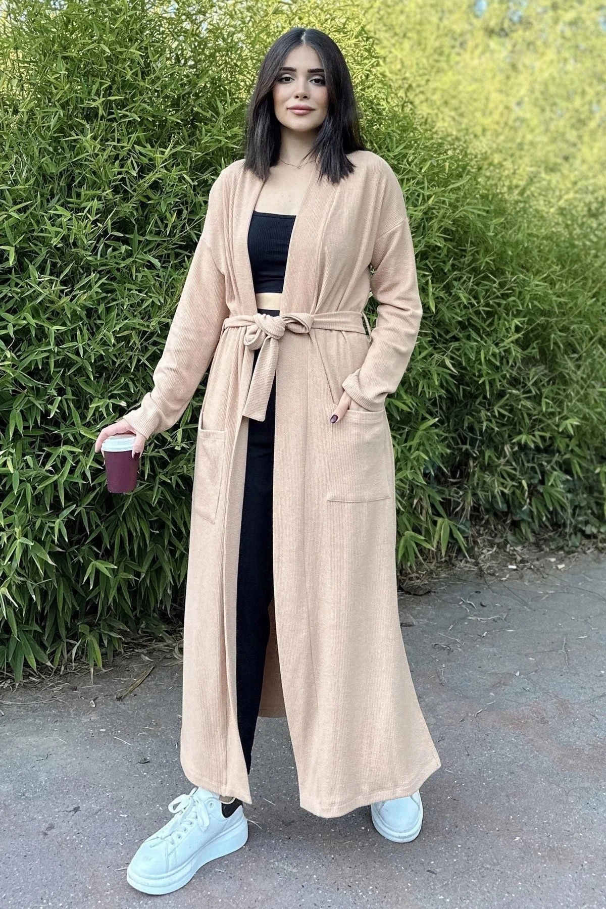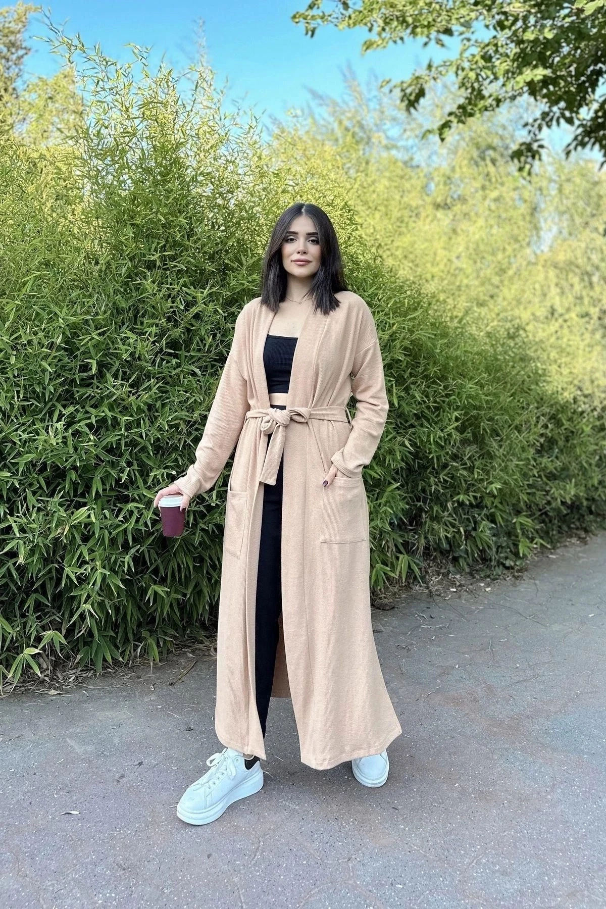 Kadın Camel Uzun Kol, Beli Kemerli, Düğmesiz, Çift Cepli, Uzun Örme Hırka