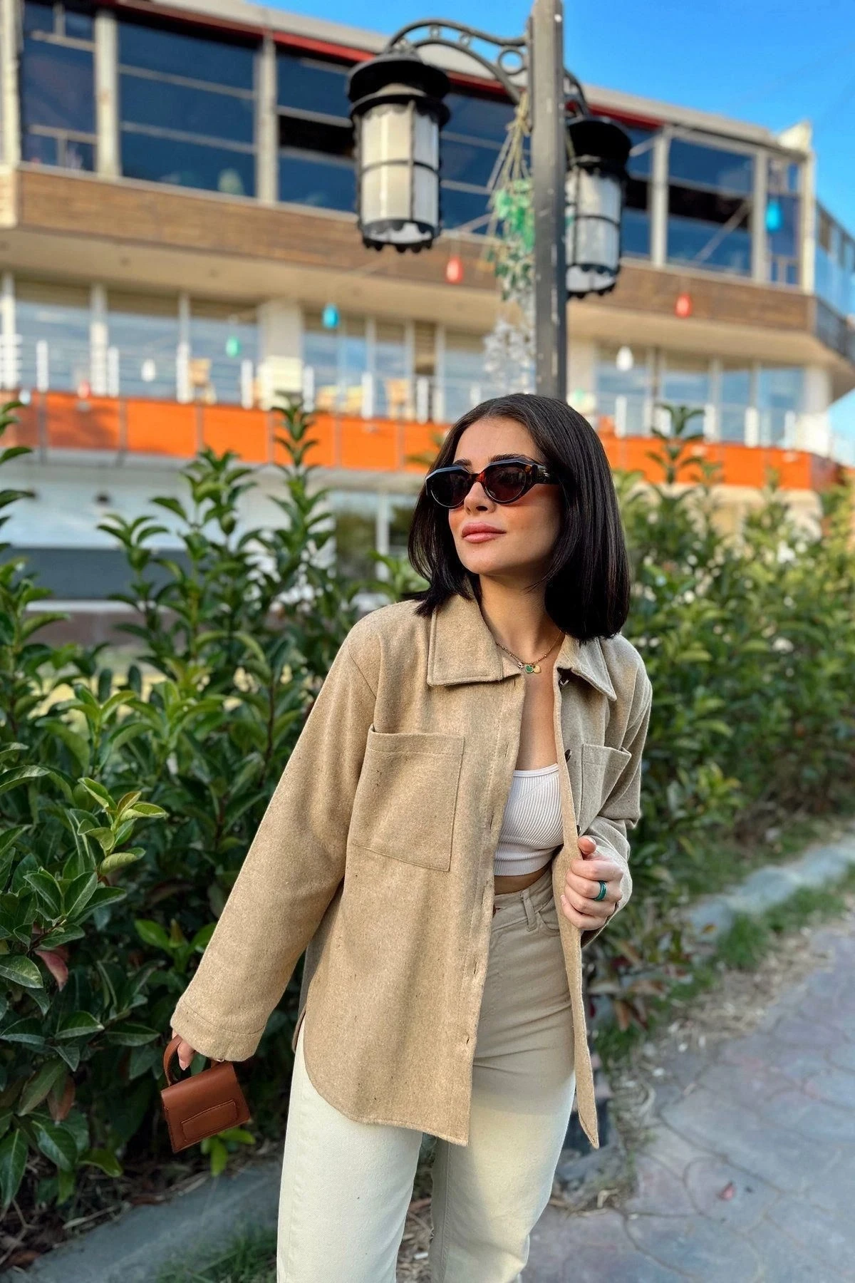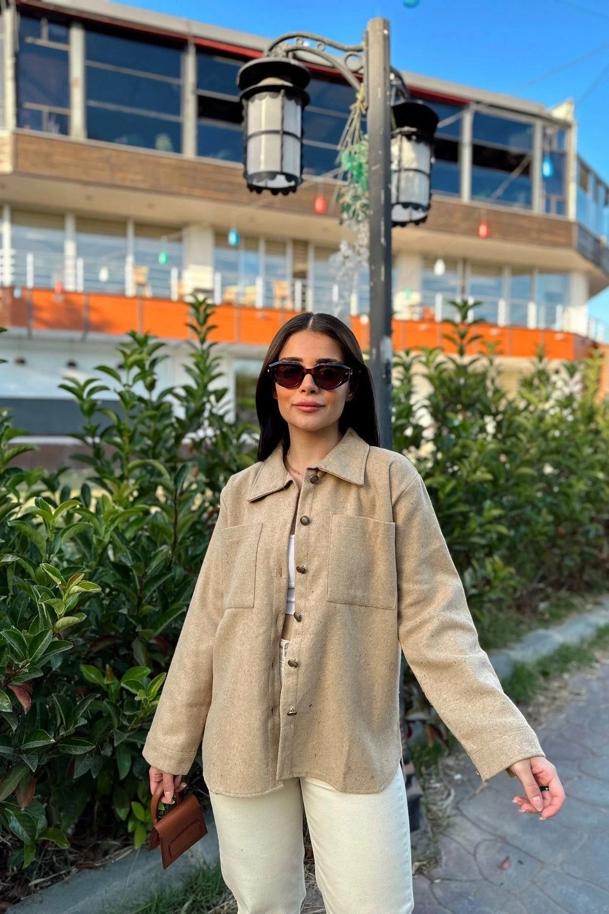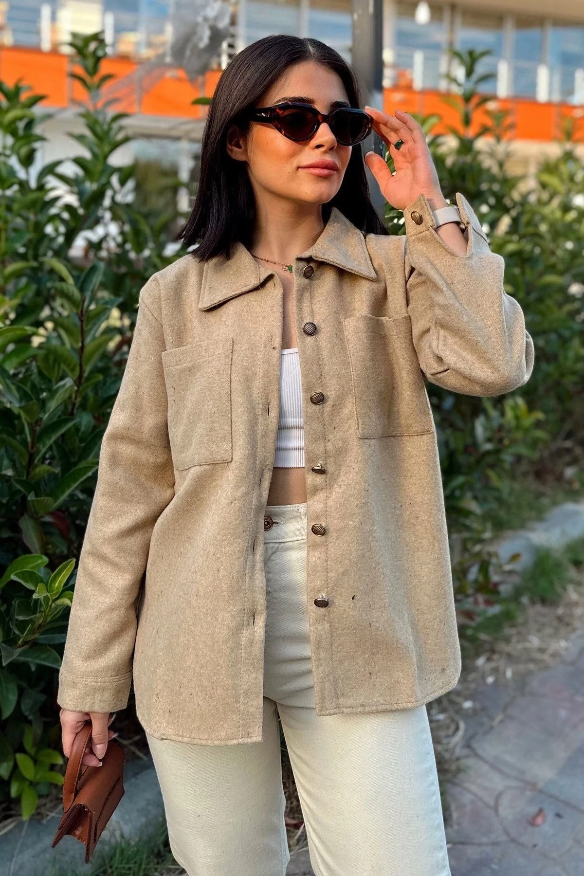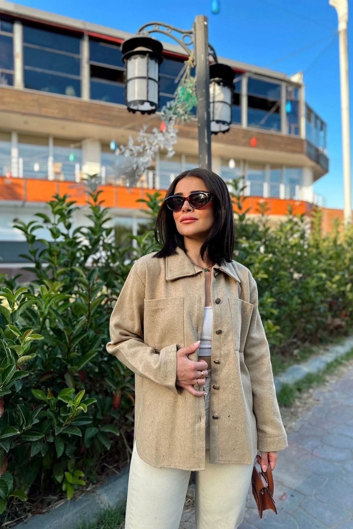 Kadın Camel Uzun Kol, Çift Cepli, Eteği Oval Kesim, Kaşe Gömlek Ceket