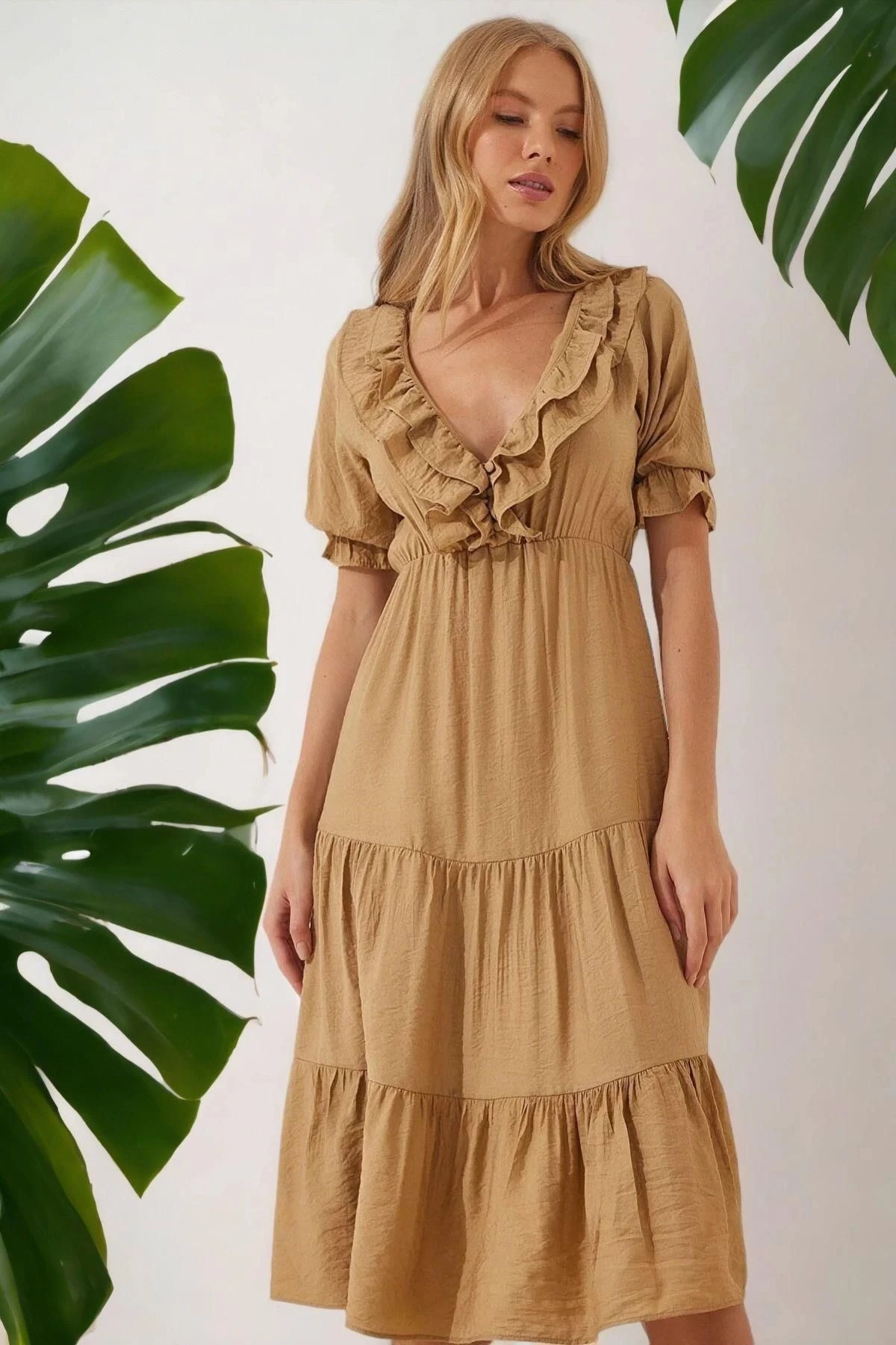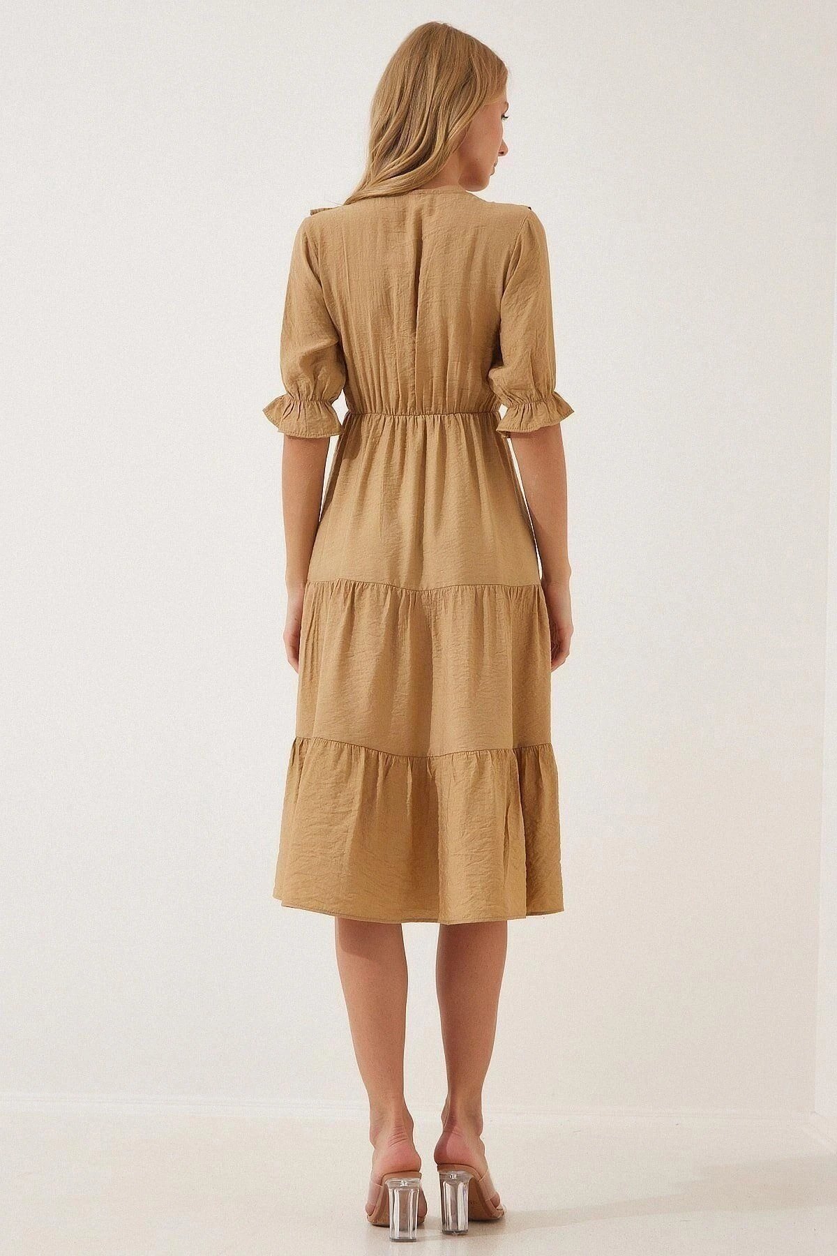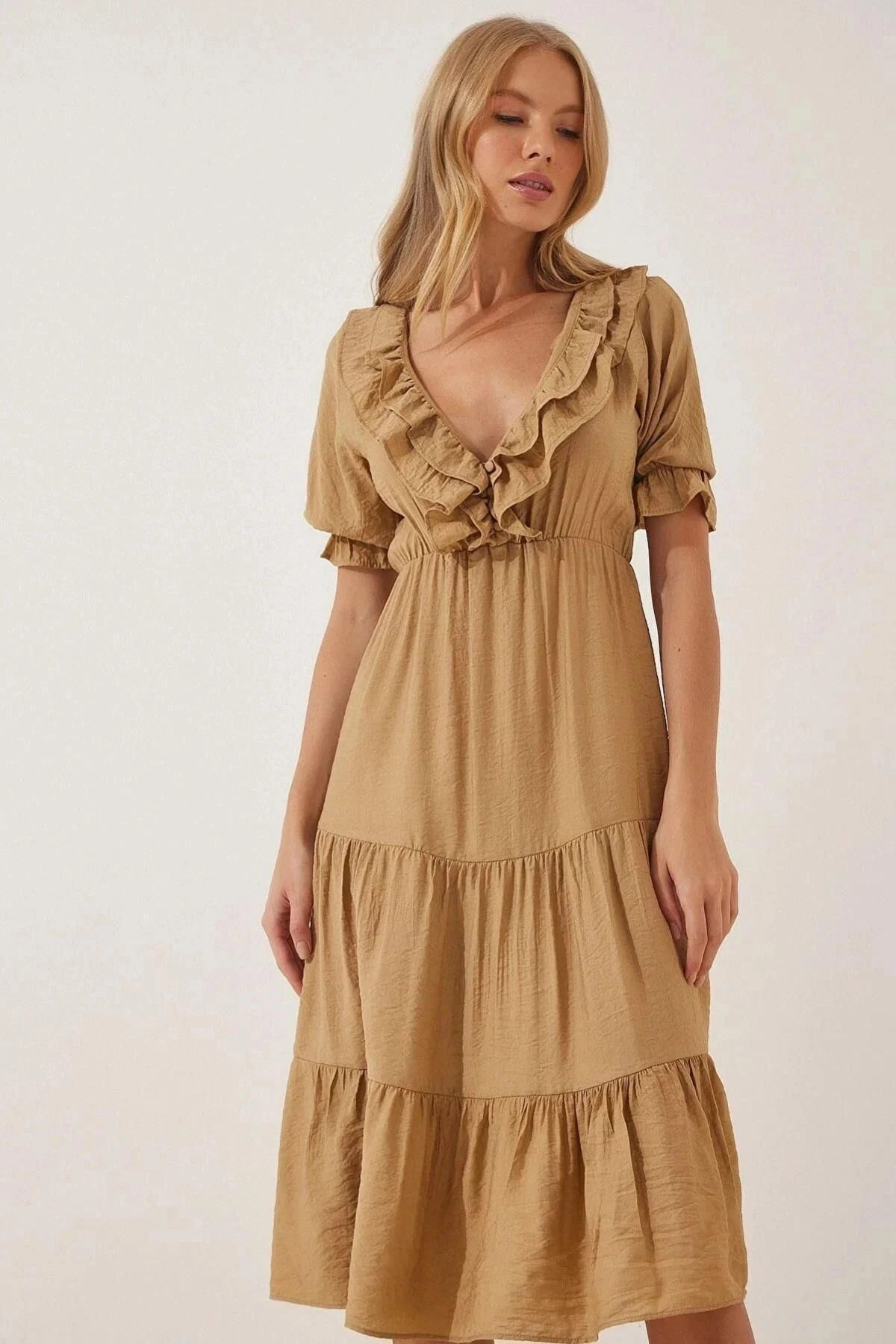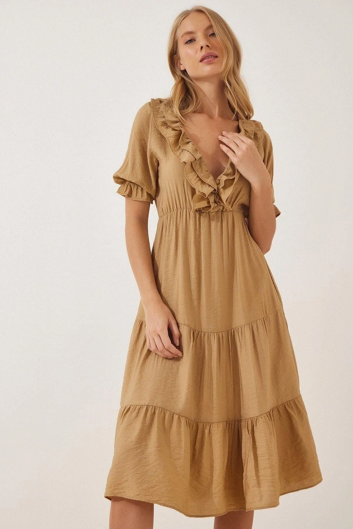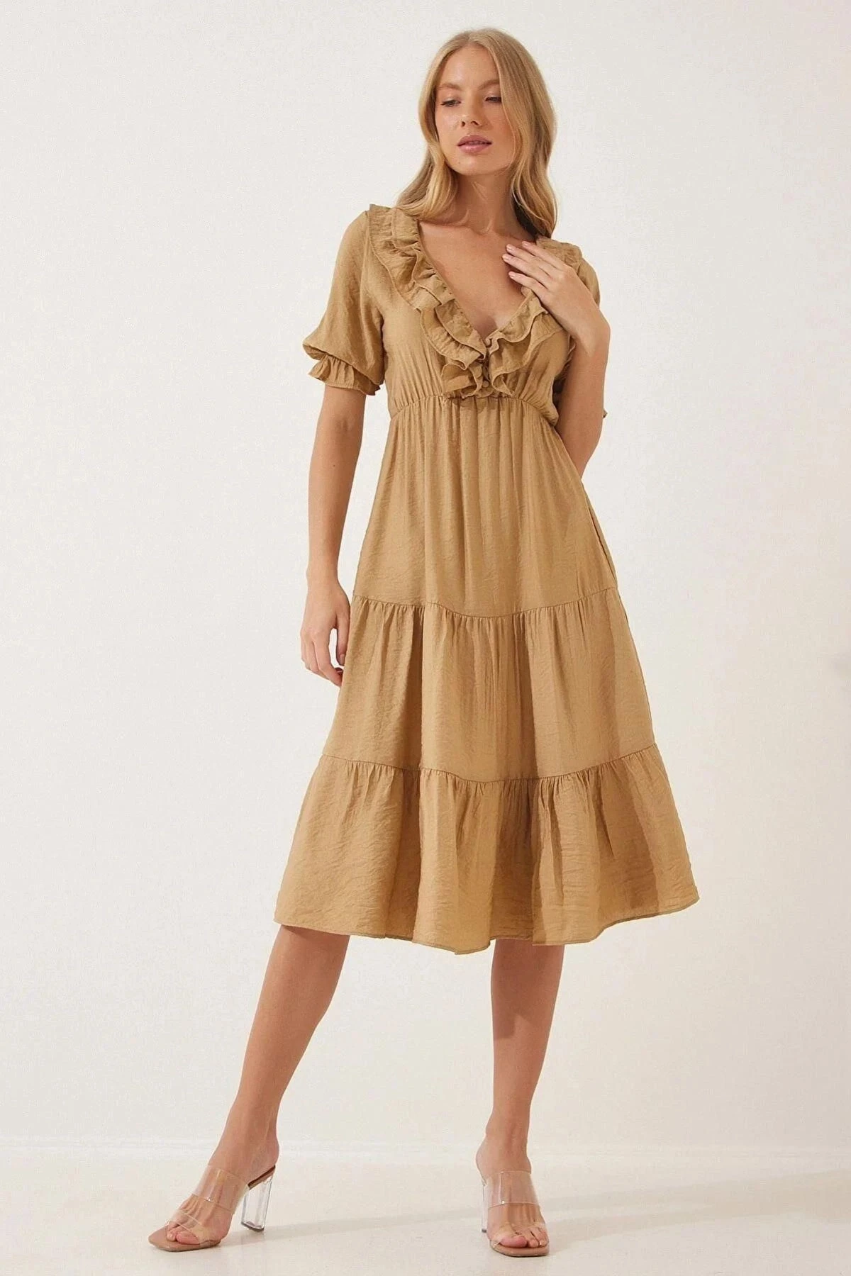 Bu Camel Renk V Yaka, Yarım Kol, Fırfırlı Elbise, sizi hem ofis hem de günlük hayatta şık ve zarif bir görünüme kavuşturacak.; Elbisenin kolları lastiklidir, bu sayede size tam uyum sağlar ve rahat bir kullanım sunar.; Etek kat detayı, elbiseye hareketli bir hava katarken, kesimi sayesinde orta boyda ve diz üstünde bir uzunluğa sahiptir.; Kaliteli kumaş yapısı sayesinde bu elbise, uzun süreli kullanımlar için mükemmel bir seçimdir.; %100 polyesterden üretilmiştir, böylece dayanıklı, hafif ve kolay bakım sağlar.; Kumaşın pürüzsüz dokusu, elbisenin üzerinde güzel bir akış yaratır.; Renk olarak camel tonu, klasik ve sofistike bir seçimdir.; Hem günlük hem de resmi ortamlarda kolaylıkla kombinleyebilirsiniz.; V yaka tasarımı, boynunuzu zarif bir şekilde vurgularken, yarım kollu kesimi de rahatlık ve şıklığı bir araya getirir.; Fırfır detayları, elbisenin feminin bir dokunuş kazanmasını sağlar.; Bu elbise, iş yerindeki profesyonel görüntünüzü tamamlayacak ve aynı zamanda sosyal aktivitelerde de şık bir tercih olacaktır.; Çok yönlü kullanımıyla gardırobunuzun vazgeçilmez parçası olacak olan bu elbise, her zaman şıklığınızı ön plana çıkaracak.