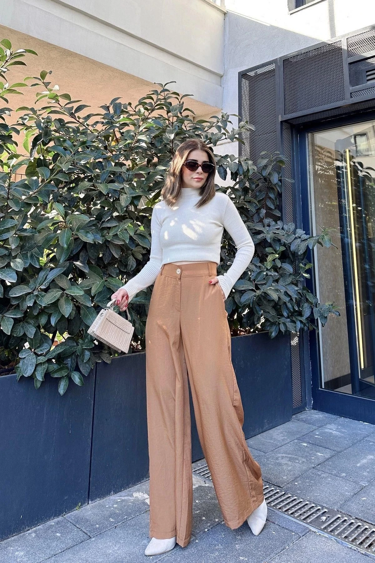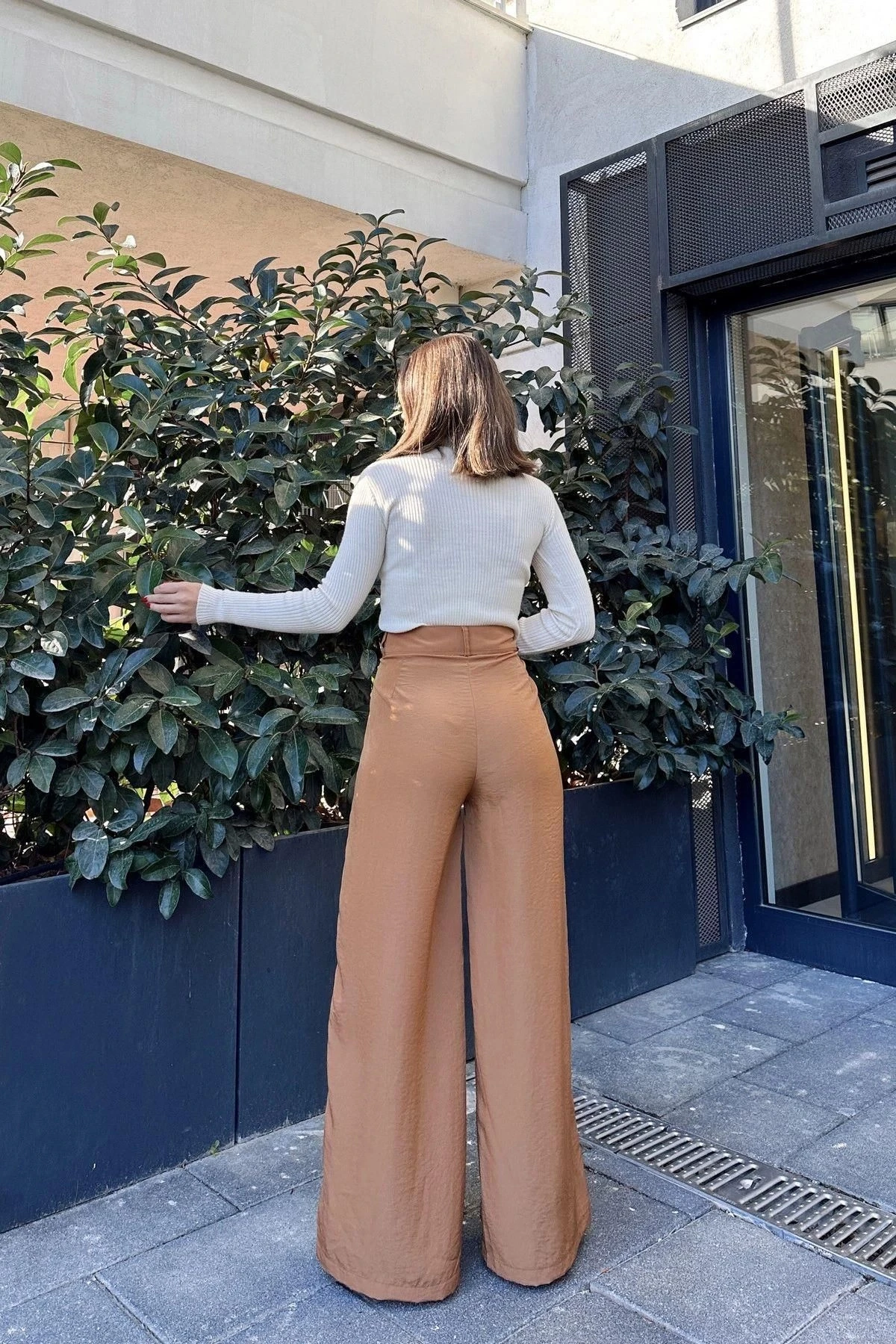 Kadın Camel Yüksek Bel, Cepli, Bol Paça Pantolon