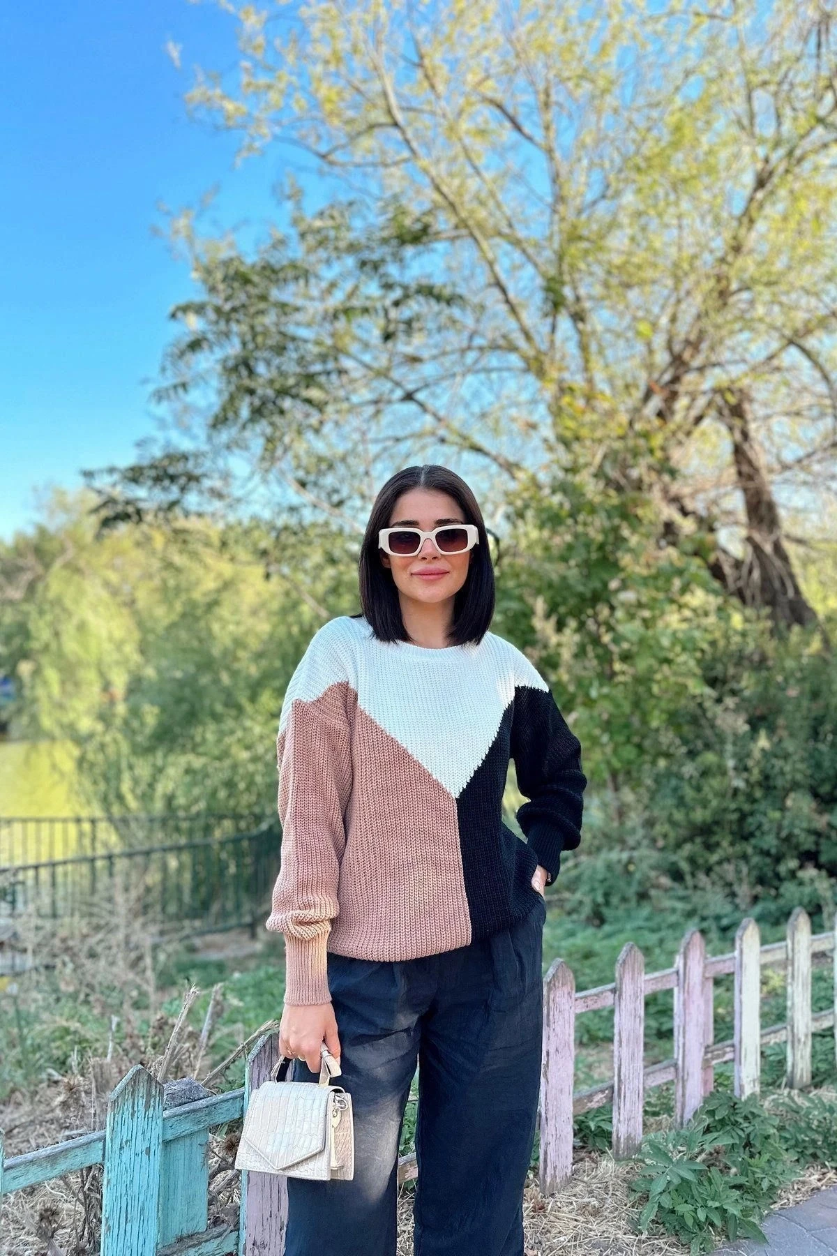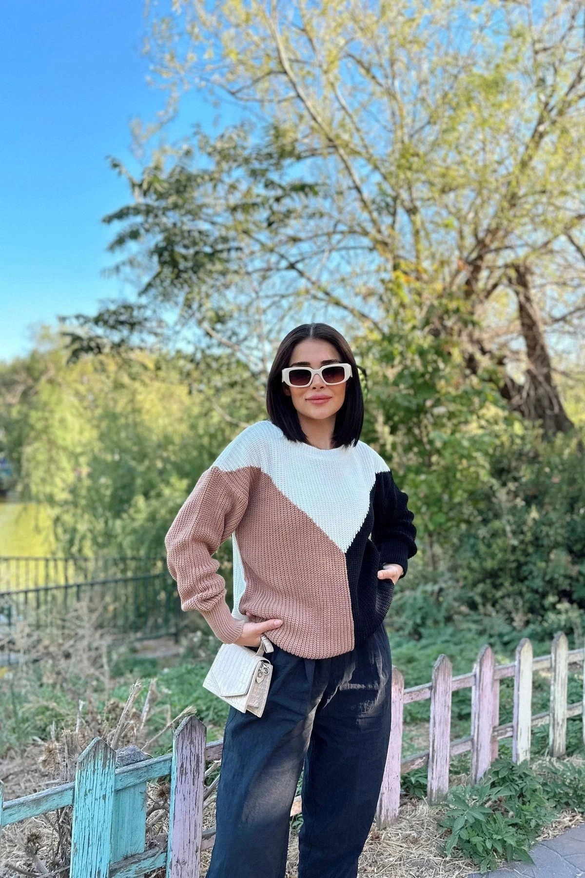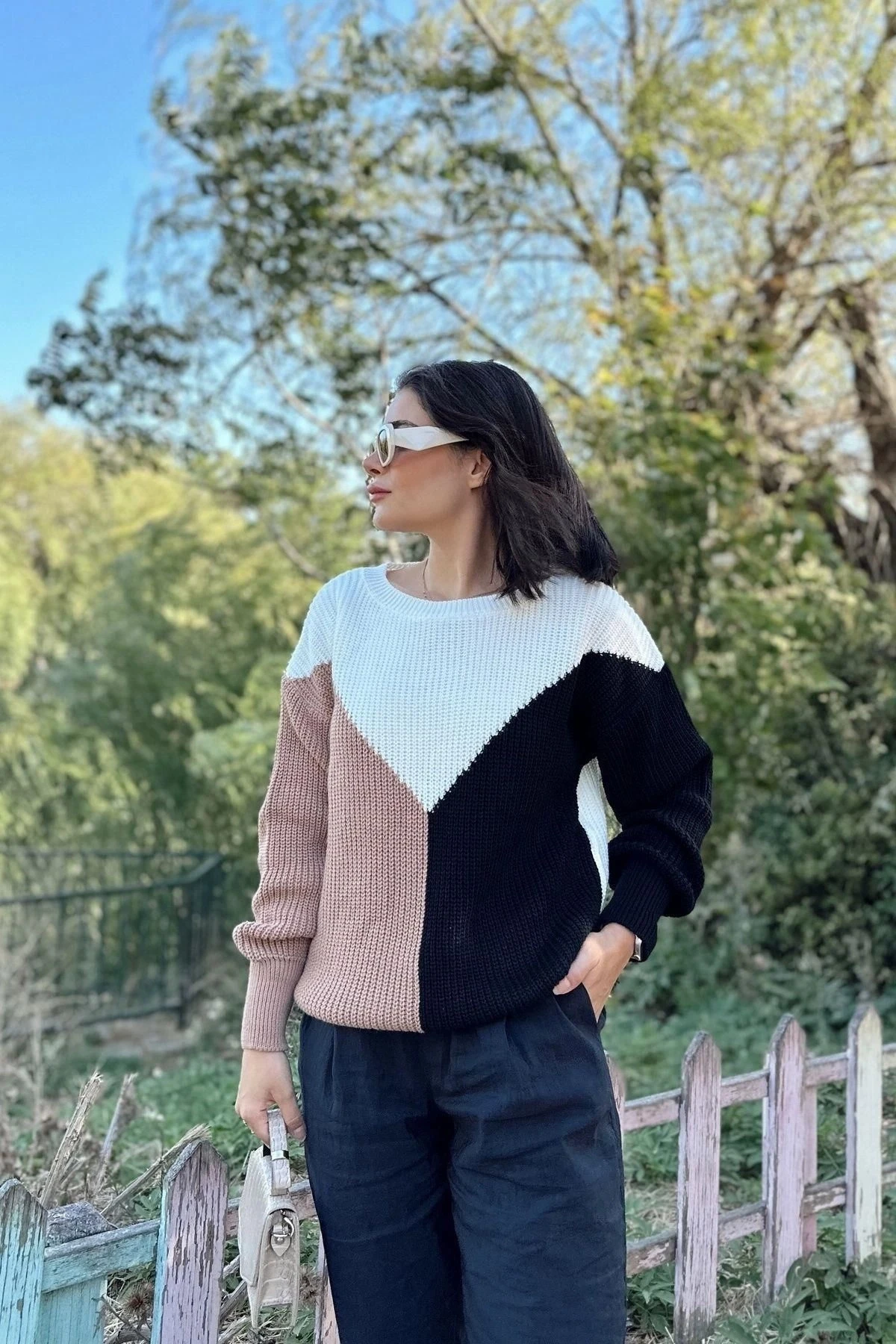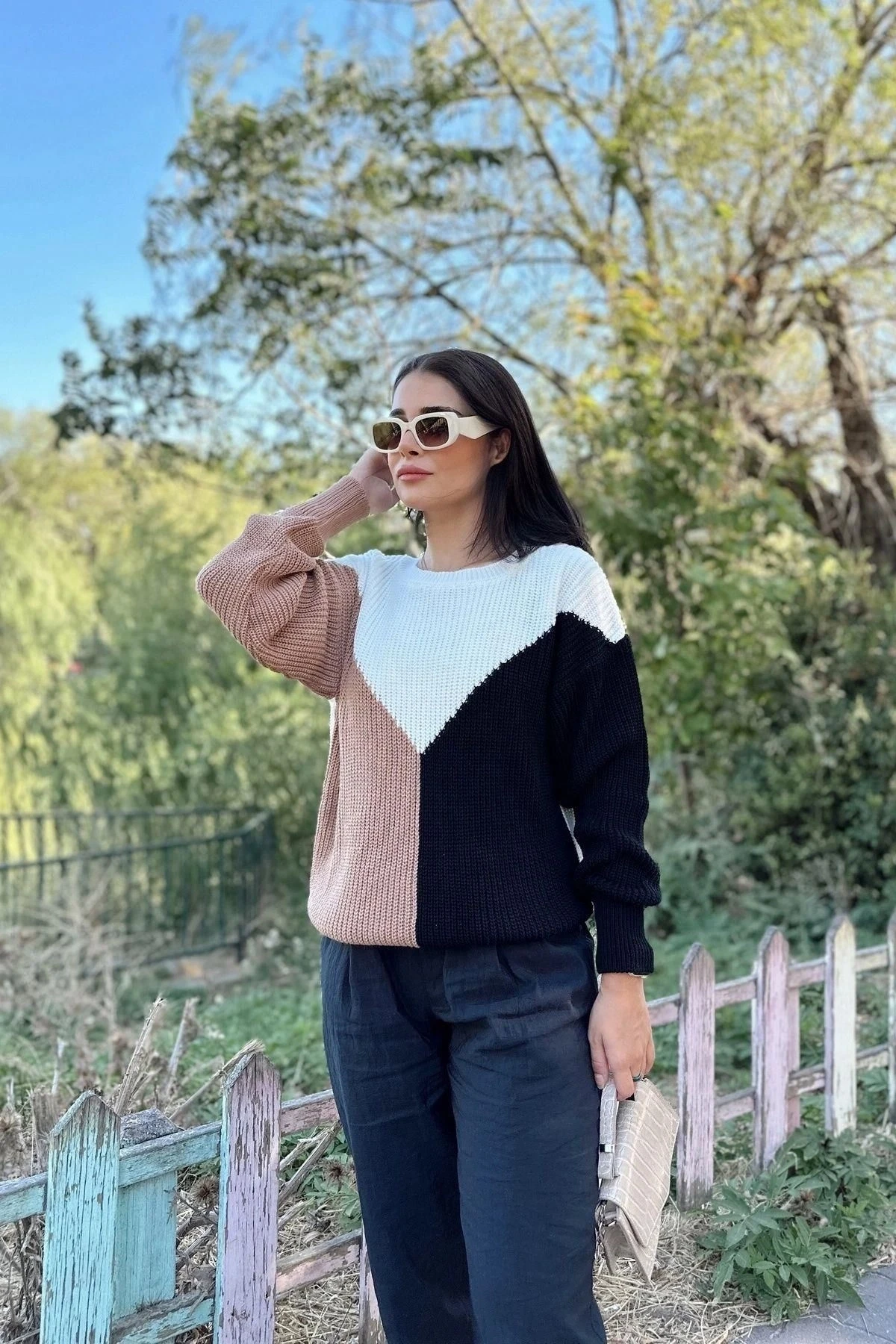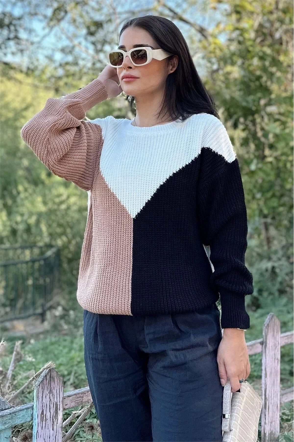 Kadın Camel Yuvarlak Yaka, Renk Bloklu, Uzun Kol, Yumuşak Dokulu Triko Kazak