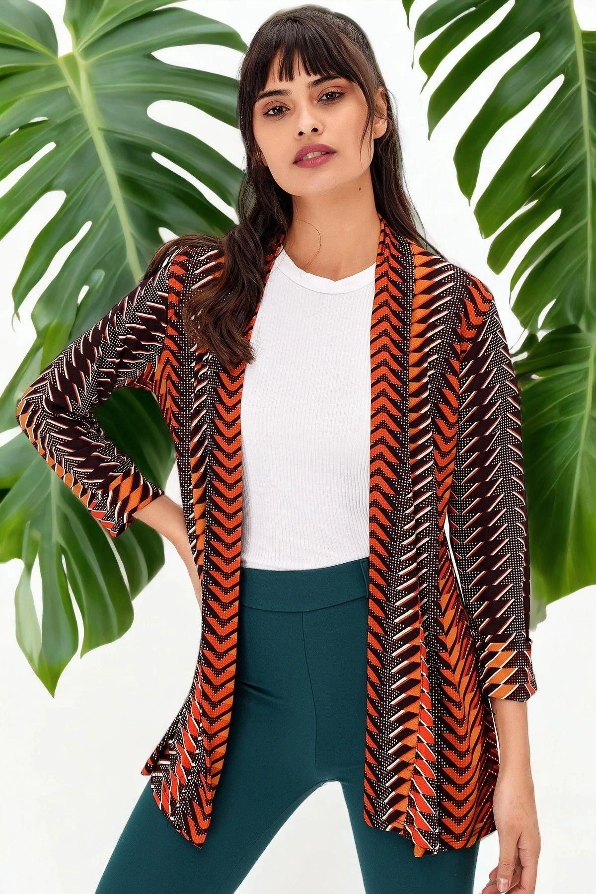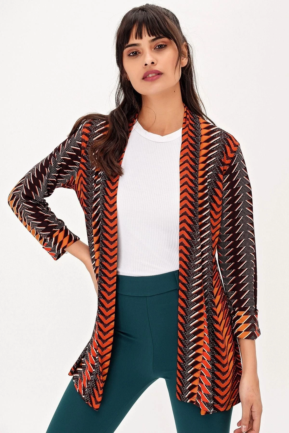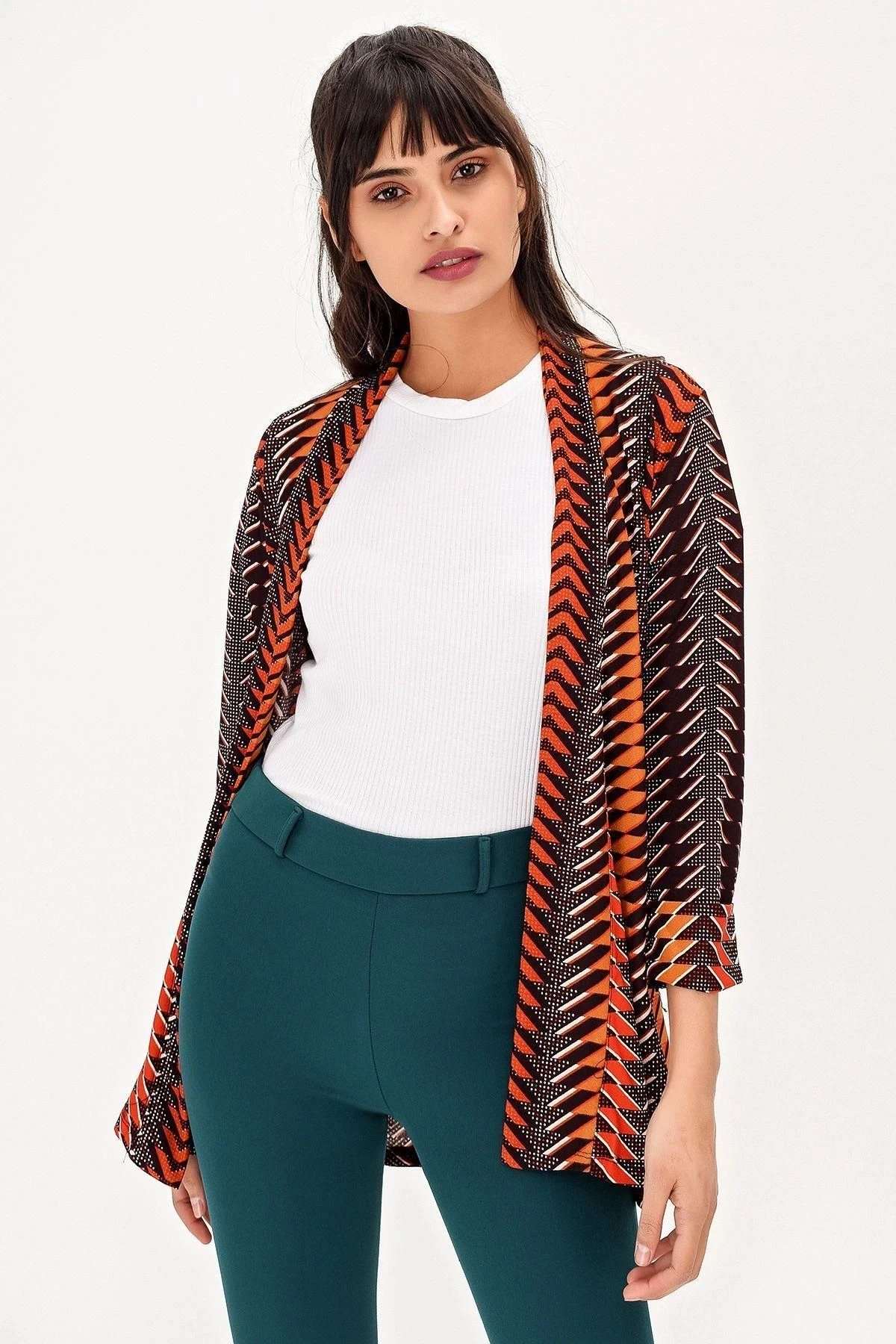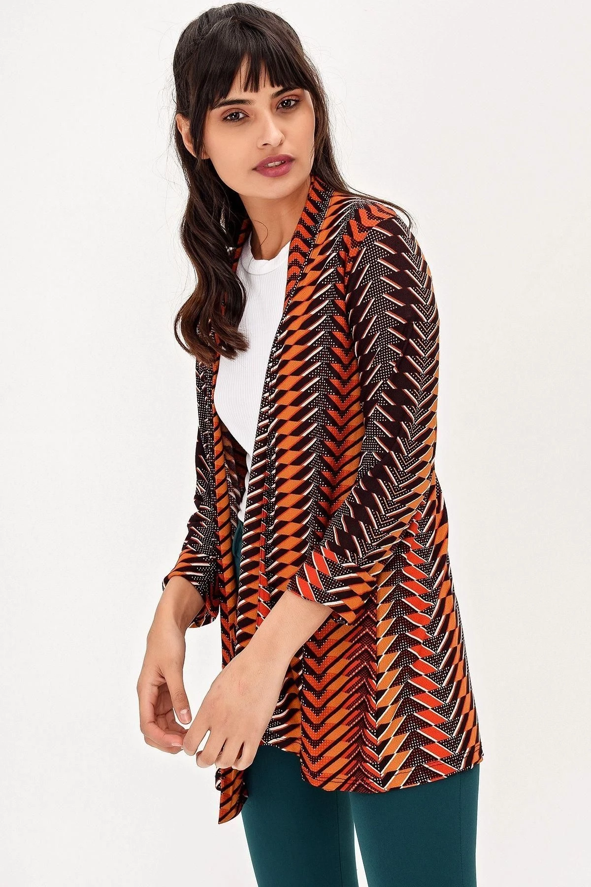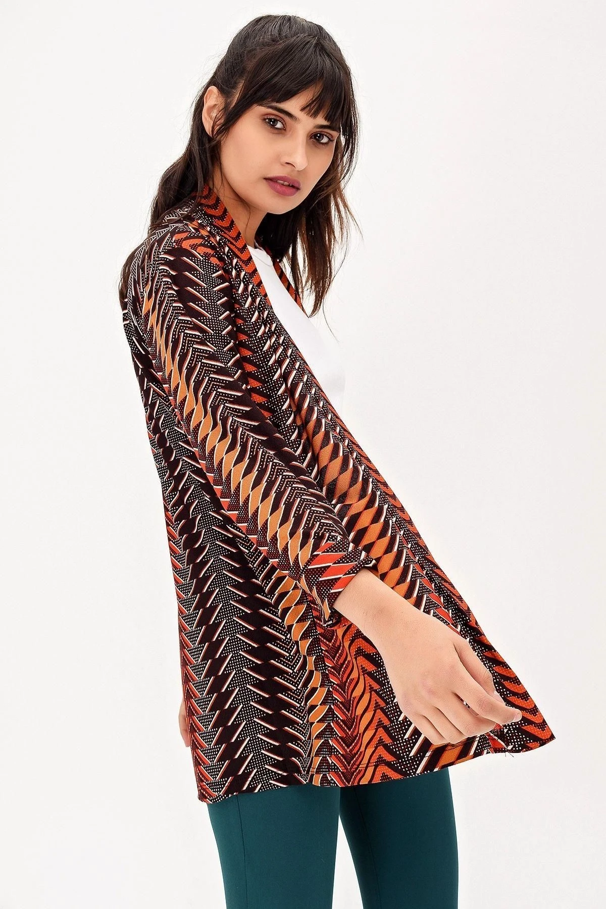 Kadın Çok Renkli Ceket Yaka Truvakar Kol Desenli Çok Renkli Regular Kesim Standart Boy Kimono Ceket