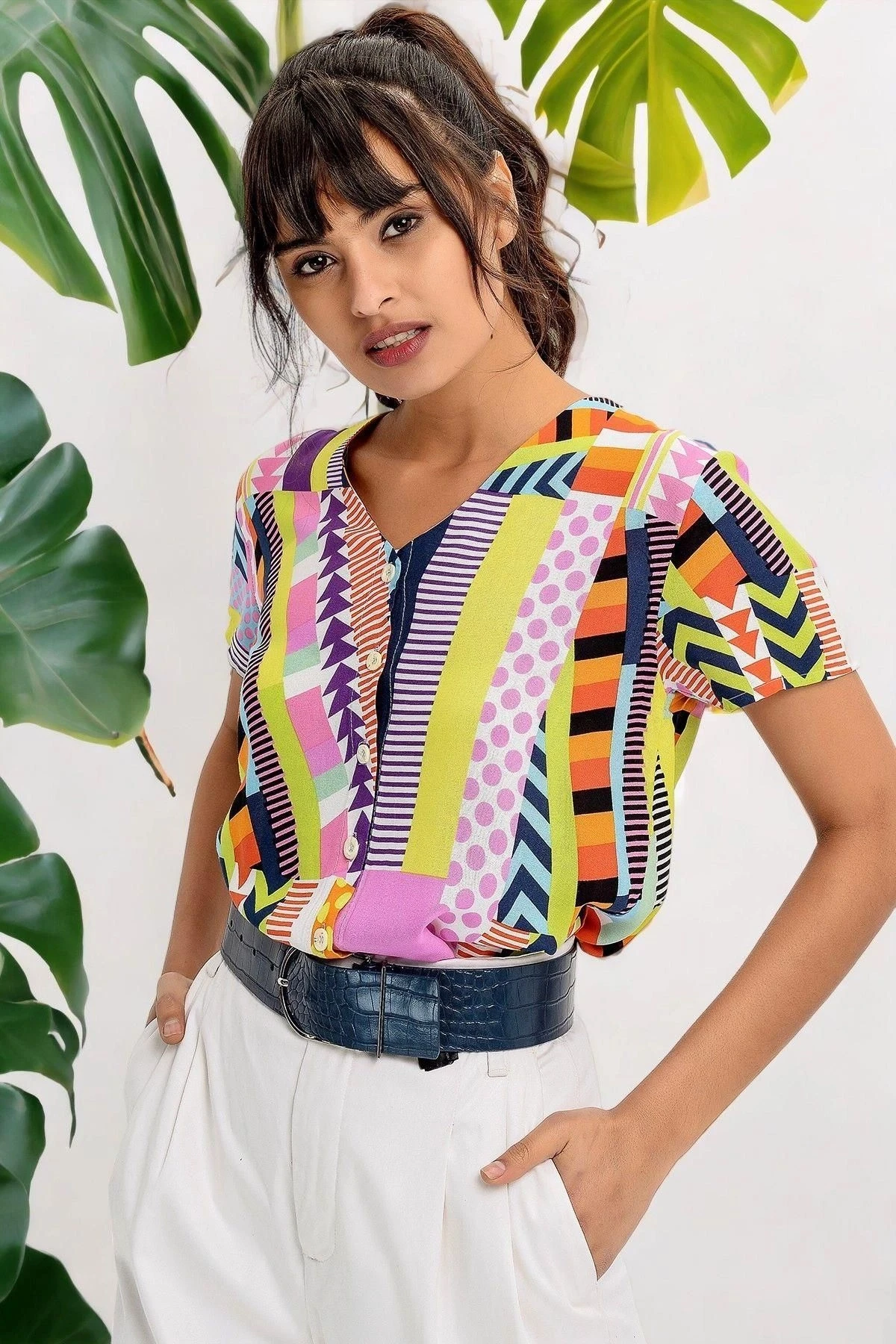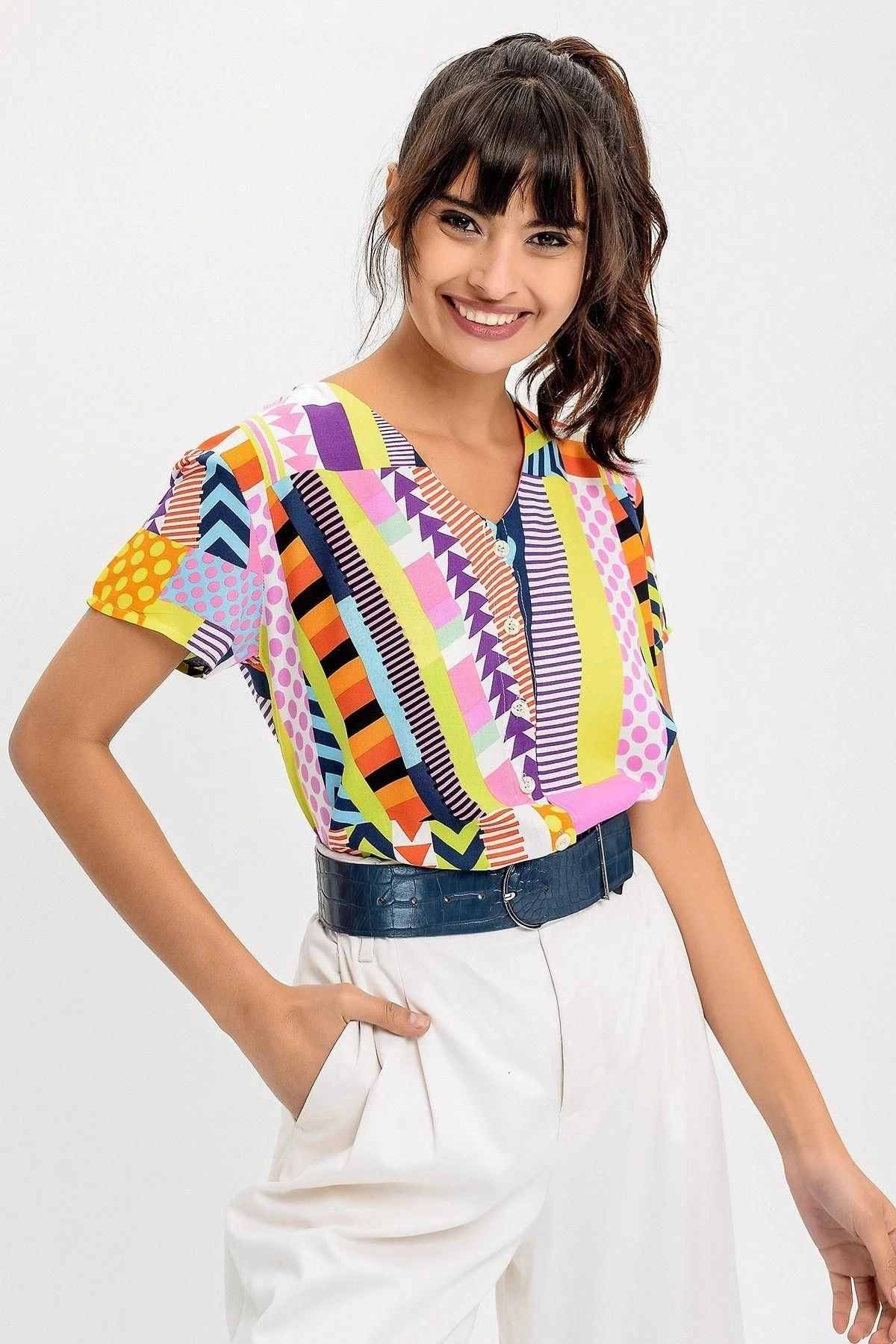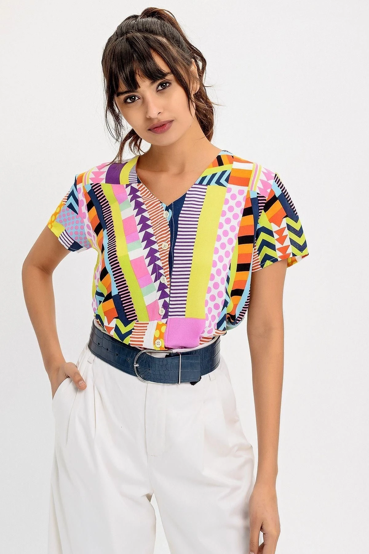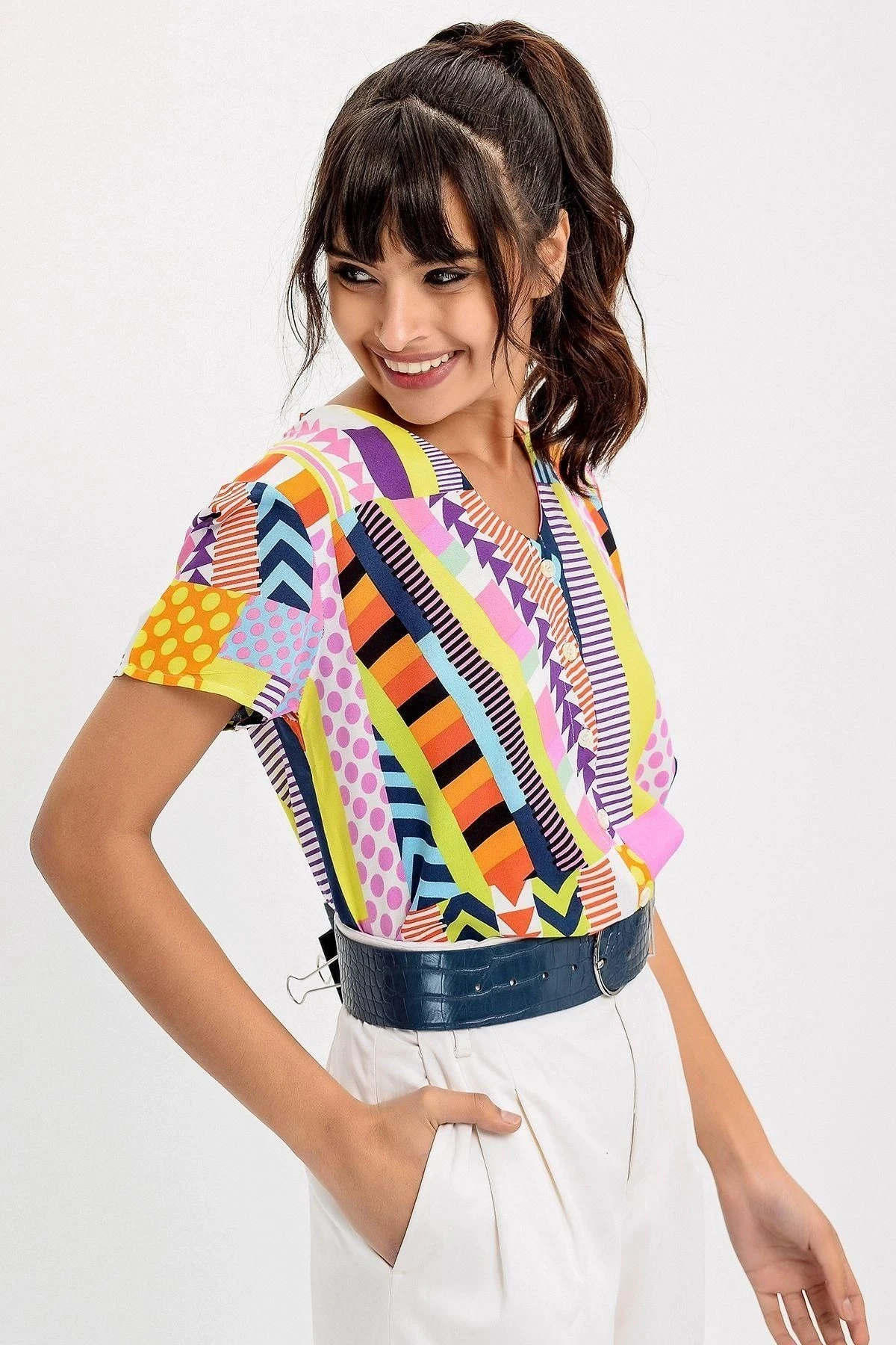 Bu muhteşem kısa kollu gömlek, benzersiz ve canlı renkli grafik desenleriyle dikkat çeken bir parçadır.; Farklı renklerin harmonisiyle tasarlanmış bu gömlek, tarzınıza ve kişiliğinize enerji katacak.; Gömleğimizin düz kesimi ve standart boyu, rahat bir şekilde giyilebilir ve her bedene uyum sağlar.; %100 polyester kumaştan üretilen bu gömlek, dayanıklı, yumuşak ve nefes alabilen bir yapıya sahiptir.; Bu özellikler sayesinde gün boyu konforlu bir şekilde kullanabilirsiniz.; Grafik desenler, gömleğin ana odak noktasıdır.; Canlı renkler ve özgün tasarımlarla bezenmiş olan bu desenler, gömleğin öne çıkmasını sağlar.; Moda trendlerini takip eden birisiyseniz, bu gömlek sizin için mükemmel bir seçim olacaktır.; Bu gömlek, herhangi bir kıyafetinize kolayca uyum sağlayabileceği için çok yönlü bir parçadır.; Spor bir şortla veya kot pantolonla rahat bir görünüm elde edebilirsiniz.; Şık bir görünüm için chino pantolon veya etekle kombinleyebilirsiniz.; İster gündüz ister gece, bu gömlekle her zaman tarzınızı yansıtabilirsiniz.; Kısacası, bu çok renkli, grafik desenli kısa kol gömlek, hem stil sahibi olmanızı sağlayacak hem de size konforlu bir giyim deneyimi sunacaktır.; %100 polyester kumaşı, canlı renkleri ve özgün tasarımıyla dikkat çeken bu gömlek, gardırobunuzun vazgeçilmez parçalarından biri olmaya aday!