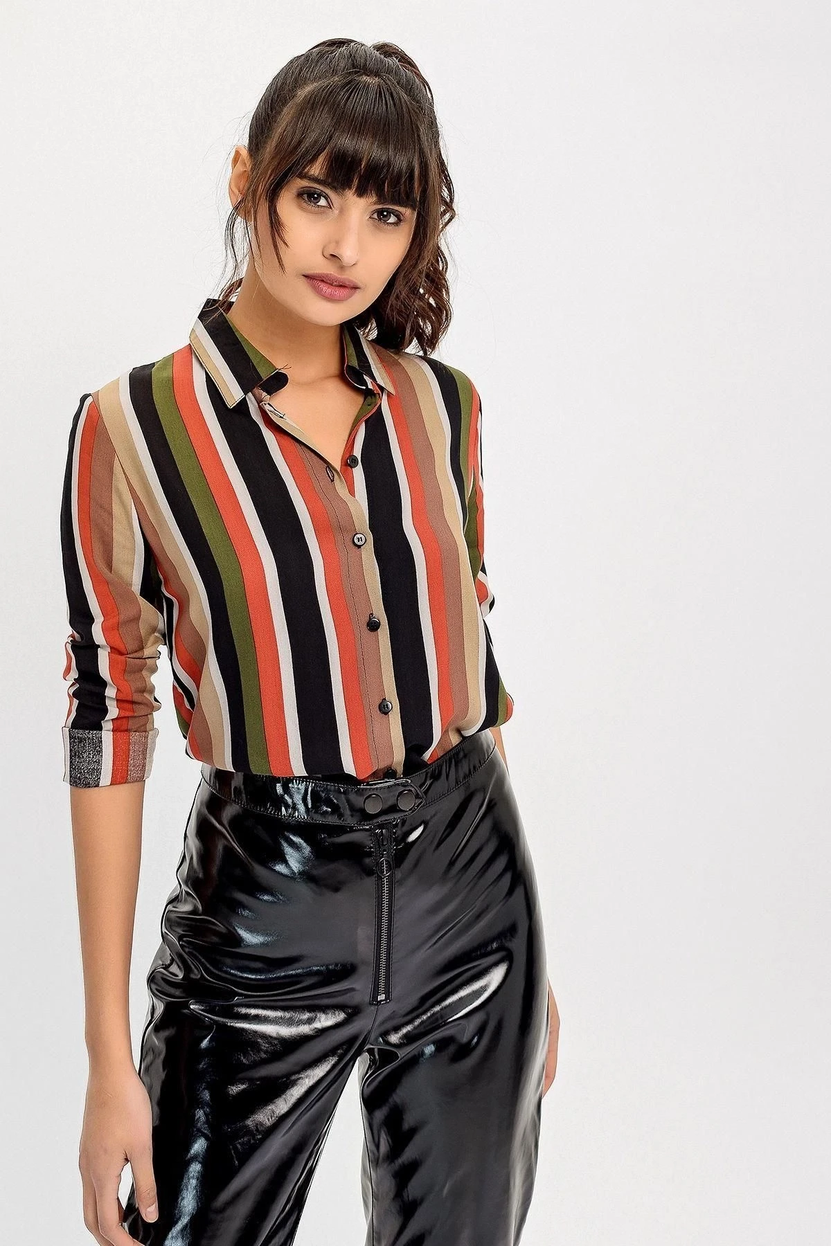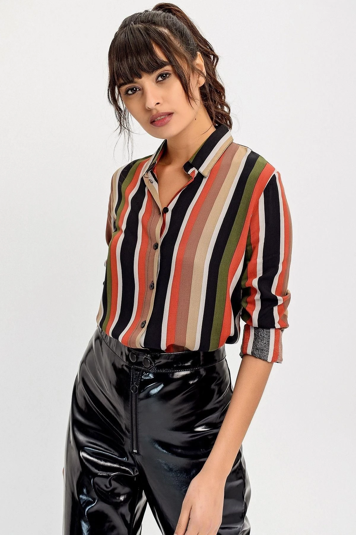 Kadın Çok Renkli Klasik Yaka Çizgili Uzun Kol Gömlek (REGULAR KESİM, STANDART BOY)