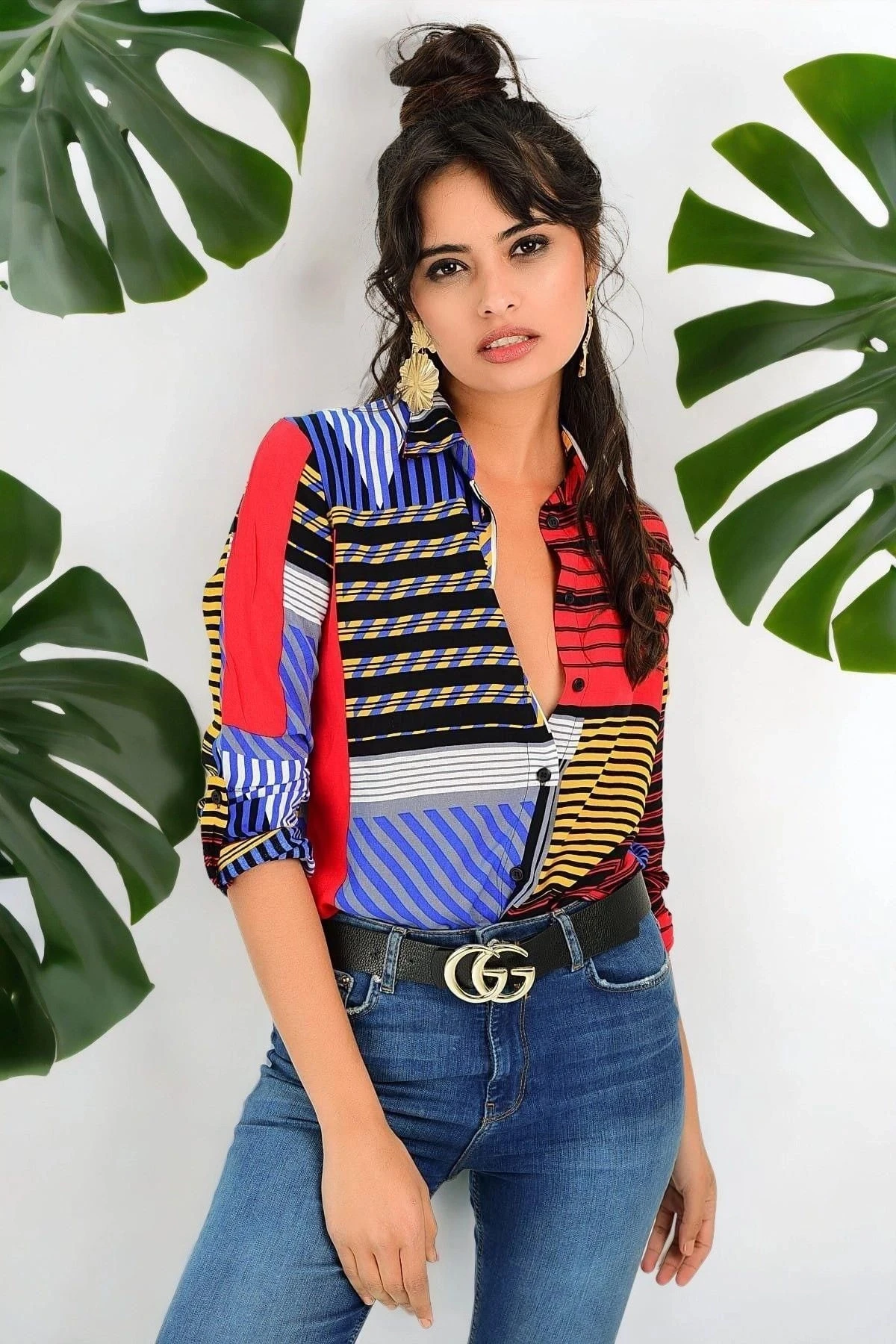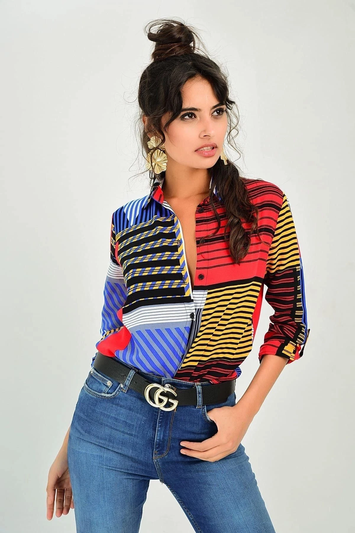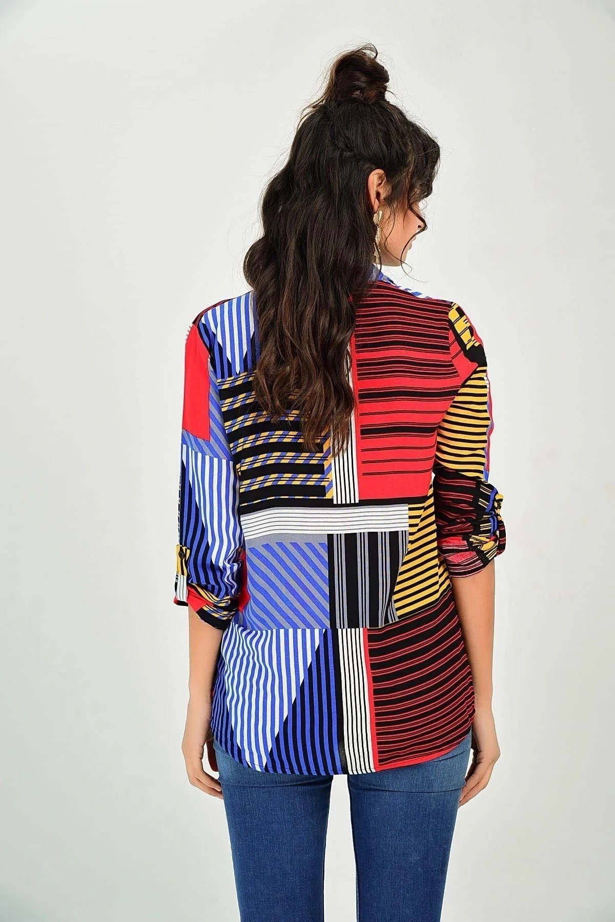 Kadın Çok Renkli Klasik Yaka, Grafik Desenli, Uzun Kol, Regular Kesim, Standart Boy Gömlek
