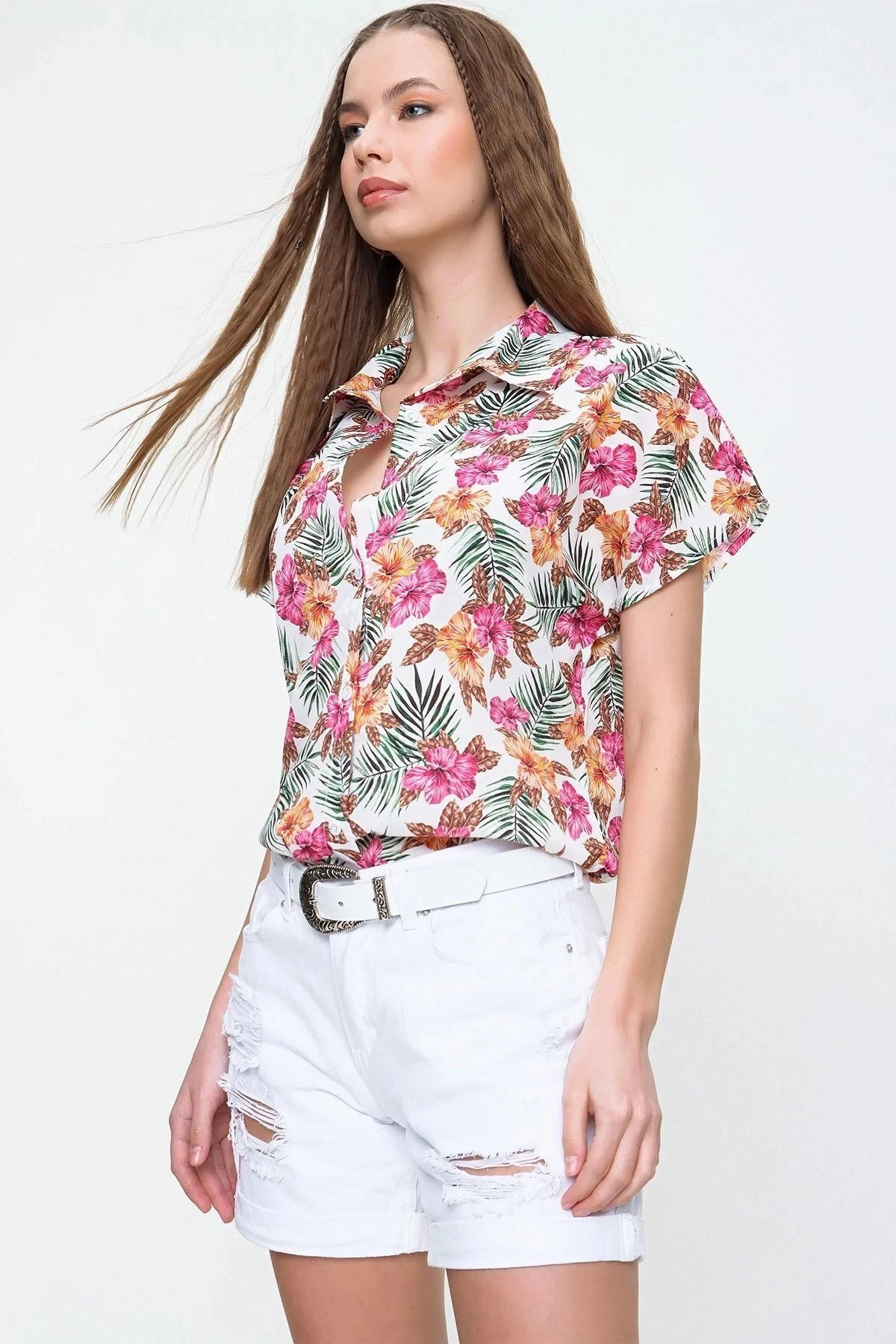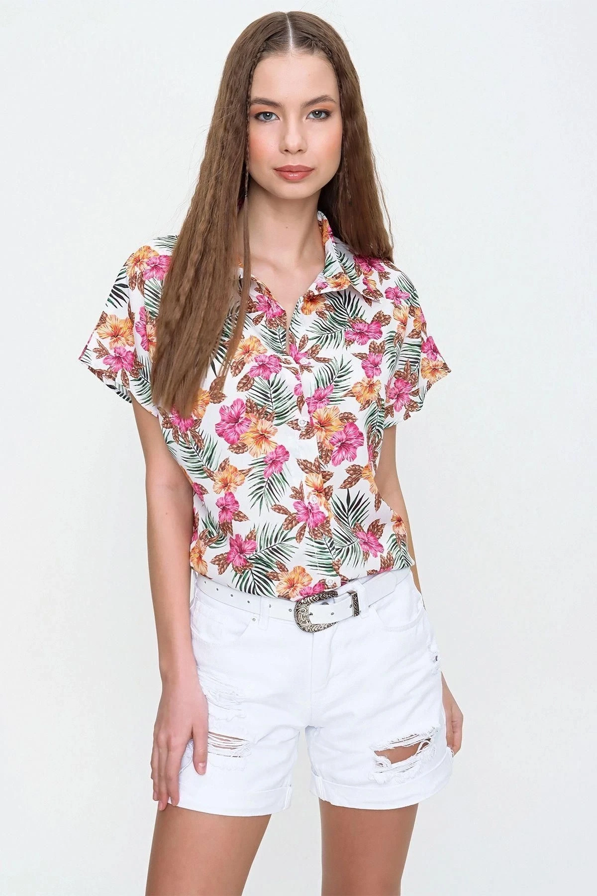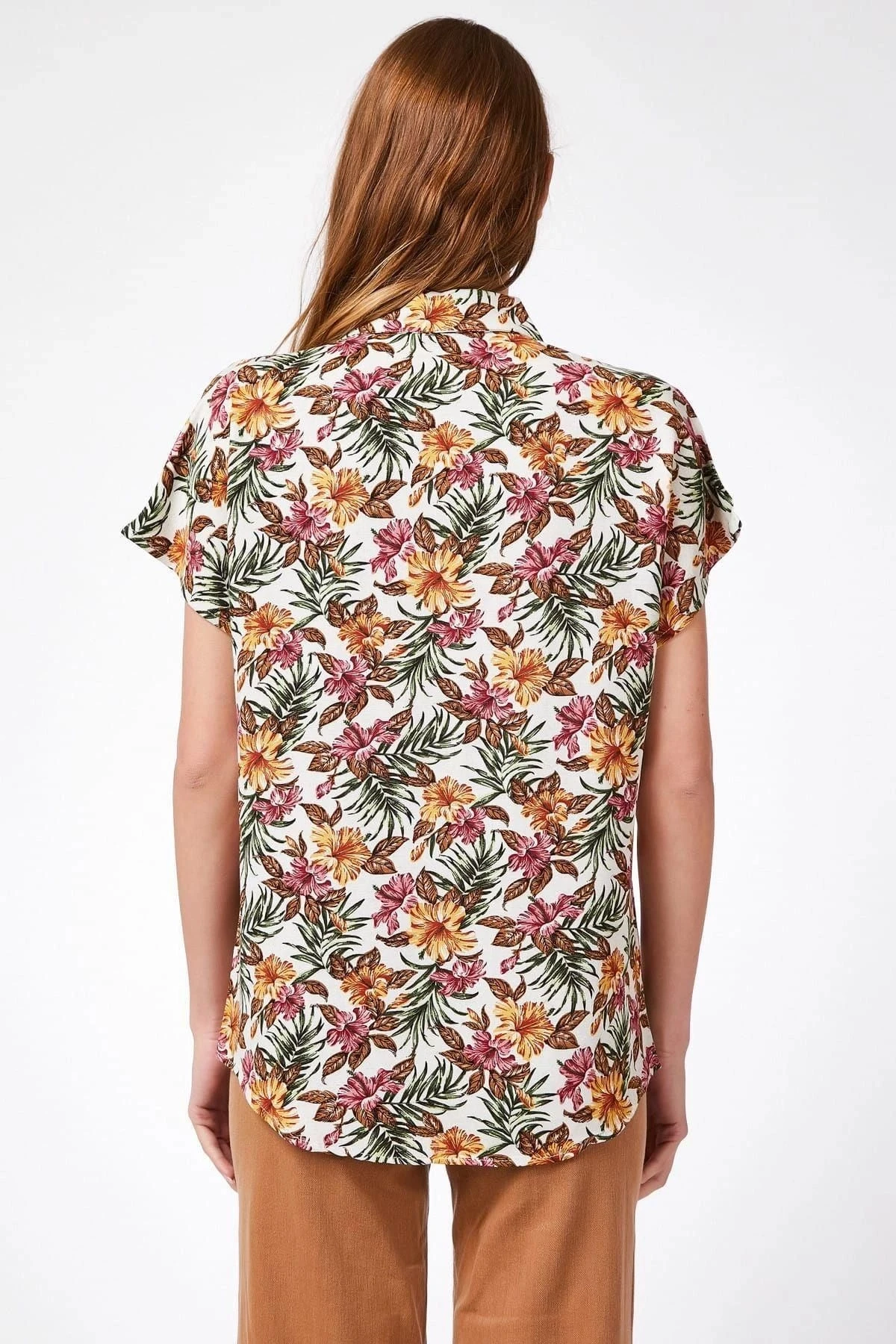 Kadın Çok Renkli Klasik Yaka Kısa Kol Çiçek Desenli Çok Renkli Regular Kesim Standart Boy Gömlek