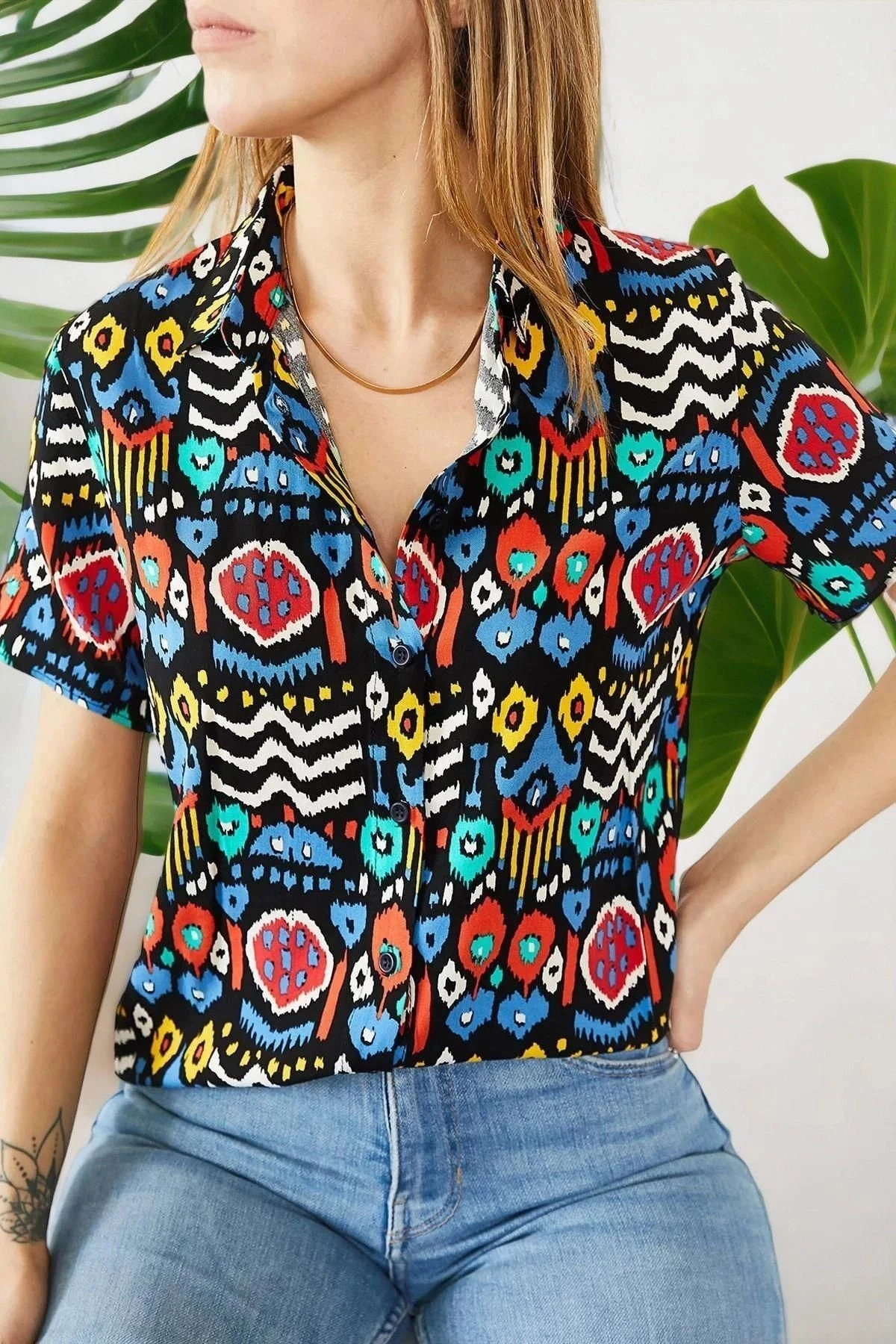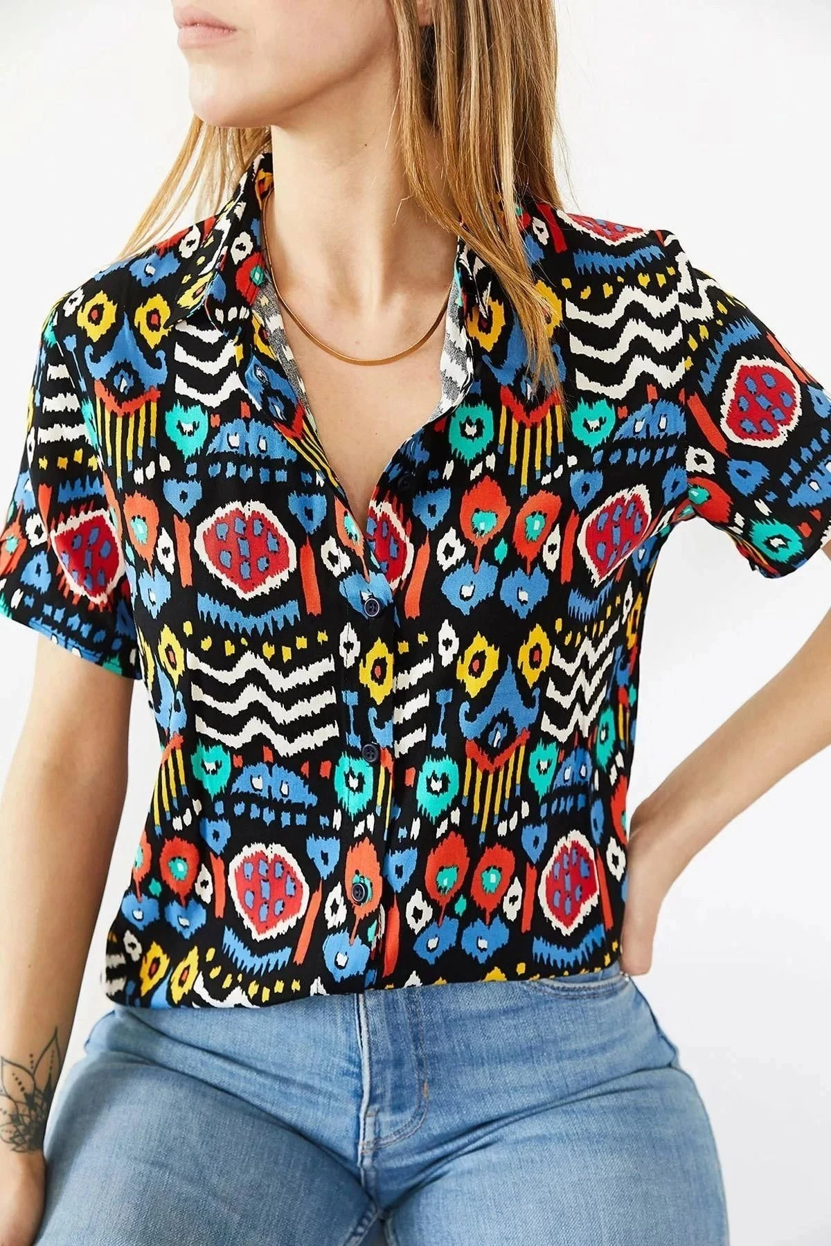 Kadın Çok Renkli Klasik Yaka Kısa Kol Etnik Desenli Regular Kesim Standart Boy Gömlek