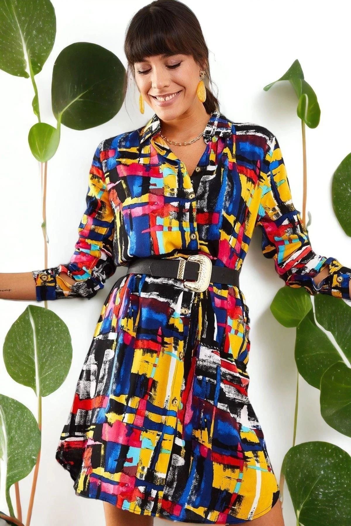 Kadın Çok Renkli Klasik Yakalı Uzun Kol Desenli Çok Renkli Regular Kesim Midi Boy Diz üstü Elbise