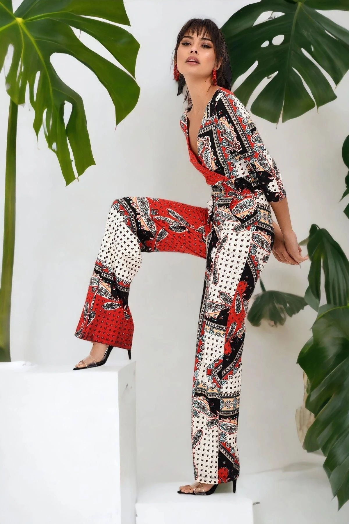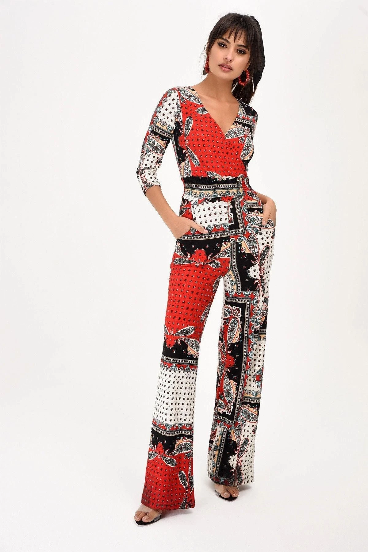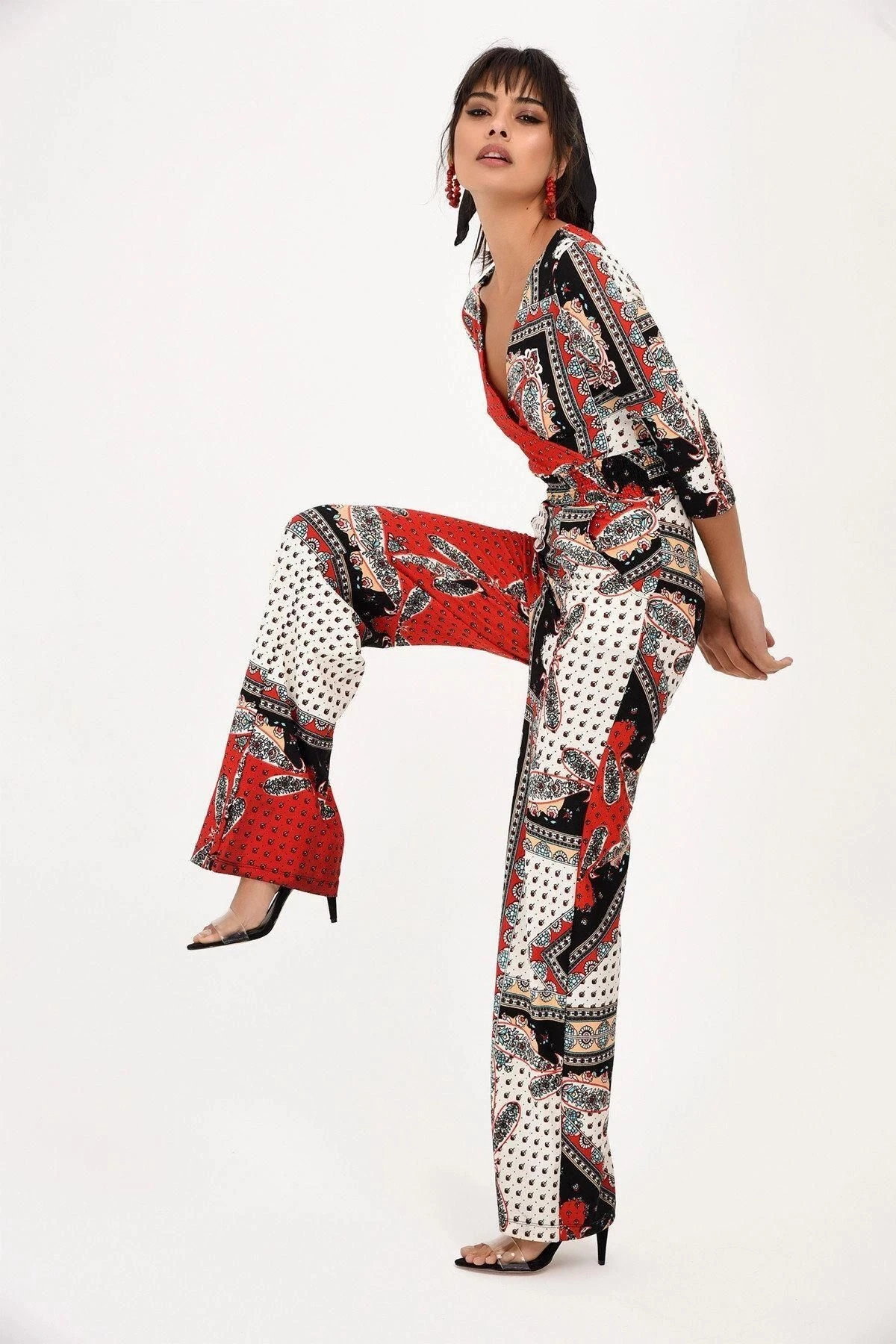 Kadın Çok Renkli Kruvaze Yaka, Truvakar Kol, Patchwork Desenli, Regular Kesim, Rahat Boy Tulum.
