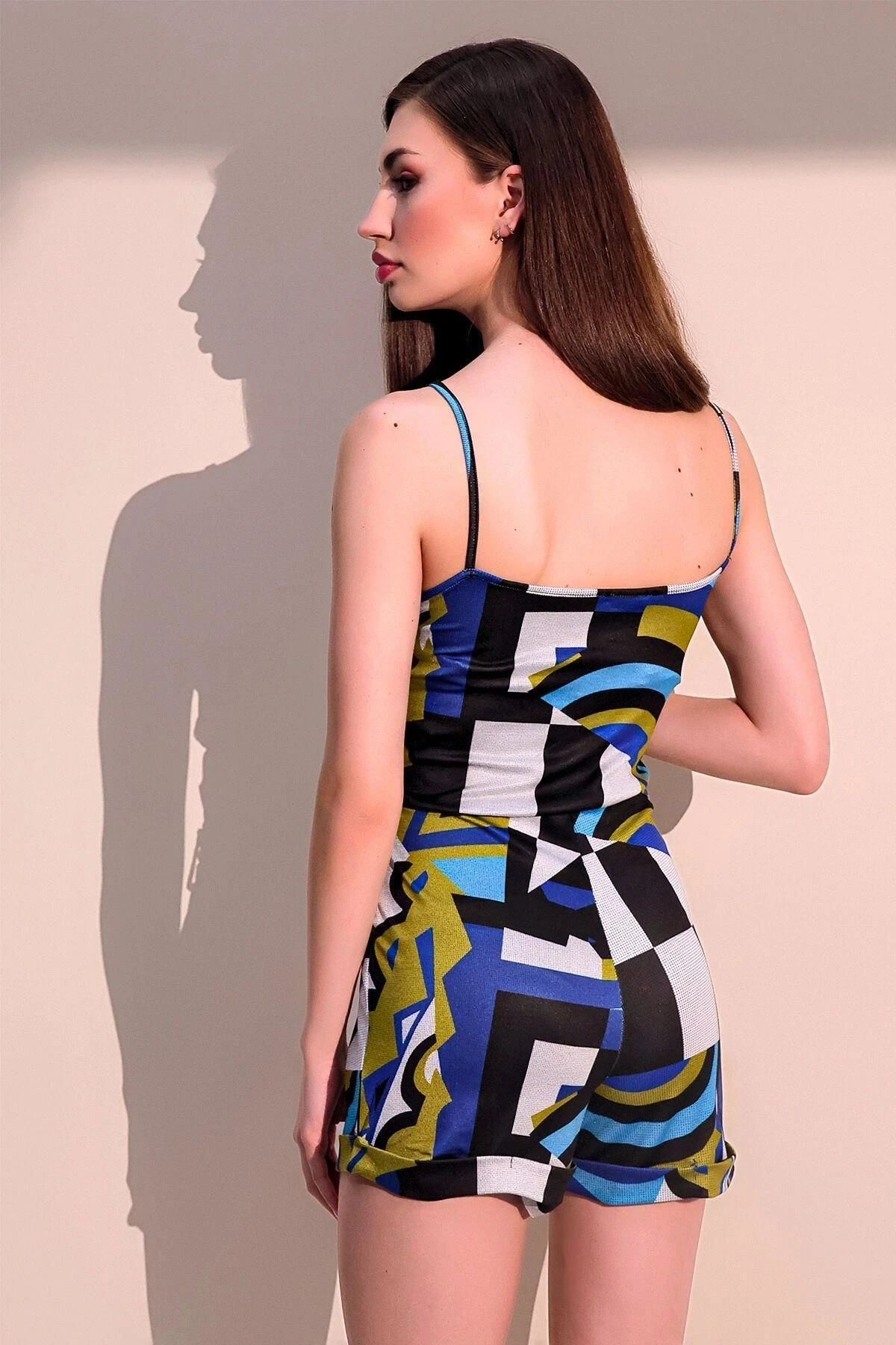 Bu modern ve şık tulum, çarpıcı geometrik desenleri ve canlı renkleriyle dikkat çekiyor.; Çok renkli bir tasarıma sahip olan bu tulum, yaz aylarında gardırobunuzun en sevilen parçası olacak.; Kumaş içeriği %95 polyester ve %5 elastan olan bu tulum, hem rahatlık hem de esneklik sağlar.; Polyester malzeme, dayanıklılığı ve kolay bakımıyla bilinirken, elastan ise kıyafetin hareket özgürlüğünü artırır.; Askılı tasarımıyla serinletici bir etki yaratan bu tulum, yaz stilinize modern bir dokunuş katıyor.; Cep detayları, pratiklik sunarken, duble paça kesimi ise şıklığı tamamlıyor.; Geometrik desenleriyle tarzınızı ön plana çıkaran bu tulum, herhangi bir kıyafete enerji ve renk katmak için mükemmel bir seçim.; Yazlık aktivitelerde, arkadaş buluşmalarında veya günlük gezintilerde rahatlıkla giyebileceğiniz bu tulum, size tarz ve şıklık sunacak.; Bu renkli ve modern geometrik baskılı tulum, gardırobunuzun canlı ve eğlenceli parçası olacak.; Kumaş kalitesi, tasarımı ve renkleriyle sizi cezbedecek olan bu tulumu kaçırmayın!