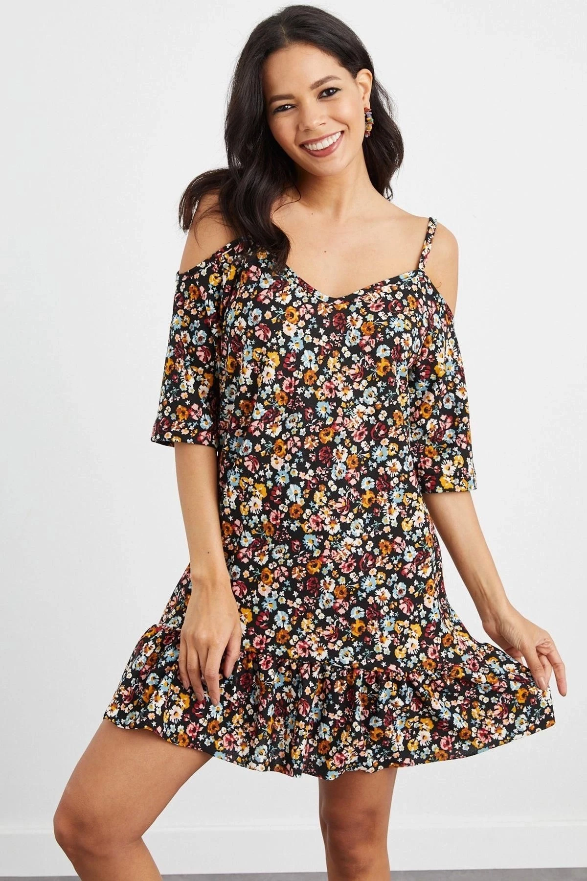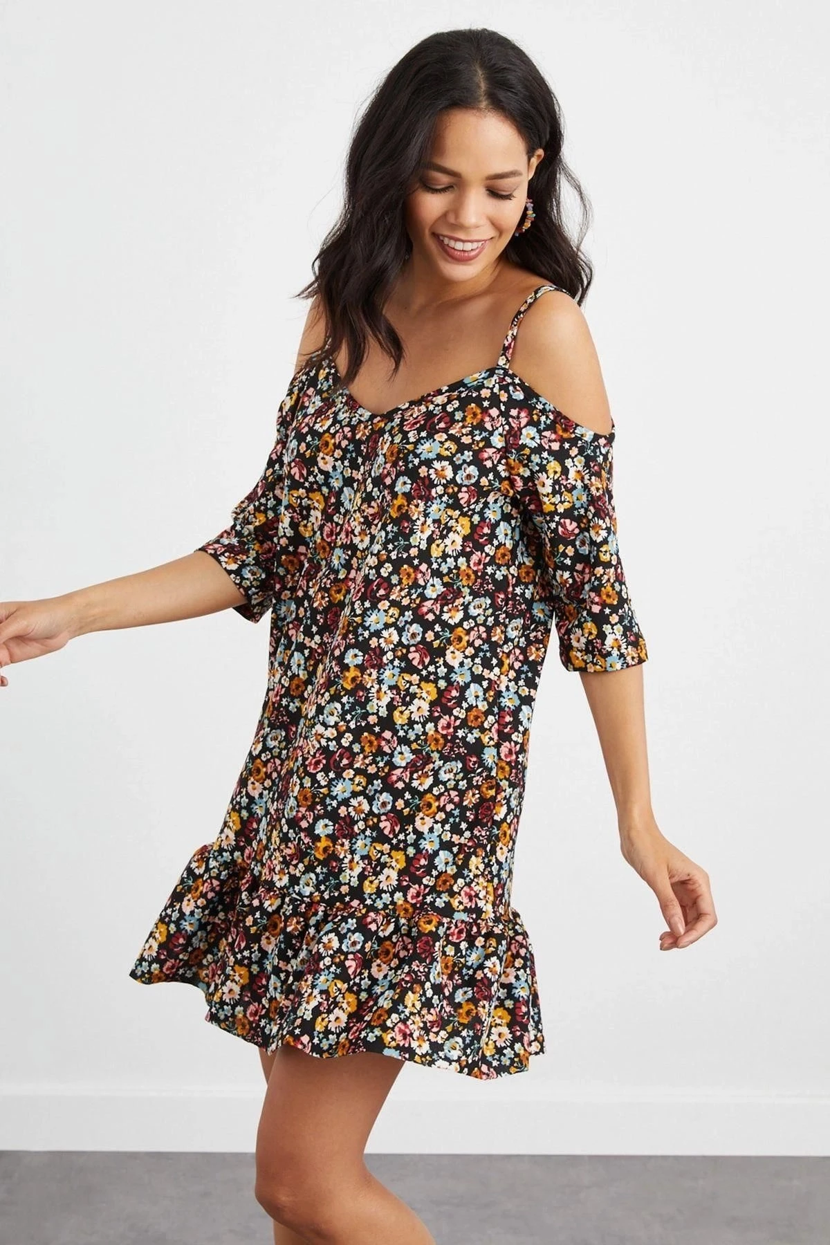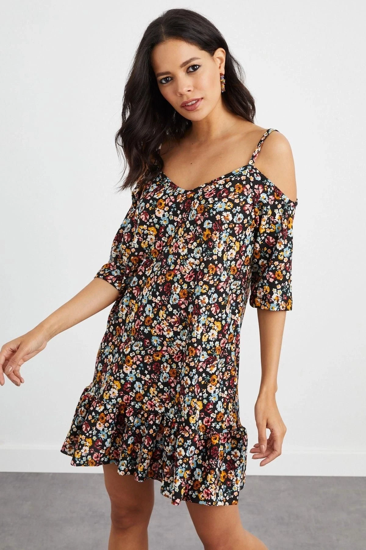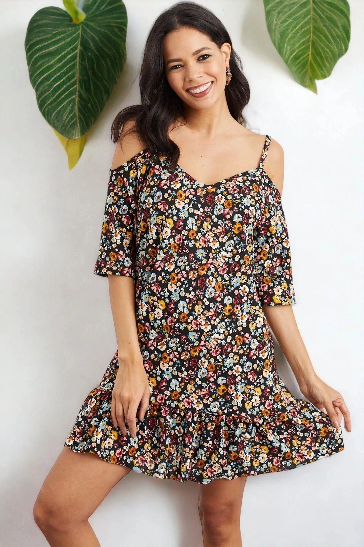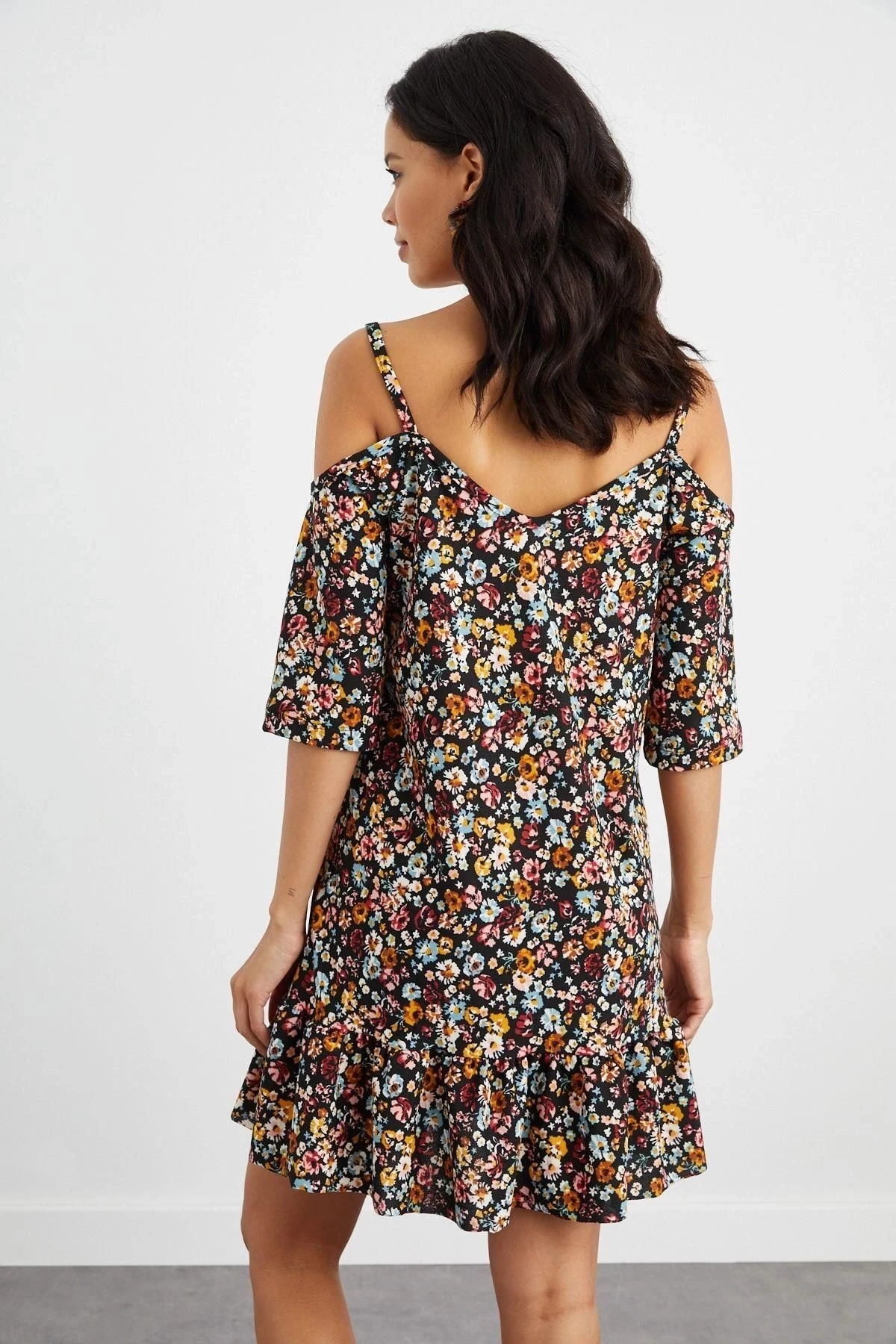 Kadın Çok Renkli V Yaka Askılı Fırfır Detaylı Çiçek Desenli Kaliteli Kumaş A Kesim Mini Kısa Elbise